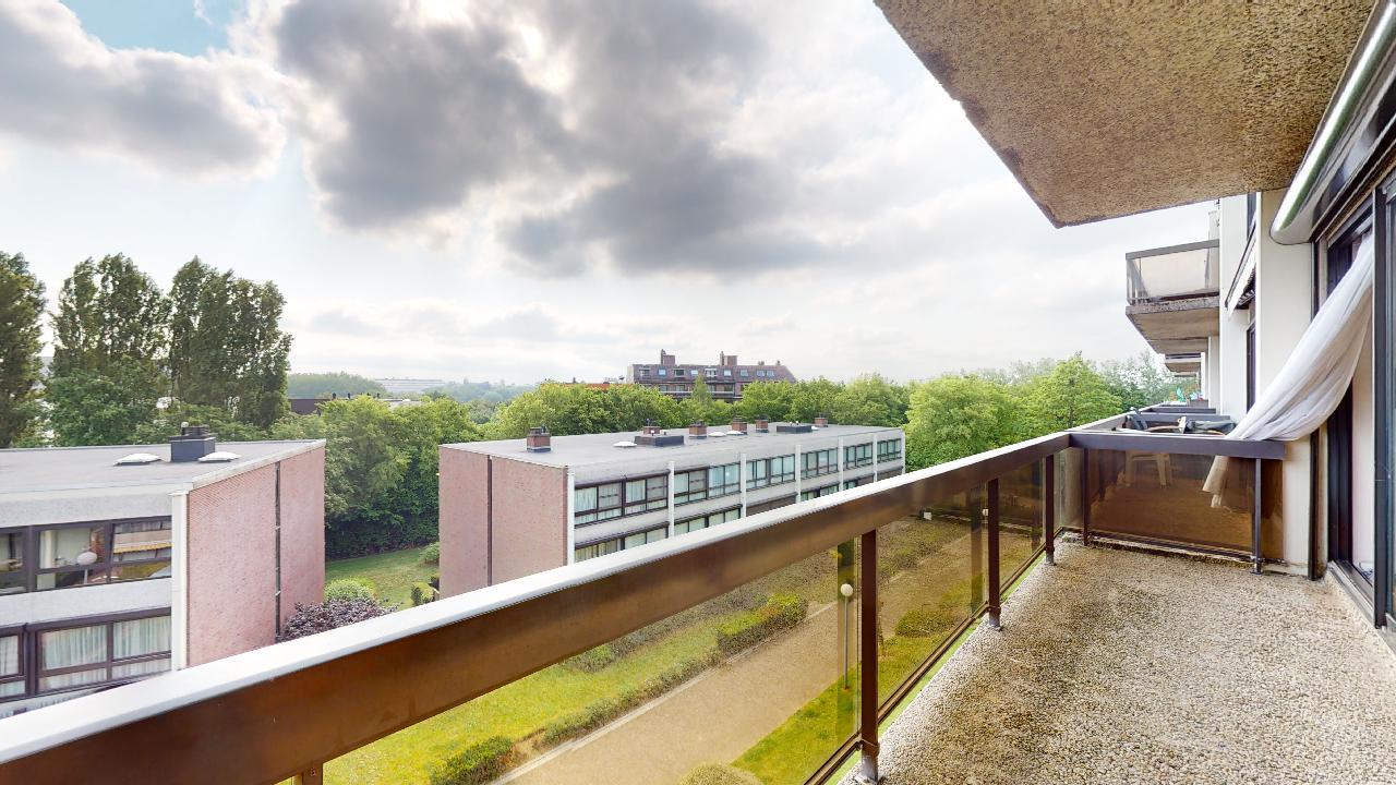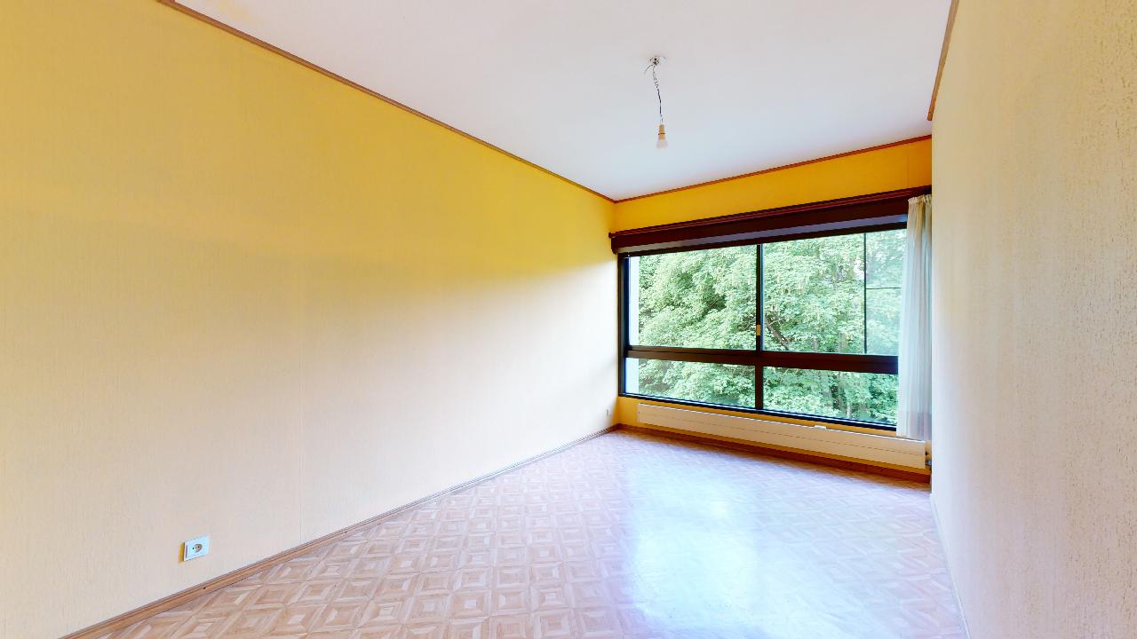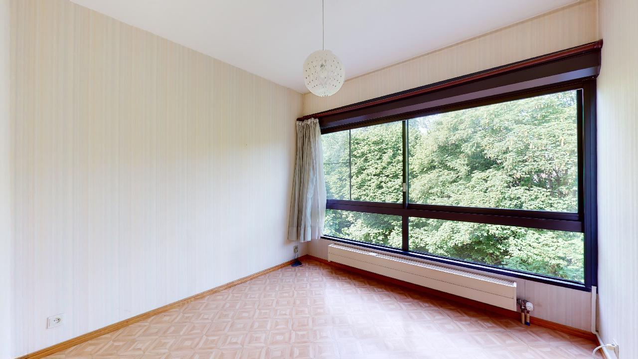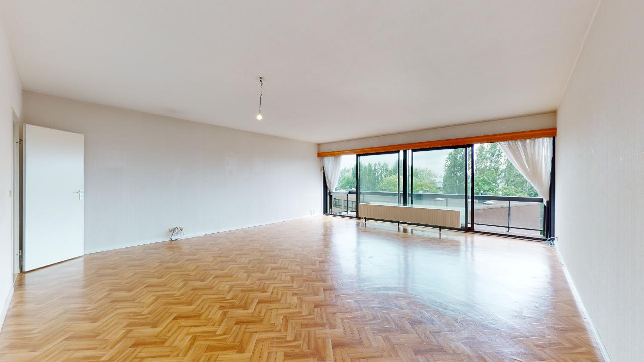 Spacieux appartement traversant de 134 m² avec hall d'entrée de 5 m², spacieux living de 42 m² avec grandes baies vitrées dont 2 coulissantes équipées de volets électriques donnant sur la belle terrasse de 9m² (orientée Est/Sud-Est), cuisine attenante super-équipée de 6 m² avec fenêtre latérale. Hall de nuit de 2,8 m² permettant d'accéder aux 4 chambres de 14,3 - 13 - 13,5 et 10,4 m², toutes orientées ouest, grandes fenêtres doubles-vitrages coulissantes équipées de volets électriques et de moustiquaires. Le petit couloir reliant les chambres 3 et 4 offrent de grands placards de rangement. Une cave de 6m² est disponible en option ainsi qu'un garage fermé (35.000 €). Bon état général mais avec nombreux matériaux d'origine à l'exception de la salle de bain où la baignoire a été remplacée par une 'douche à l'italienne'. Un WC séparé. Malgré les années, les différents revêtements de sol sont en bon état d'entretien mais à rafraîchir. La cuisine est aussi d'origine à l'exception des électro-ménagers (taques, four et lave-vaisslle plus récents). Les peintures murs et plafonds sont plus récentes. Immeuble disposant depuis 2019 d'une nouvelle installation de chauffage à cogénération, économique en énergie.