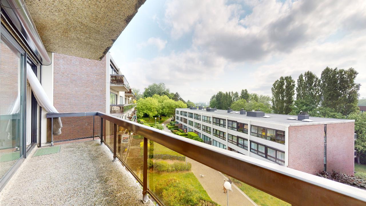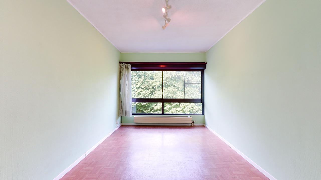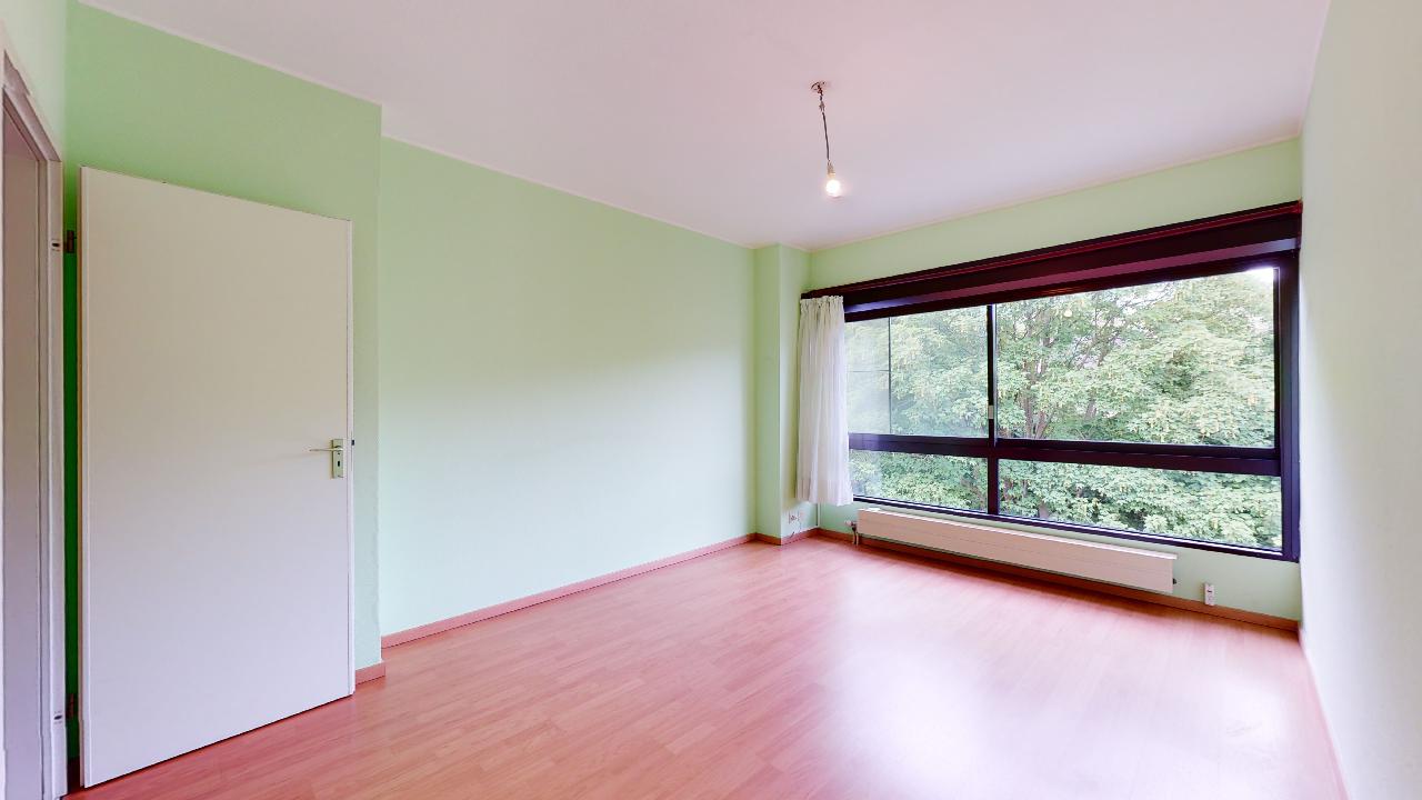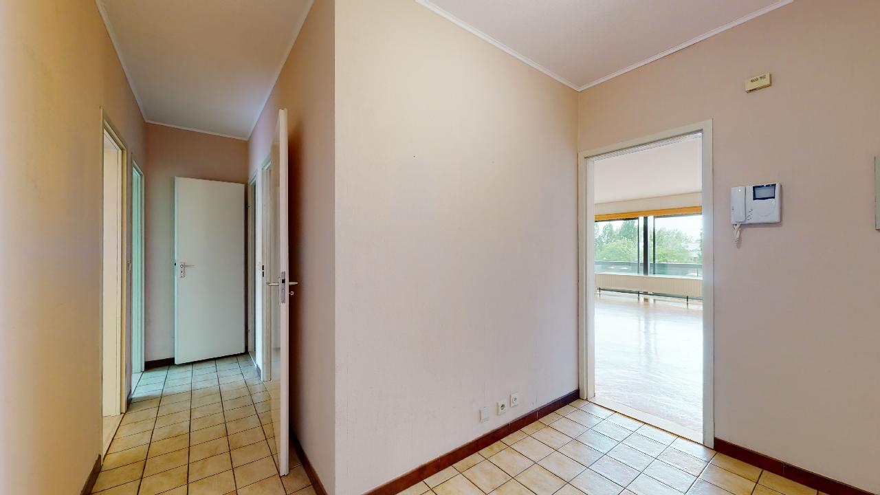 Spacieux appartement traversant de 134 m² avec hall d'entrée de 5 m², spacieux living de 42 m² avec grandes baies vitrées dont 2 coulissantes équipées de volets électriques donnant sur la belle terrasse de 9m² (orientée Est/Sud-Est), cuisine attenante super-équipée de 6 m² avec fenêtre latérale. Hall de nuit de 2,8 m² permettant d'accéder aux 4 chambres de 14,3 - 13 - 13,5 et 10,4 m², toutes orientées ouest, grandes fenêtres doubles-vitrages coulissantes équipées de volets électriques et de moustiquaires. Le petit couloir reliant les chambres 3 et 4 offrent de grands placards de rangement. Une cave de 6m² est disponible en option ainsi qu'un garage fermé (35.000 €). Bon état général mais avec nombreux matériaux d'origine à l'exception de la salle de bain où la baignoire a été remplacée par une 'douche à l'italienne'. Un WC séparé. Malgré les années, les différents revêtements de sol sont en bon état d'entretien mais à rafraîchir. La cuisine est aussi d'origine à l'exception des électro-ménagers (taques, four et lave-vaisslle plus récents). Les peintures murs et plafonds sont plus récentes. Immeuble disposant depuis 2019 d'une nouvelle installation de chauffage à cogénération, économique en énergie.