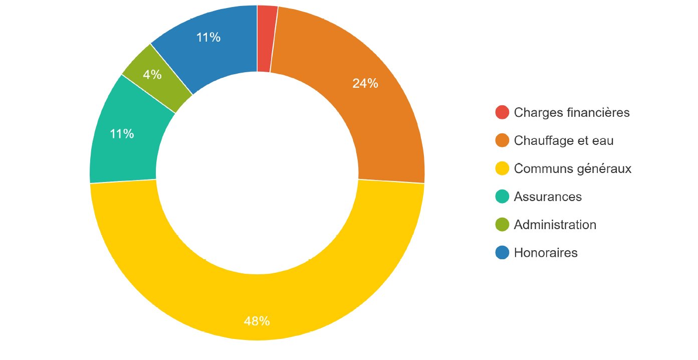 Ce tableau des charges comprend : Communs généraux – Chauffage et eau– Honoraires - Administration – Assurances et Charges financières