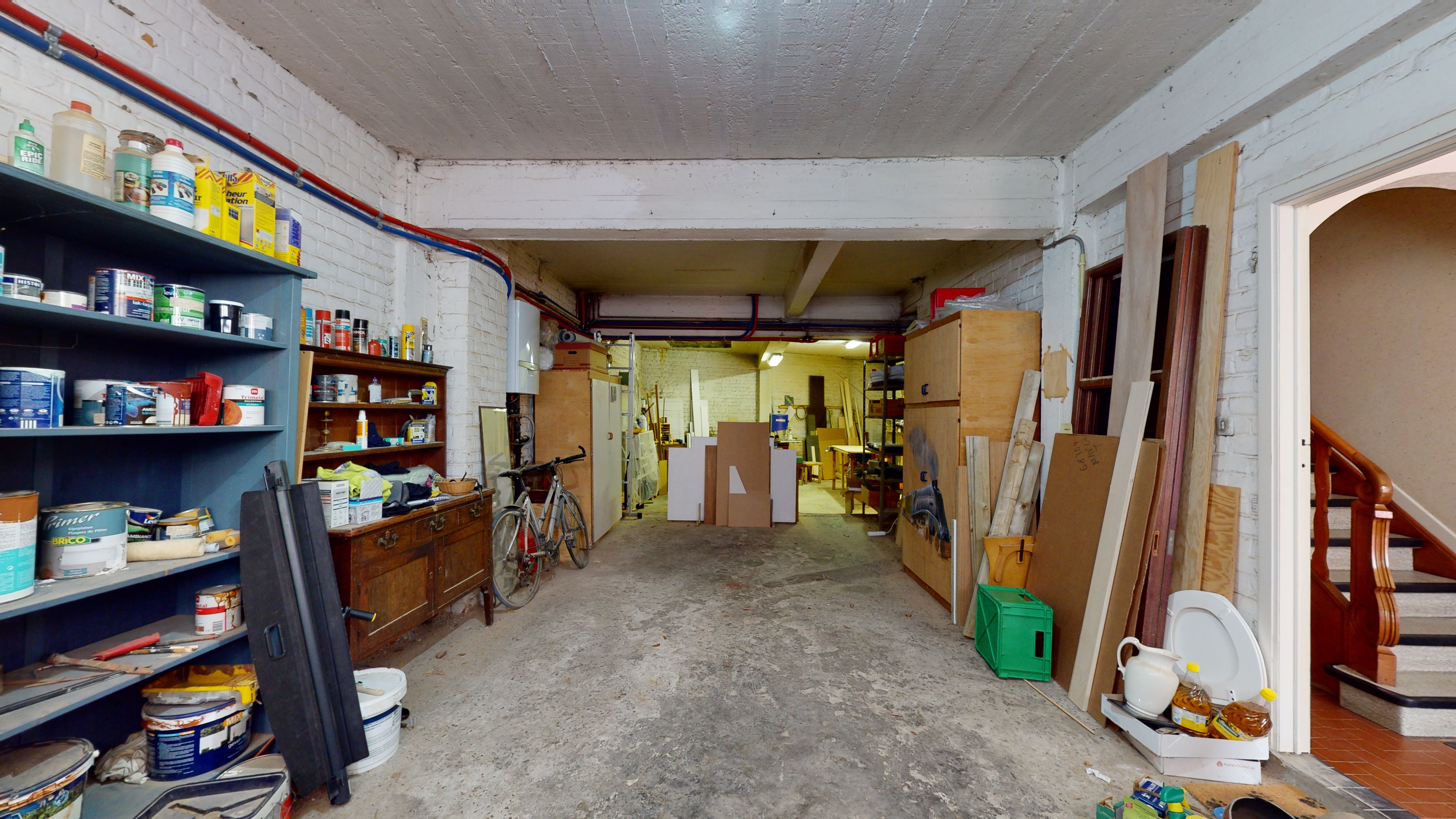 au rez-de-chaussée, grand garage 3 voitures +/- 65m2, pouvant servir également d'atelier.