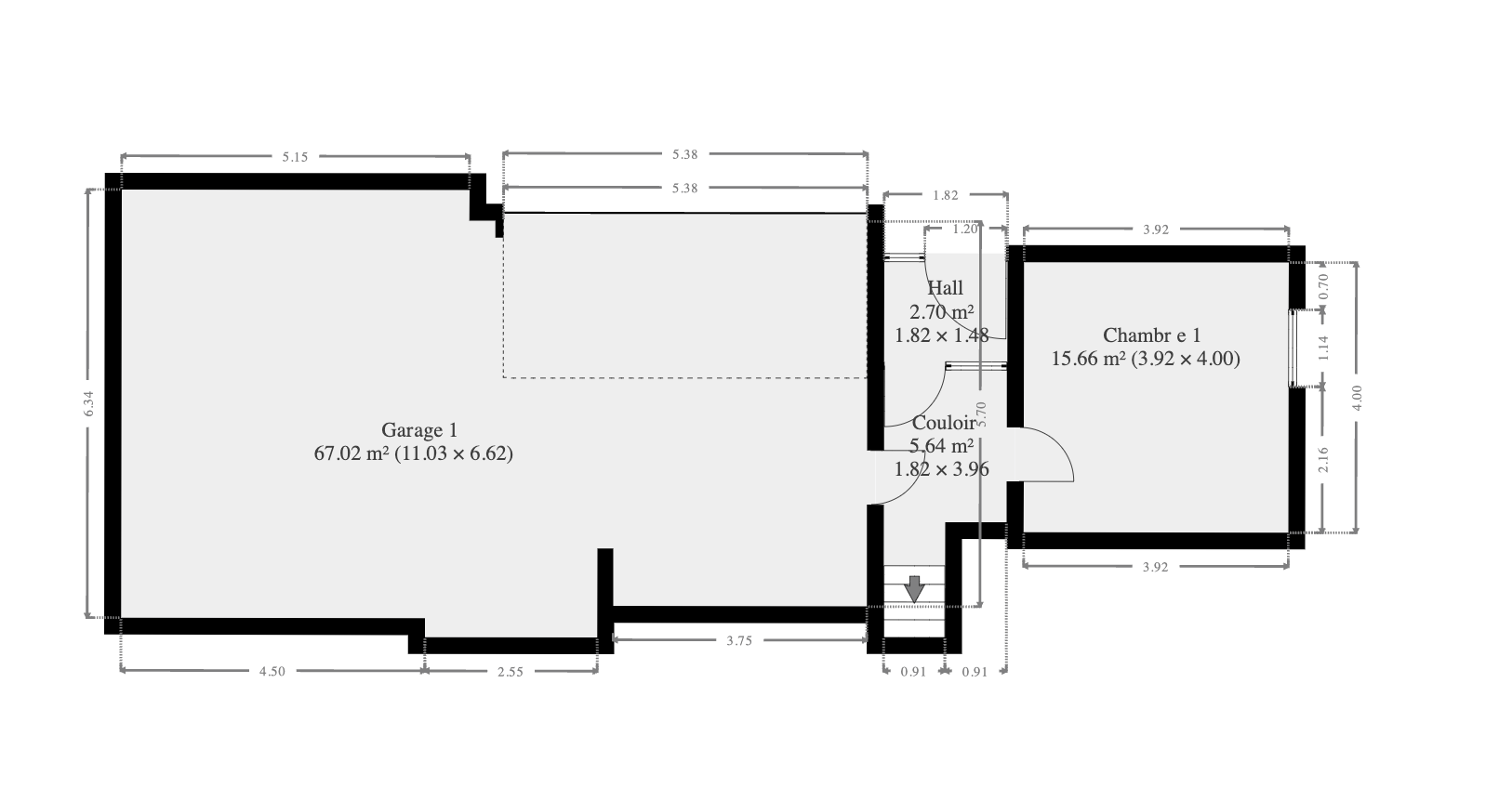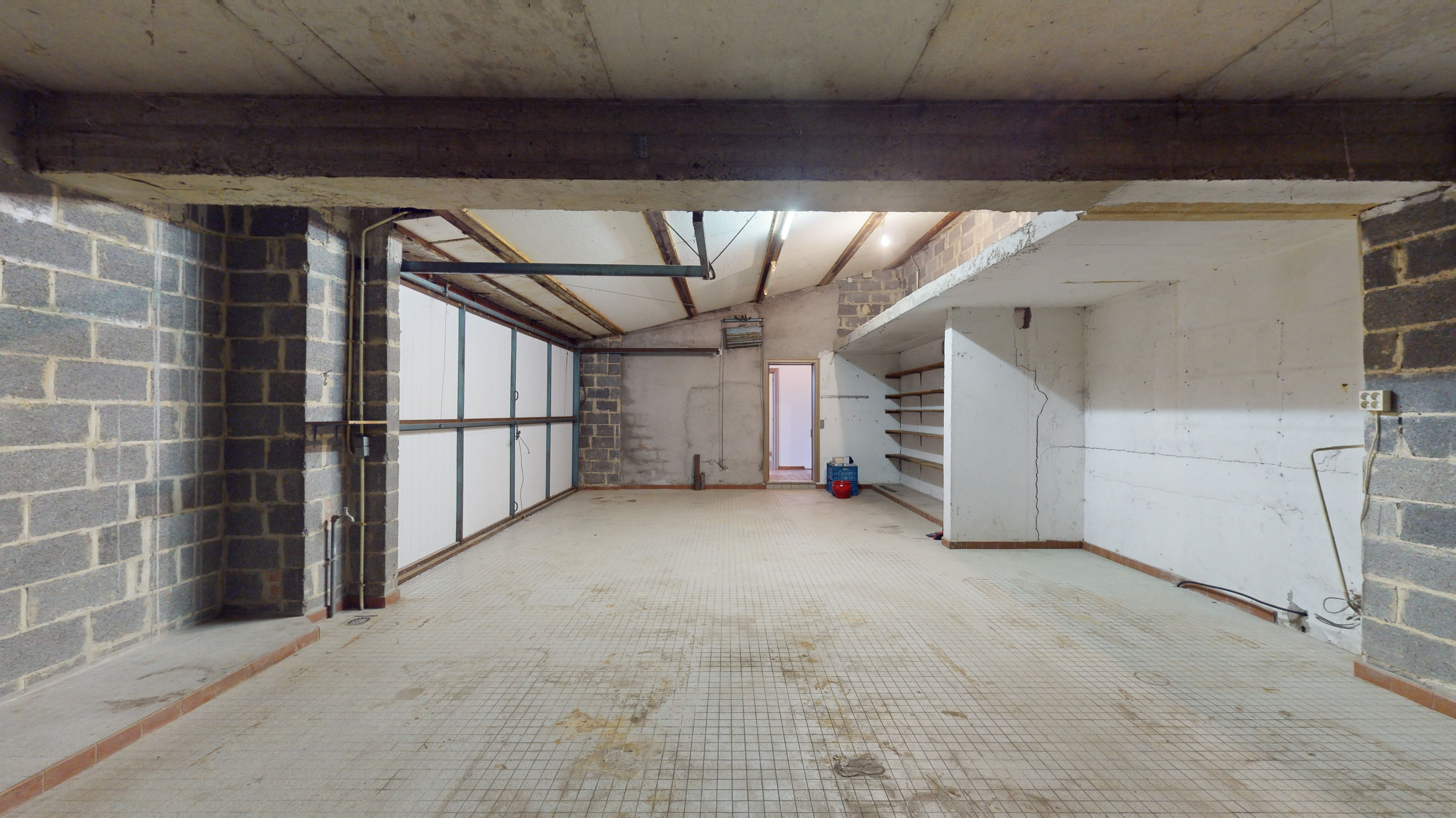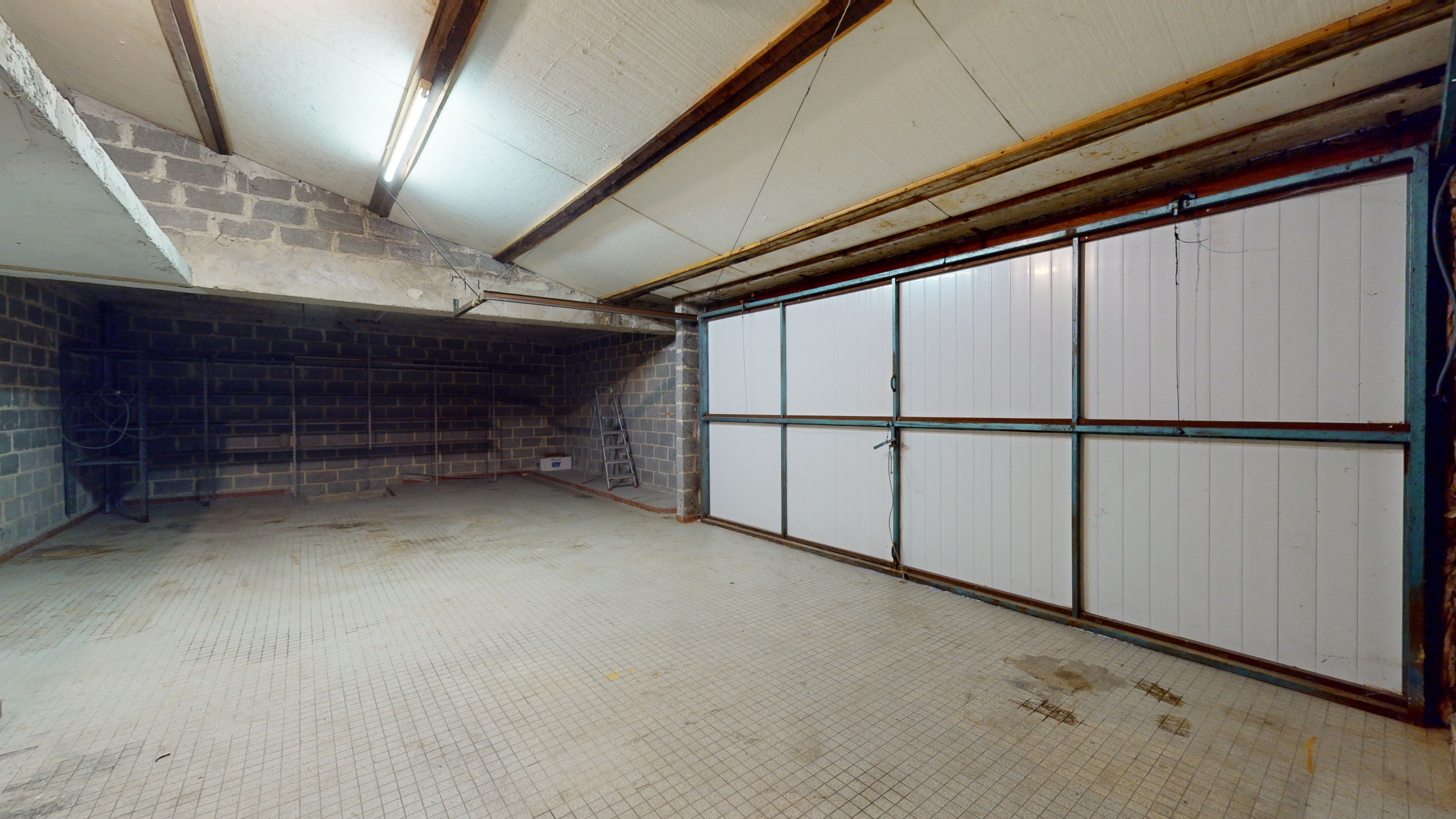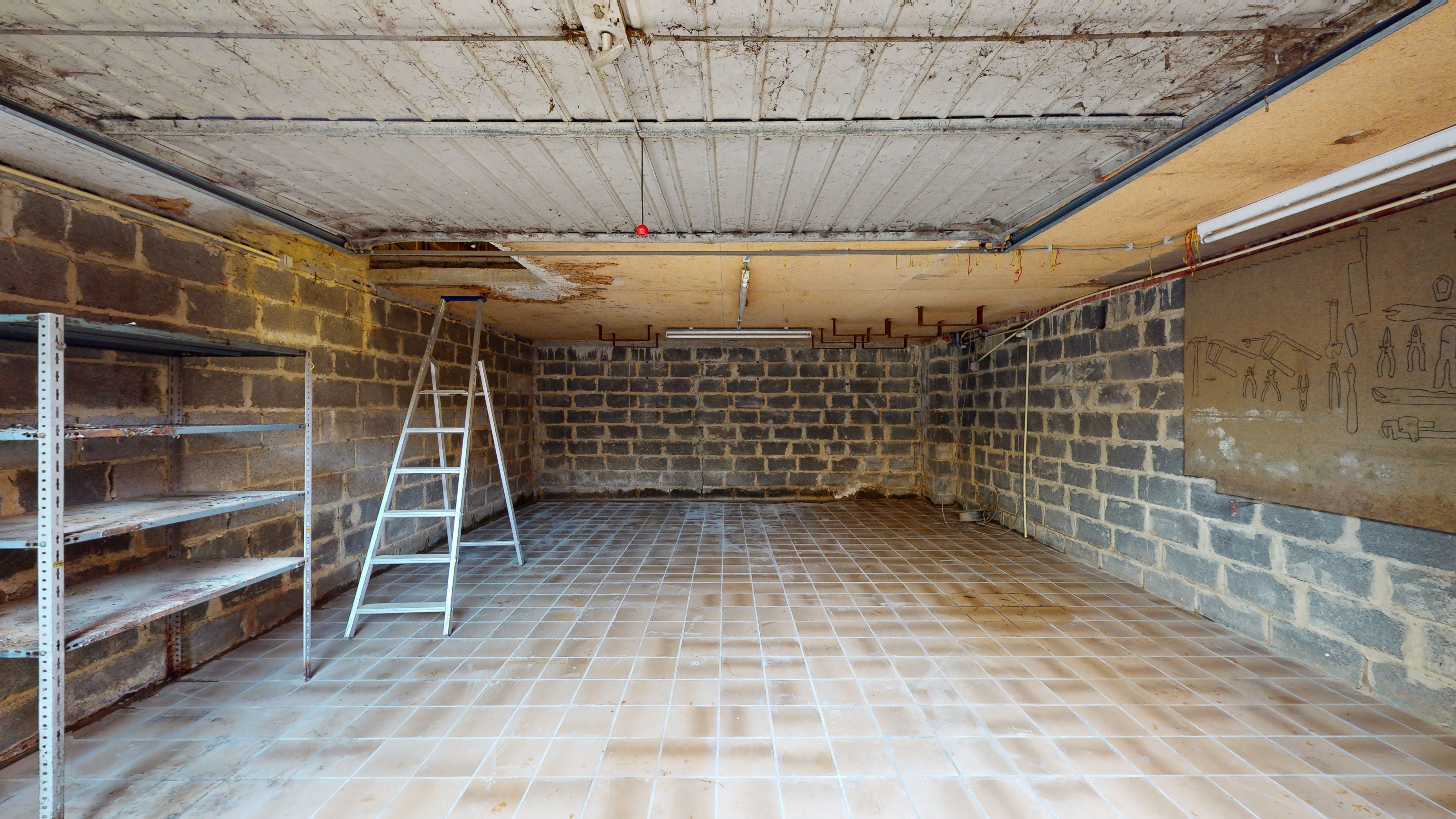 Rez-de-chaussée : hall d'entrée donnant accès d'une part à une chambre et d'autre part un grand garage 2 voitures de +/- 30m2.