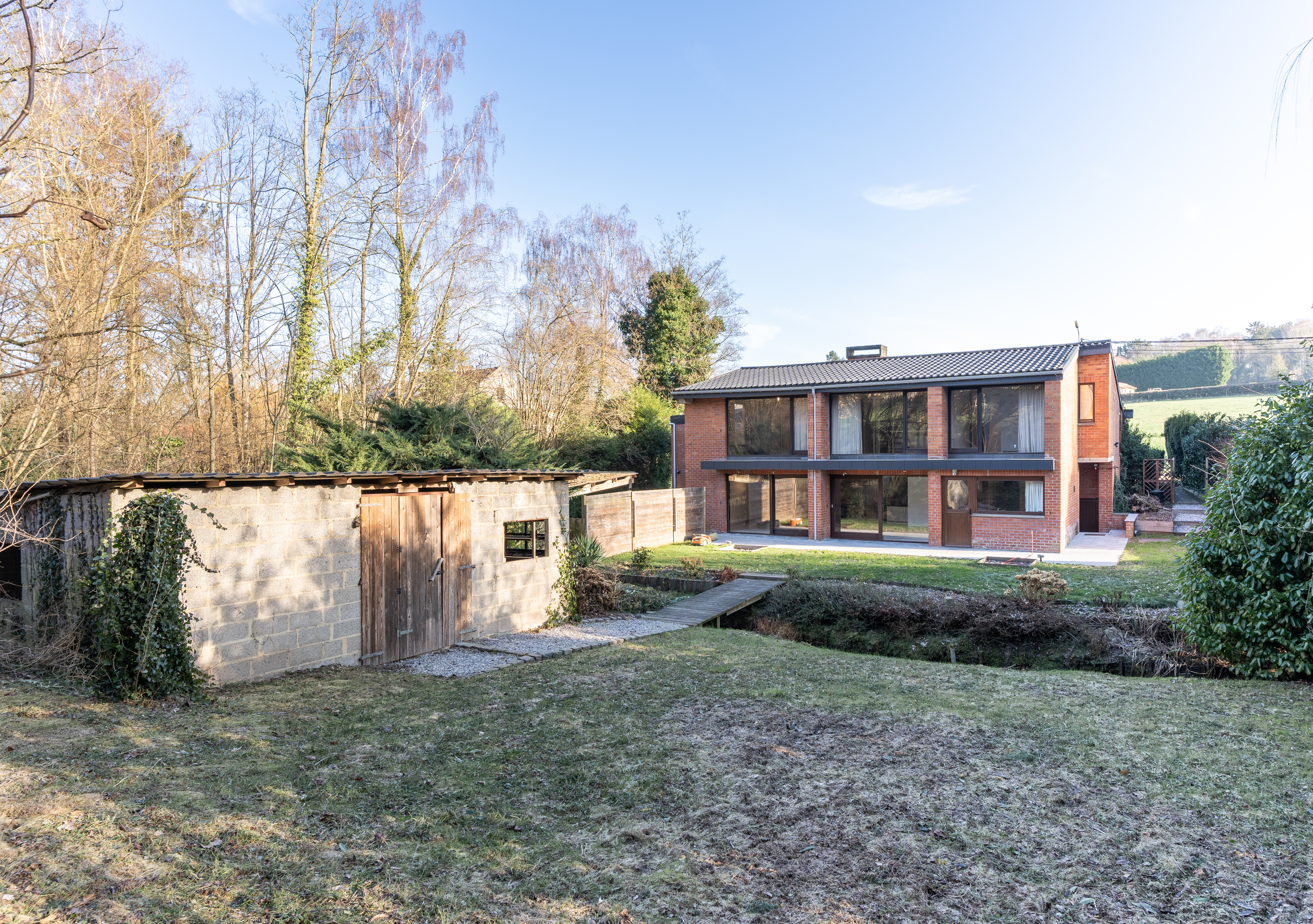 En demi niveau inférieur, le rez-de-jardin avec un WC séparé et un petit vestiaire, une cuisine équipée, un grand séjour de +/- 41m2 s'ouvrant sur une terrasse et un grand jardin orienté au Sud-Ouest traversé par une petite rivière.