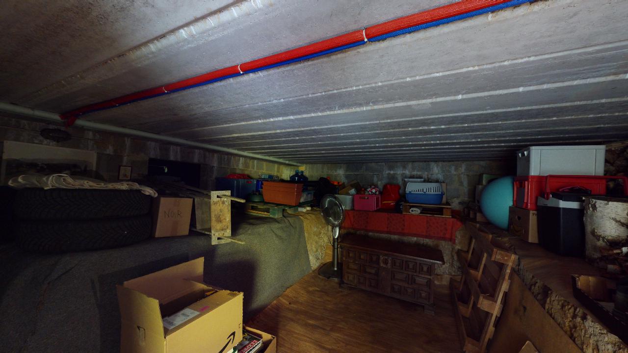 Une fenêtre et la porte de garage assure la ventilation, sur la droite le bâtiment se trouve sur un vide ventilé - accessible depuis l'espace cave - dont les grilles de ventilation sont visible en soubassement.
