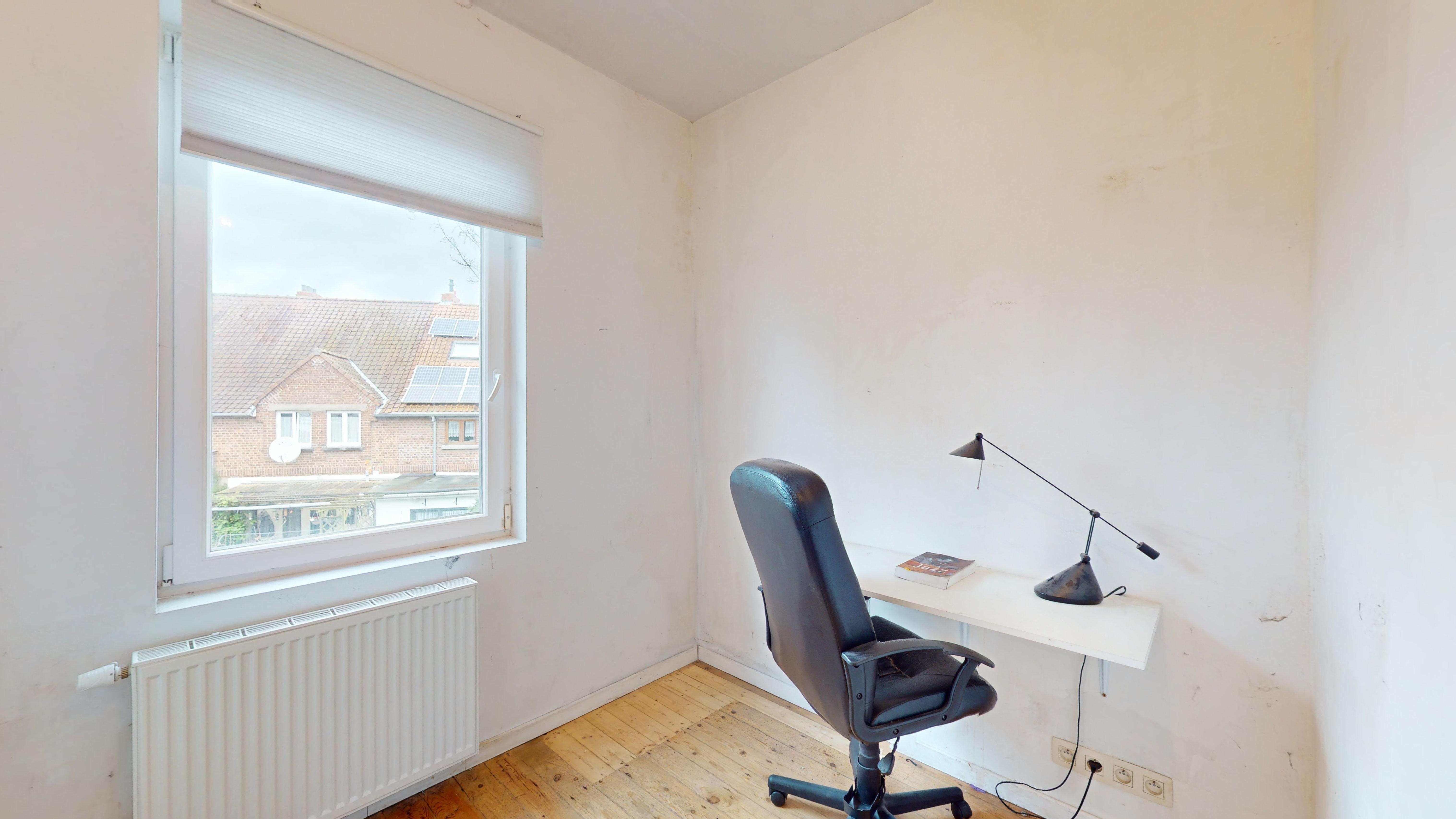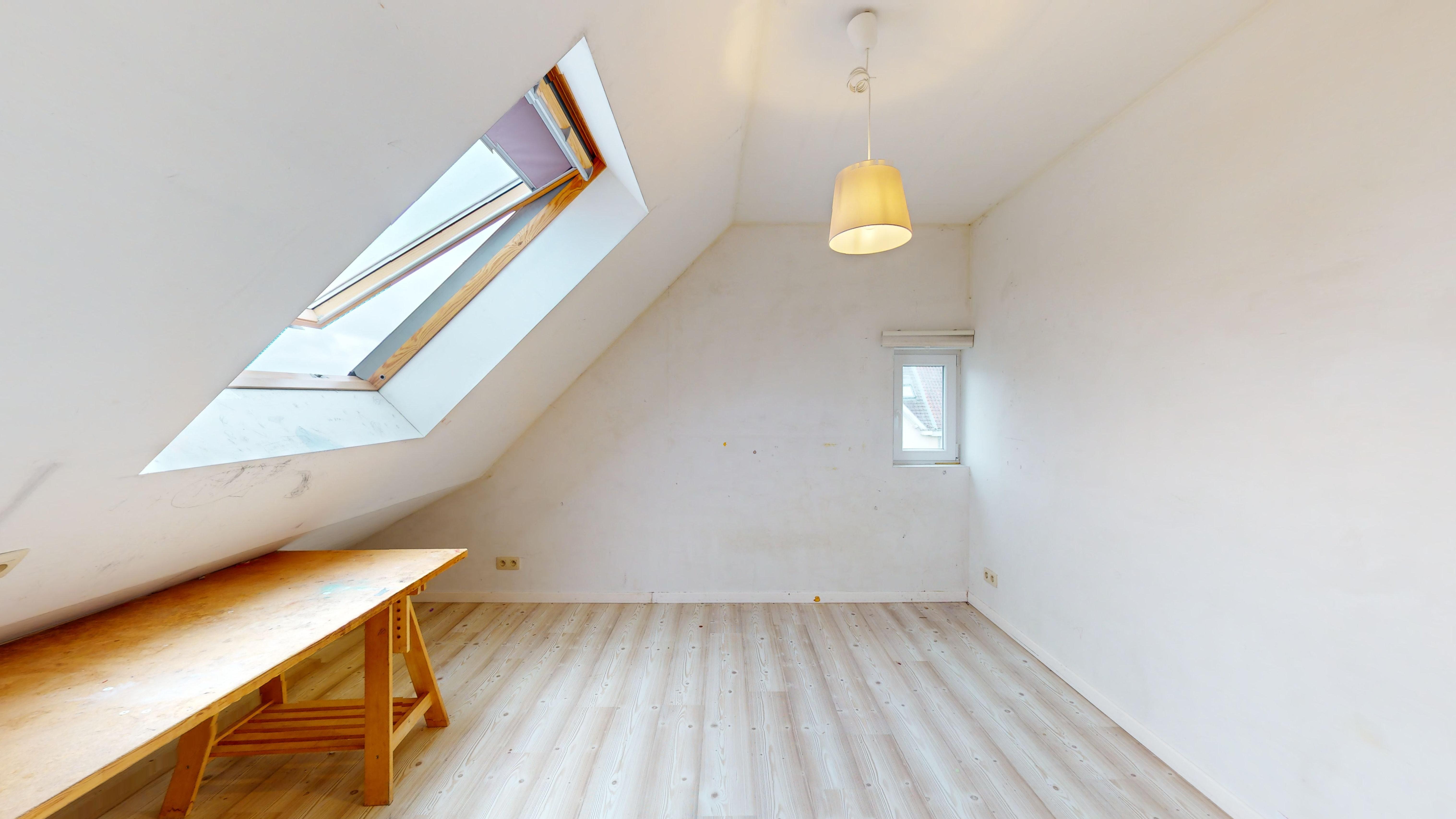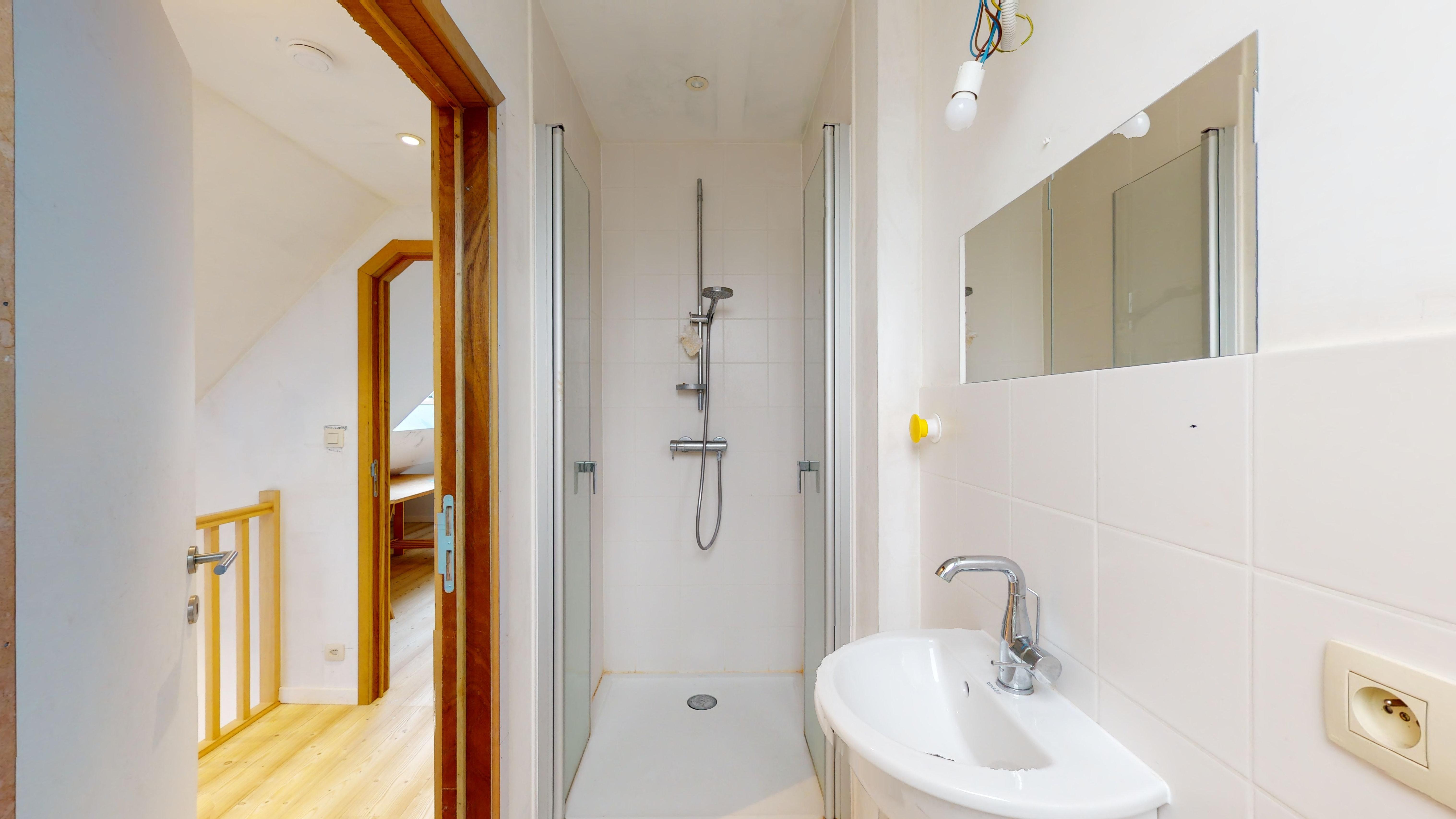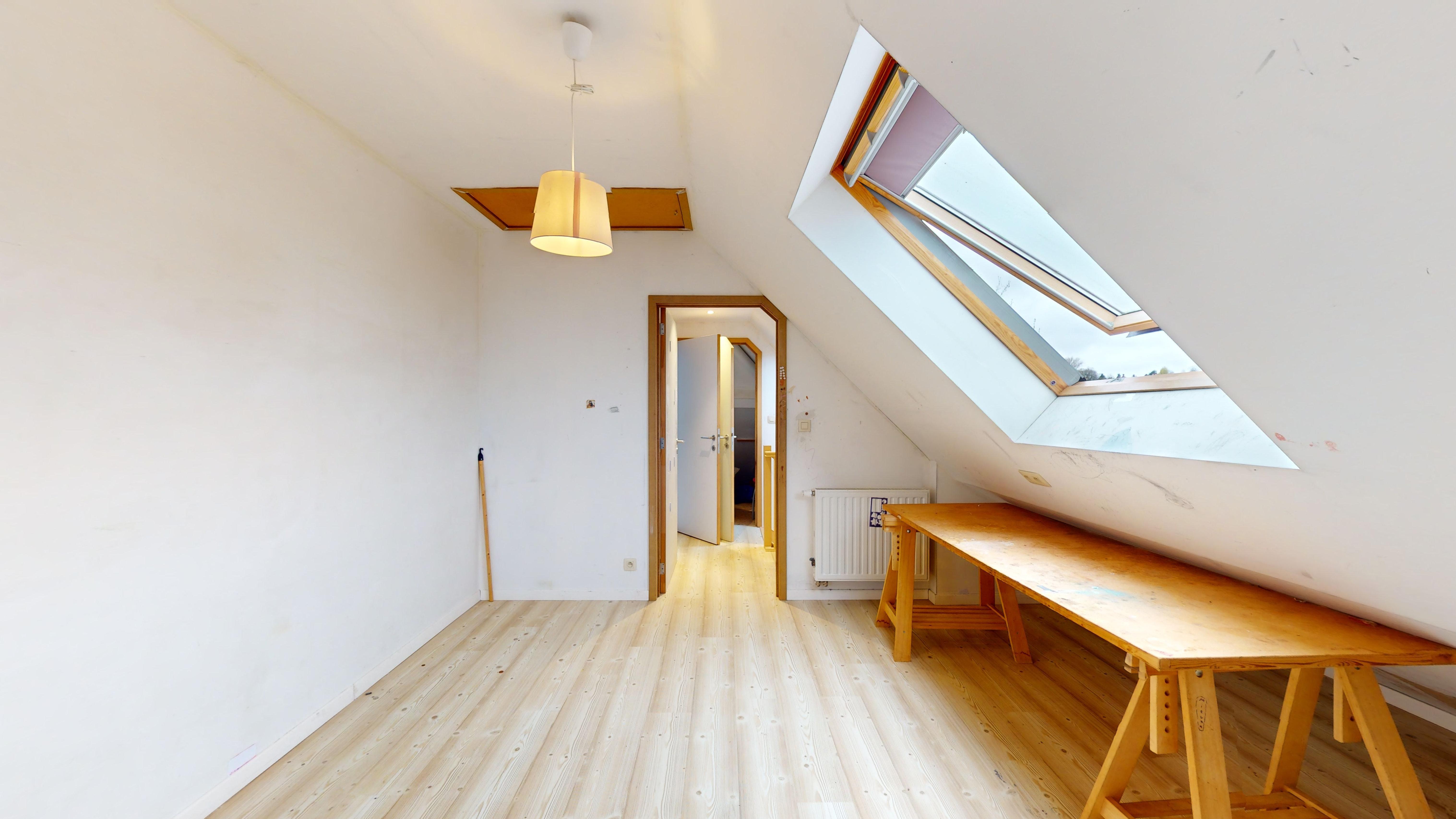 Au 2ème étage : un hall de nuit, une chambre de +/- 16m2, une salle de douche avec WC, la chaufferie et un petit grenier de rangement accessible par un escalier escamotable.