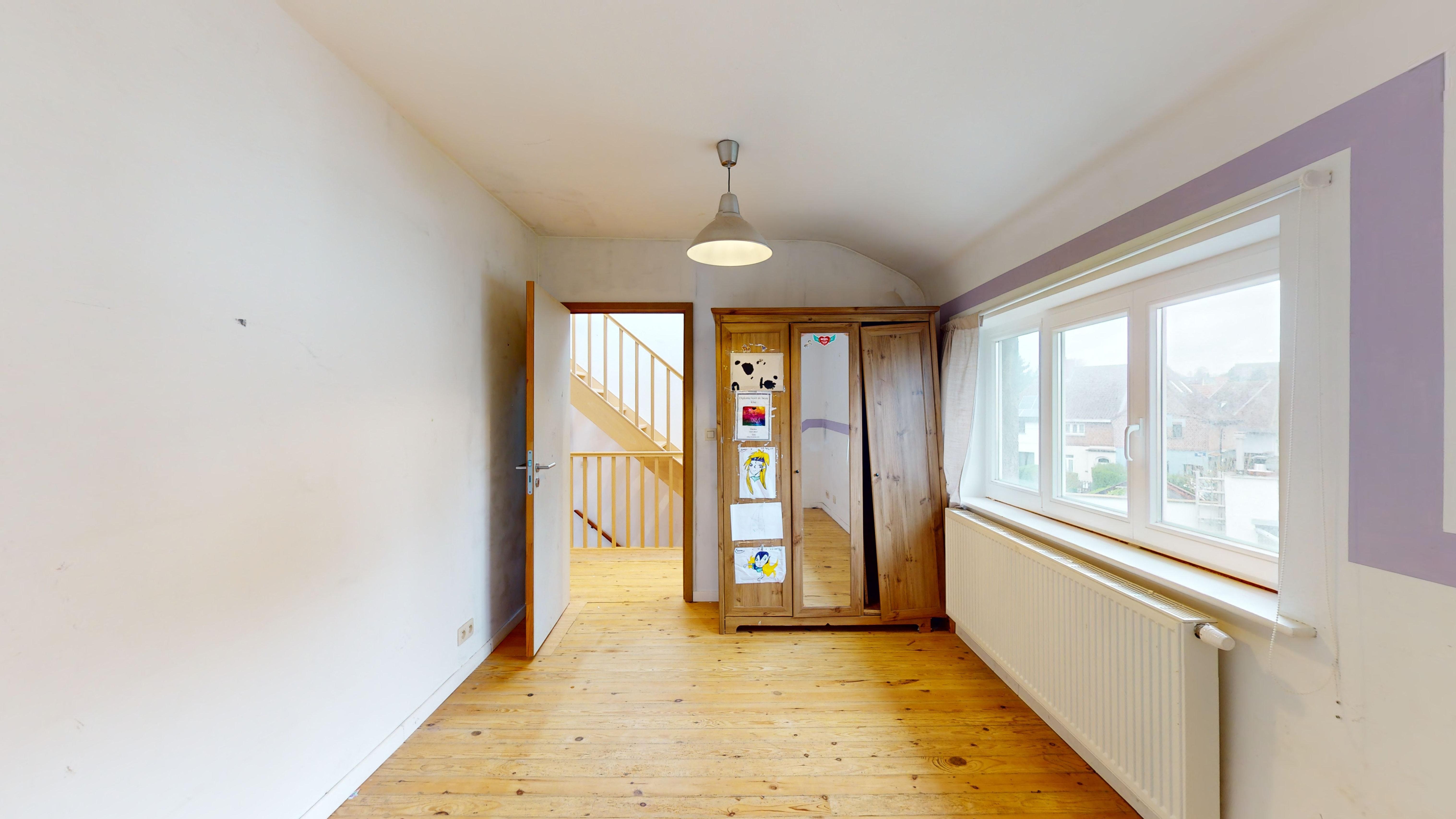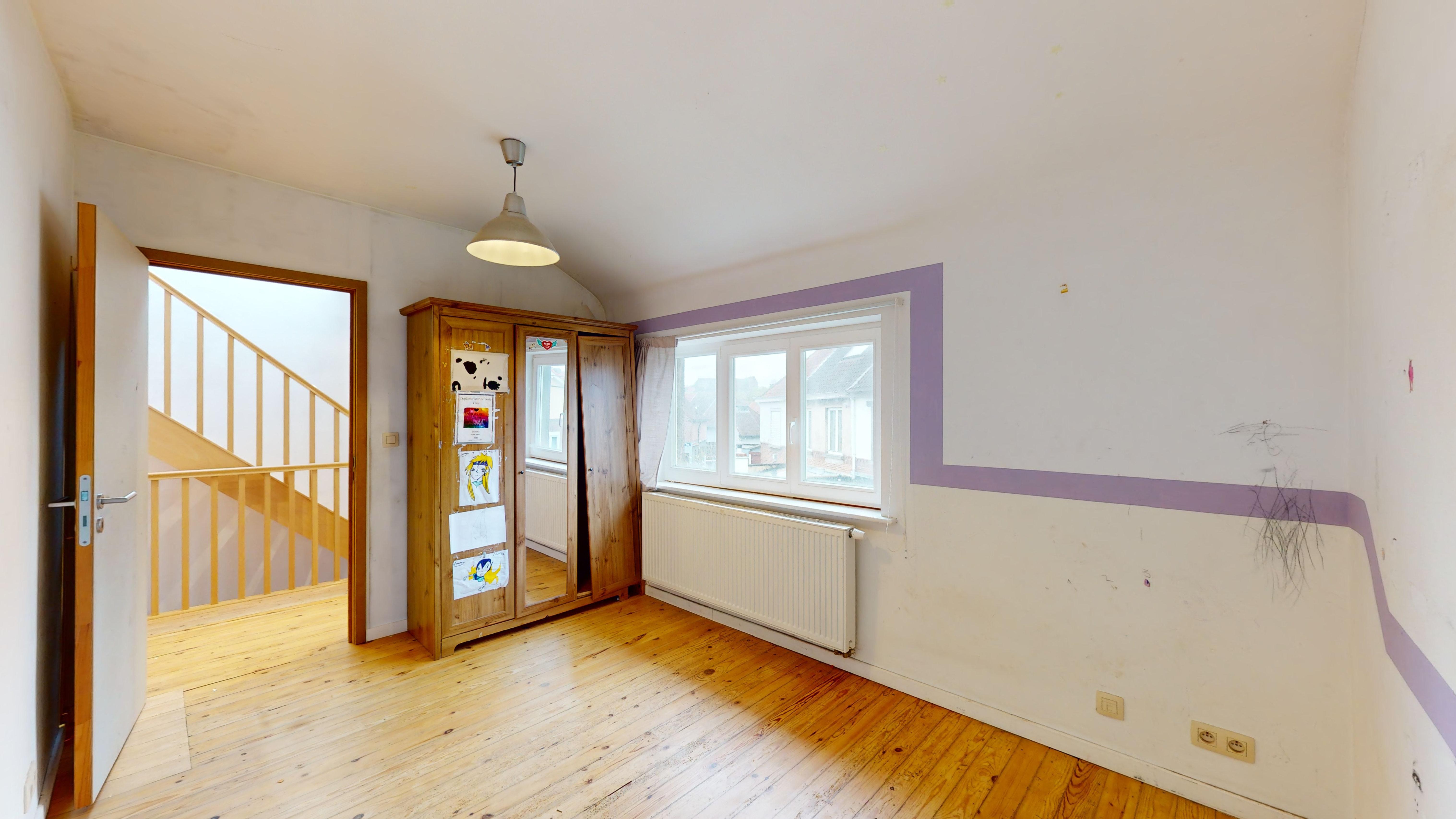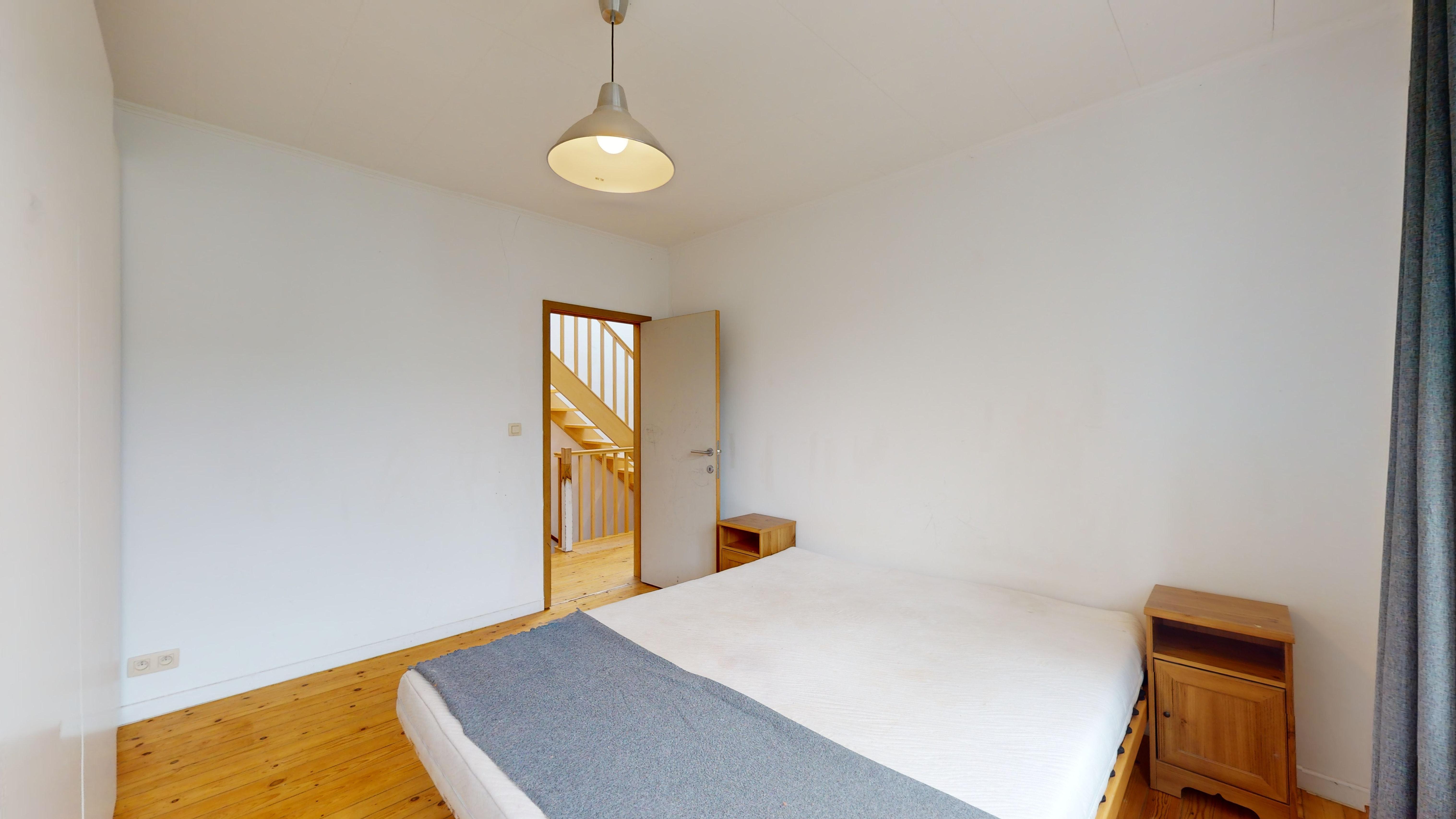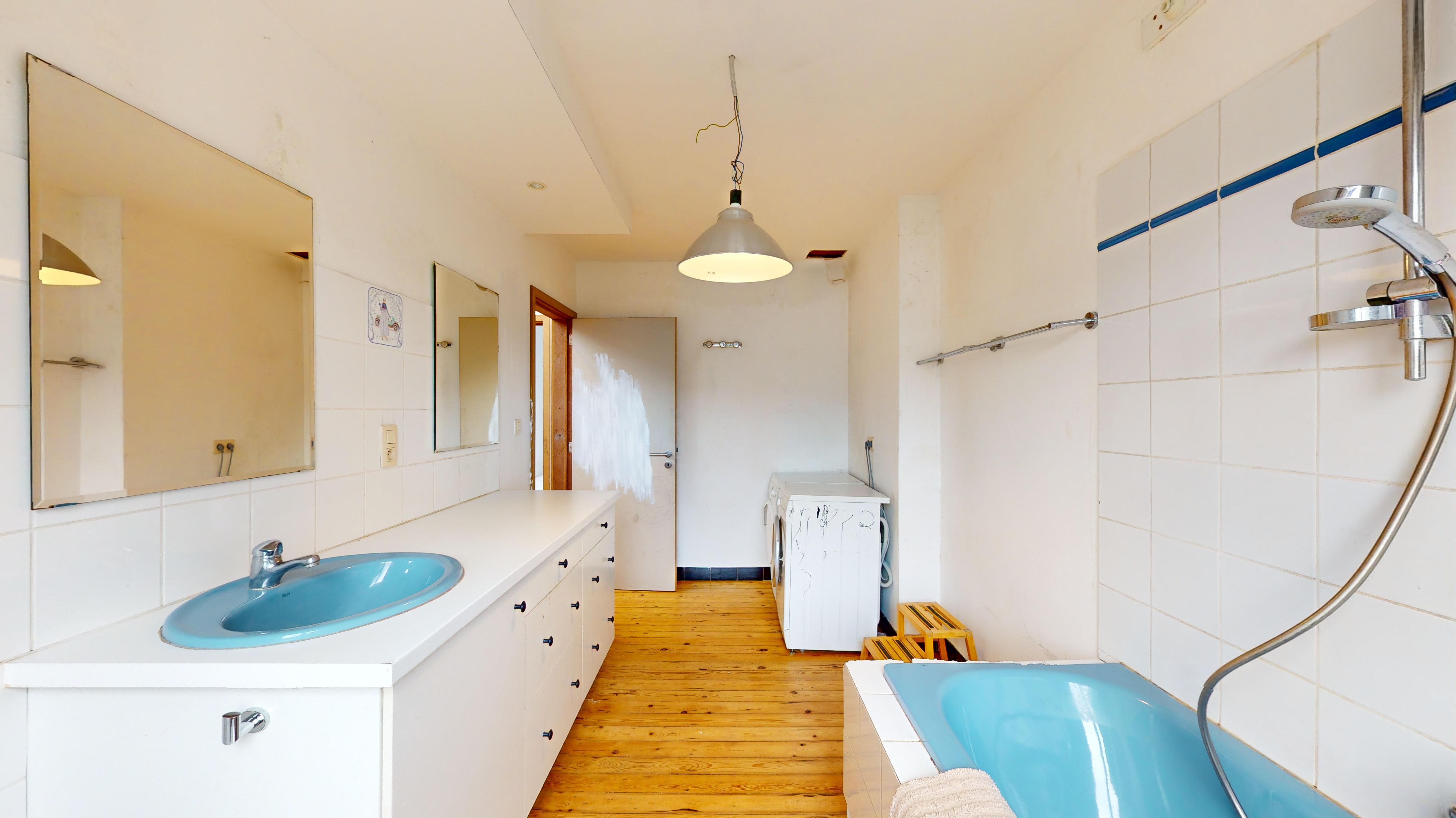 Au 1er étage : un hall de nuit, une chambre de +/- 14m2, une chambre de +/- 11m2, une grande salle de bain avec WC et un espace buanderie.