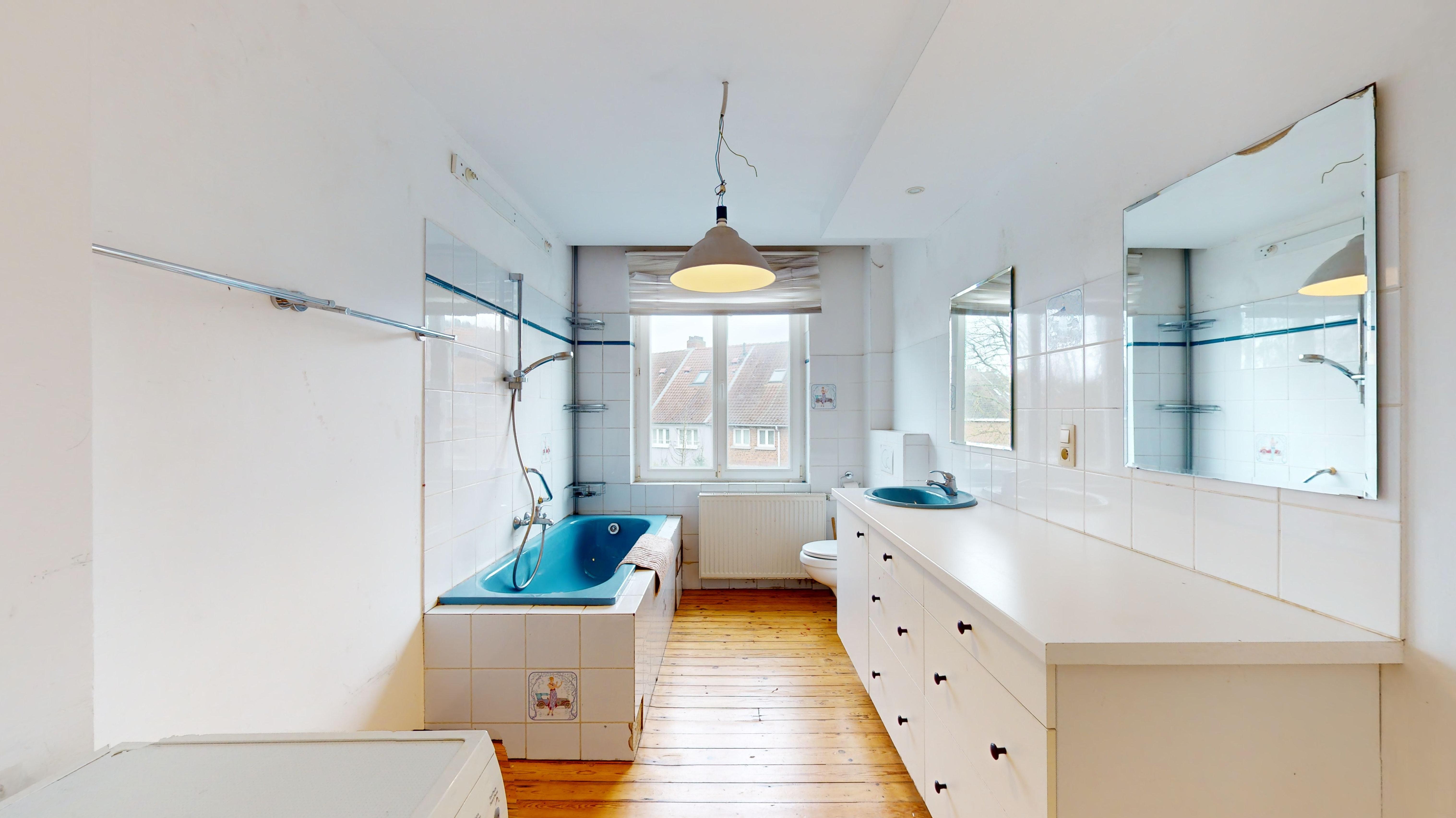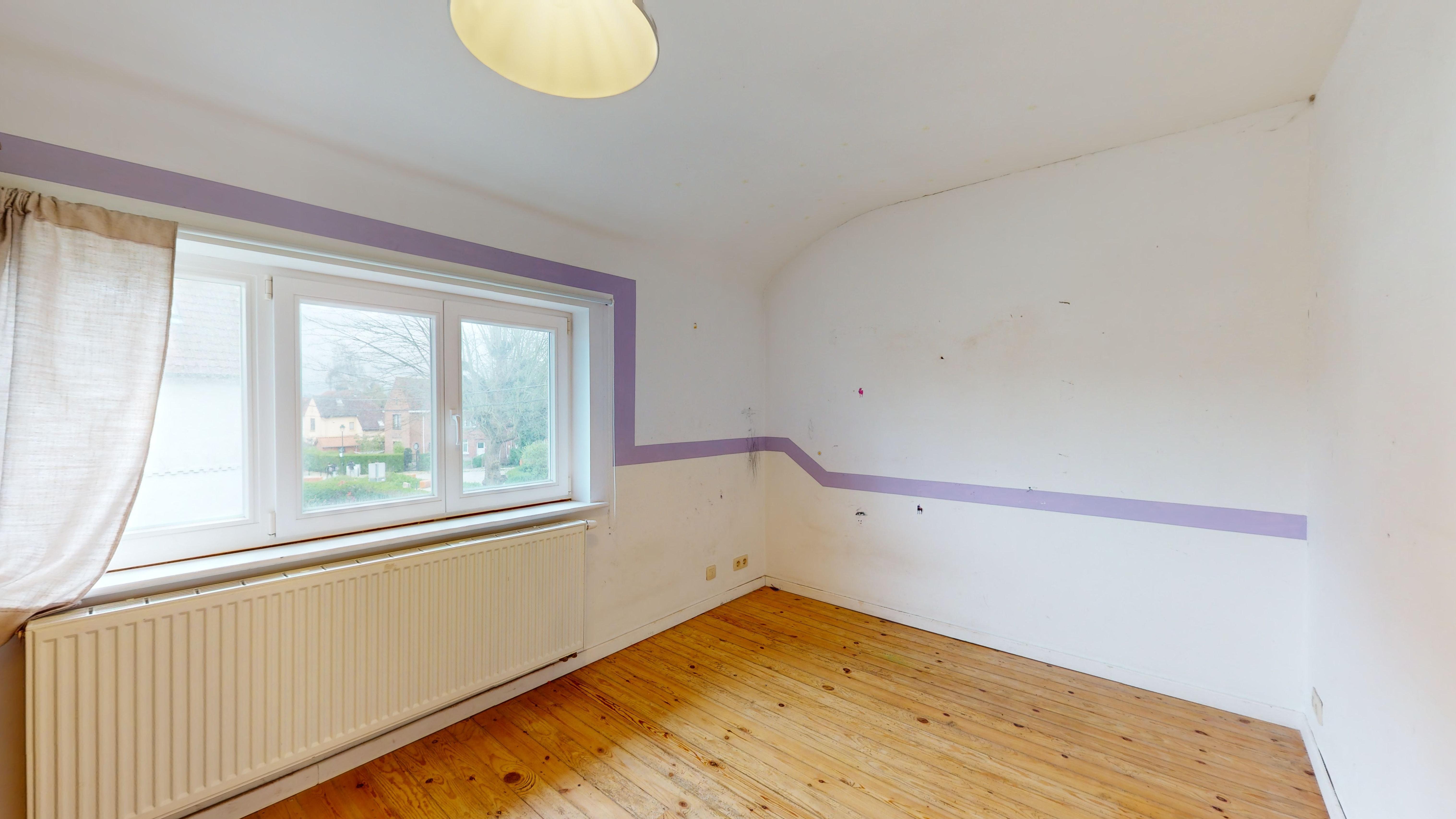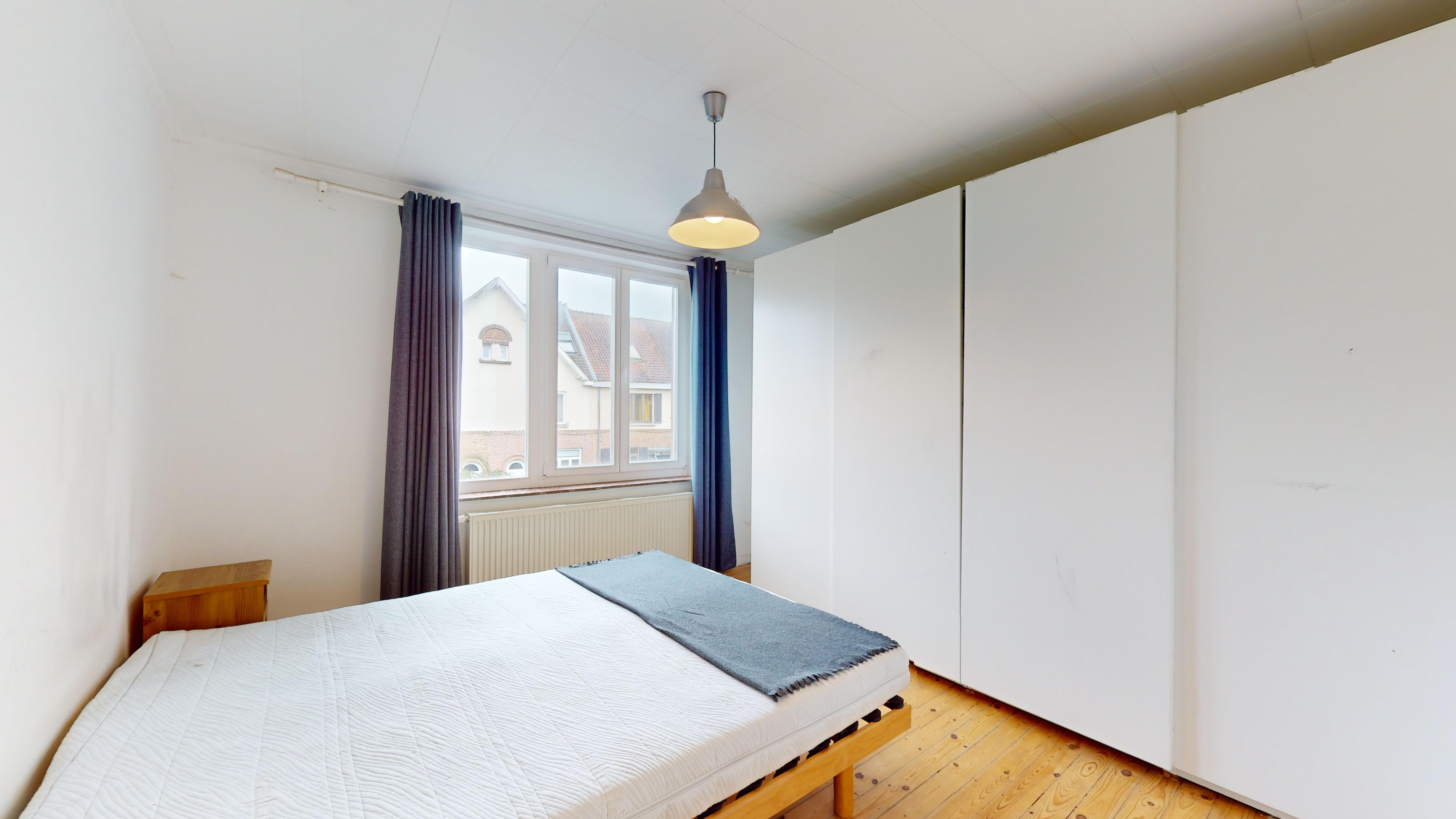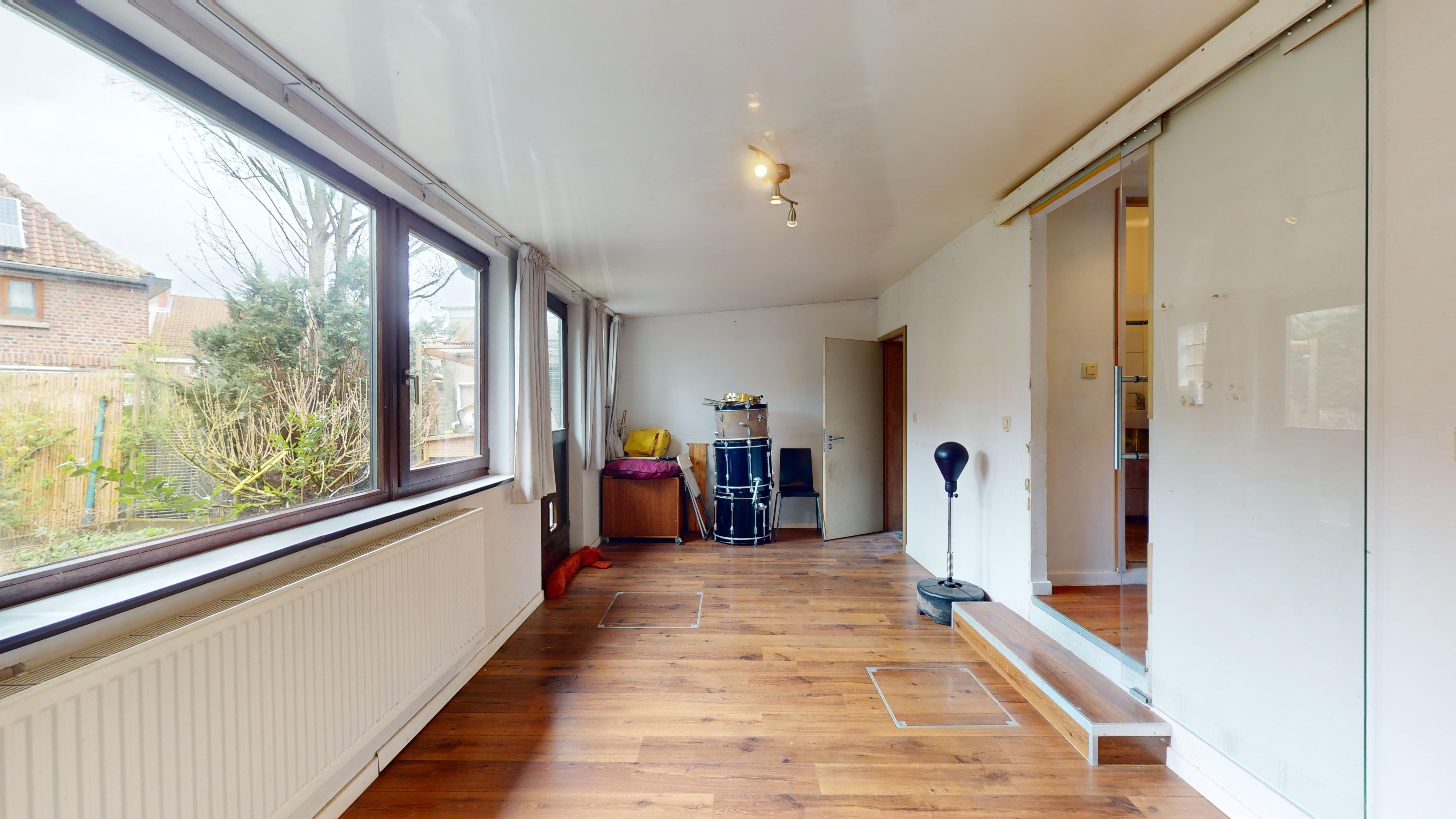 Au 1er étage : un hall de nuit, une chambre de +/- 14m2, une chambre de +/- 11m2, une grande salle de bain avec WC et un espace buanderie.