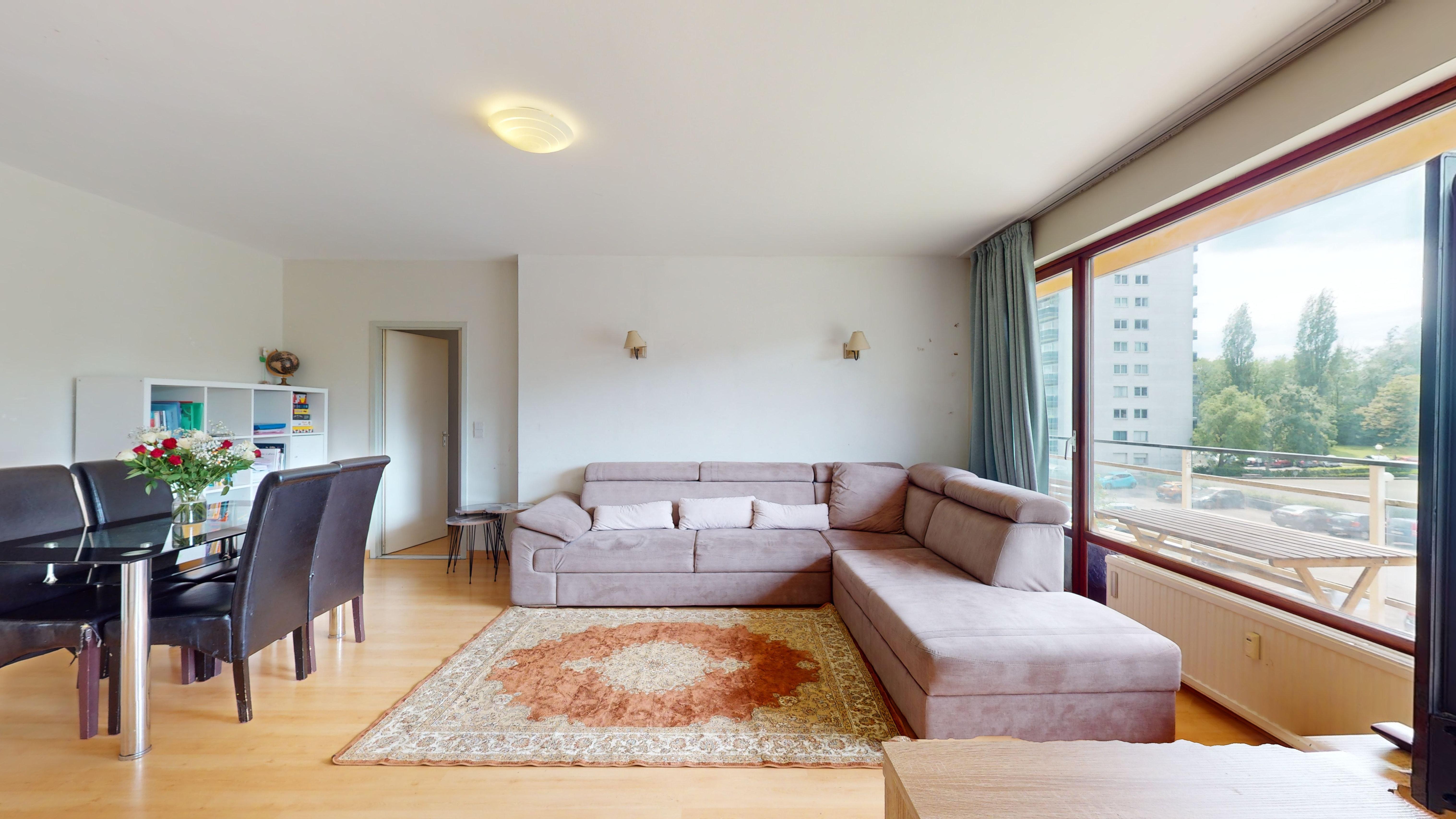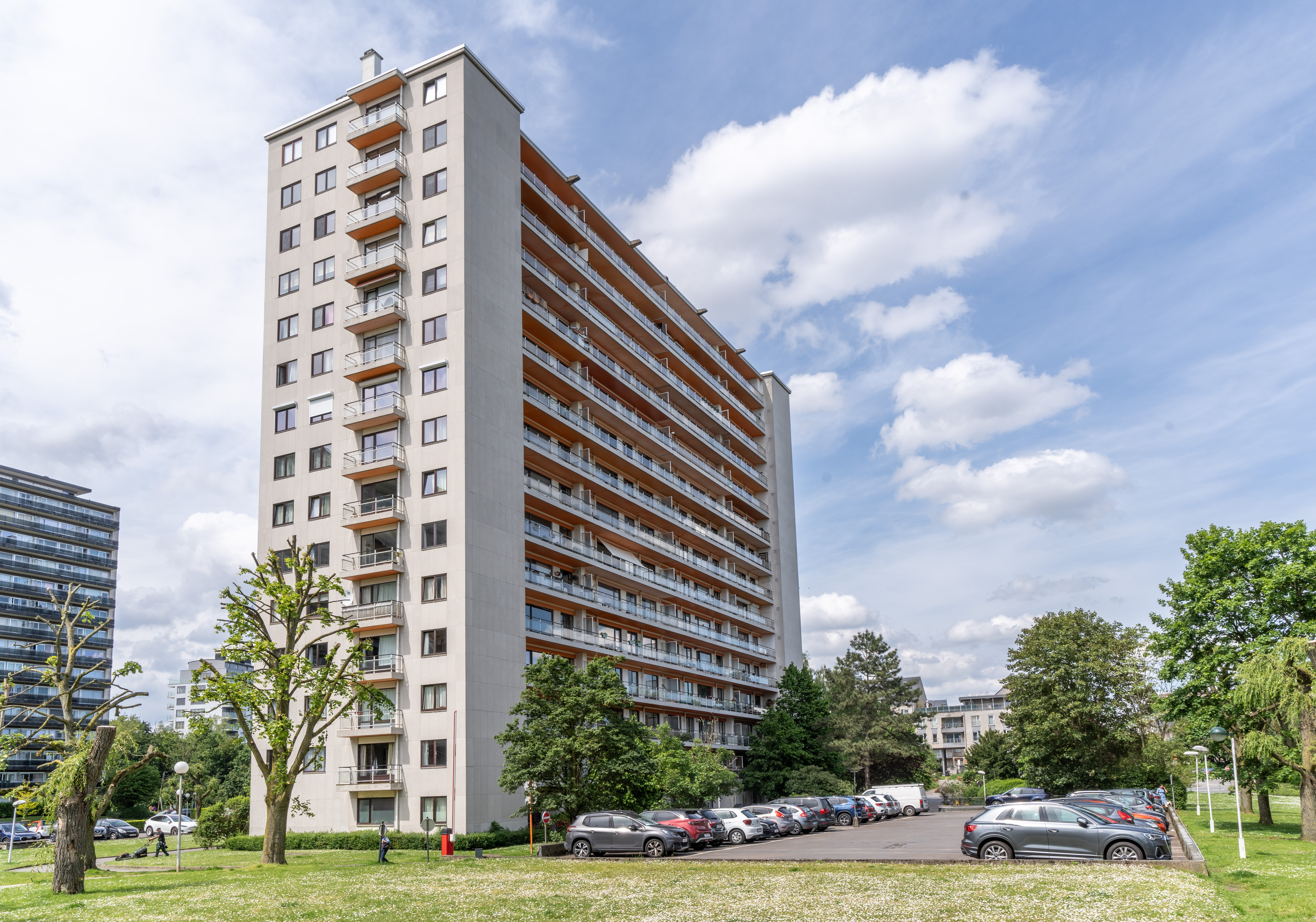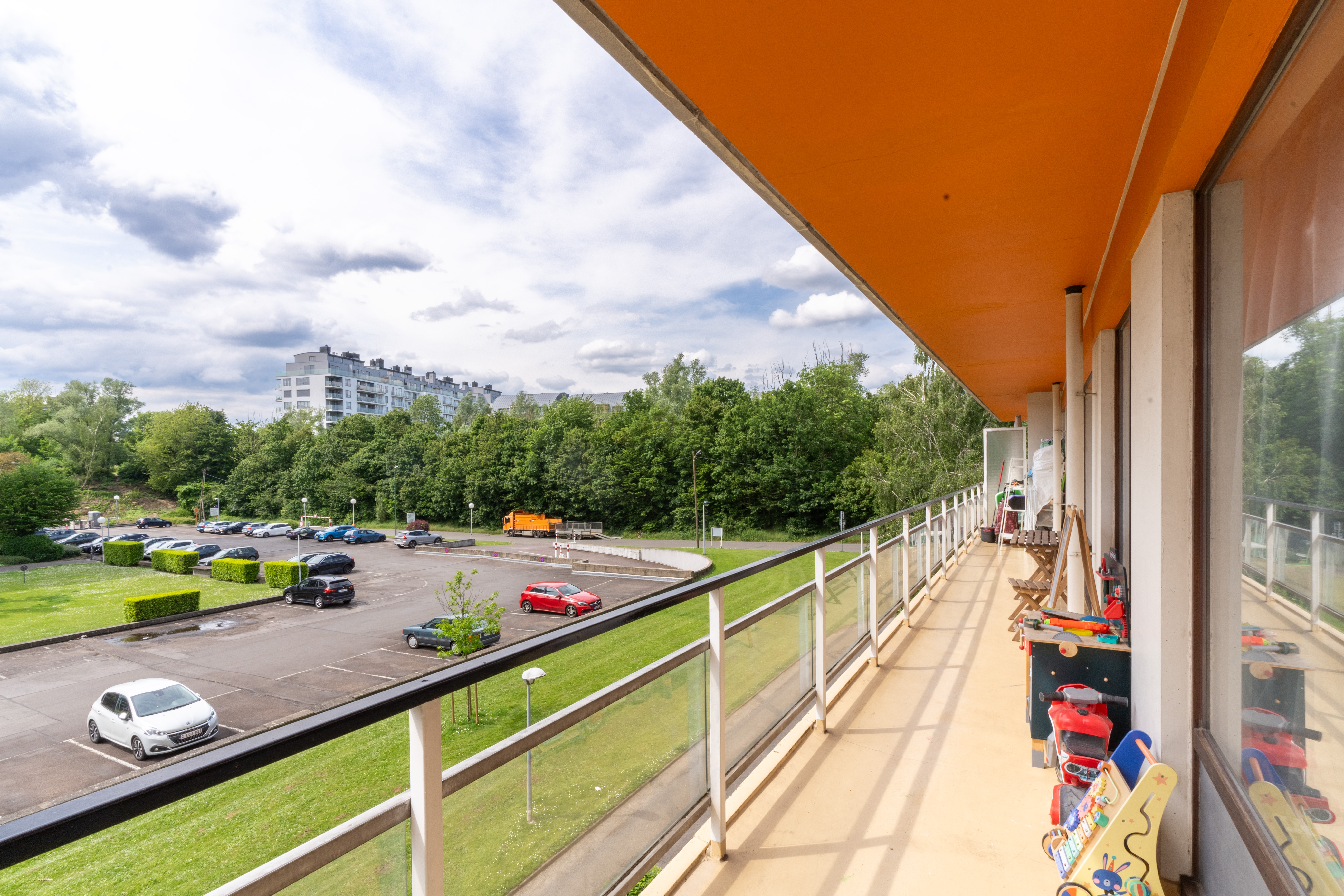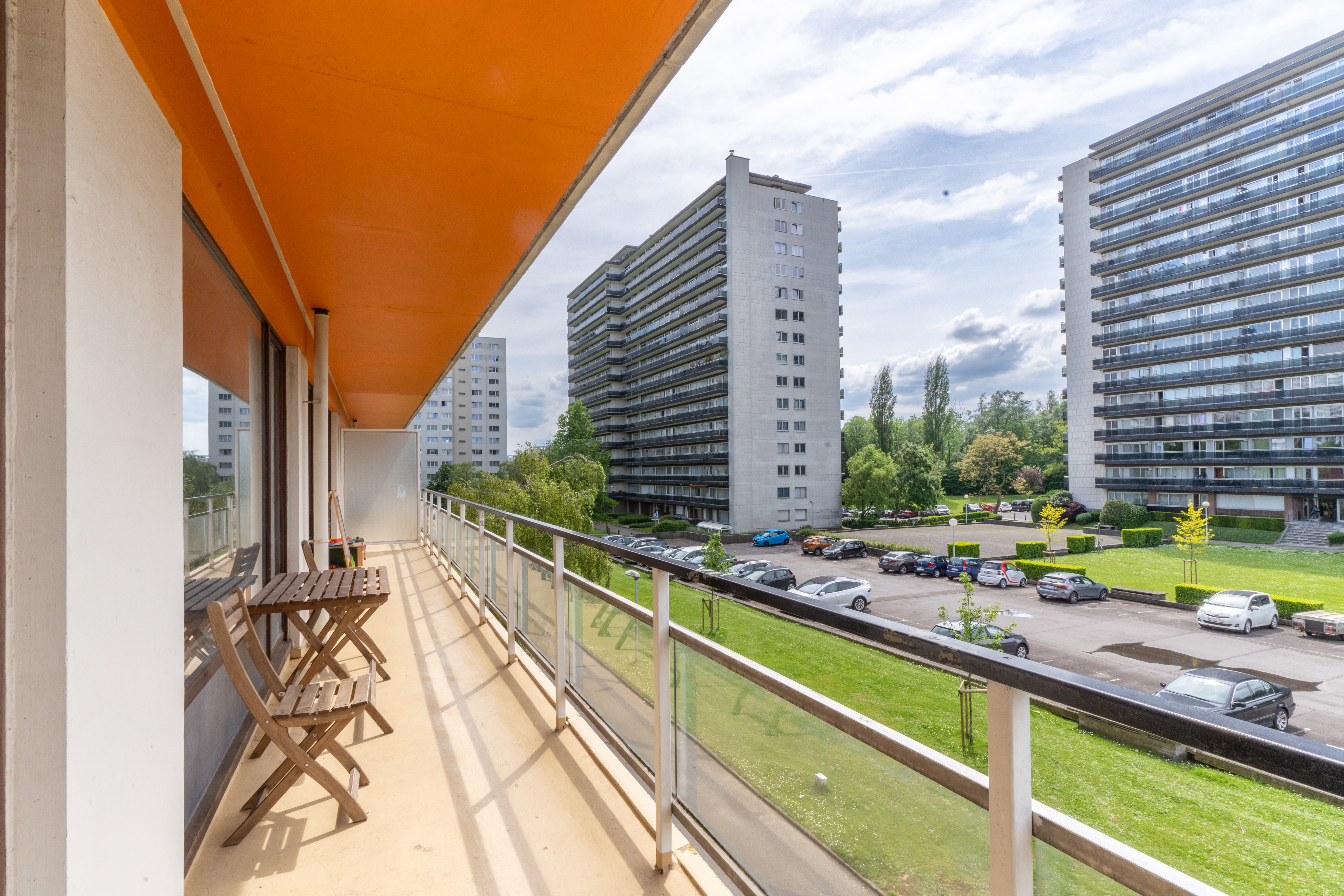 Charmant appartement familial lumineux de deux chambres à rafraichir, avec une grand terrasse orientée sud-ouest et vue côté jardin. Il est actuellement loué et il se situe au deuxième étage, dans un immeuble avec ascenseur et concierge. Il bénéficie en outre d'un garage fermé, actuellement loué, qui peut-être acheté séparément pour 35 000 euros supplémentaires et d'une cave. Electricité non conforme mais bon PEB C. L'immeuble dispose aussi d'un adoucisseur d'eau et est relié au gaz par une chaudière neuve installée en 2023 de cogénération.