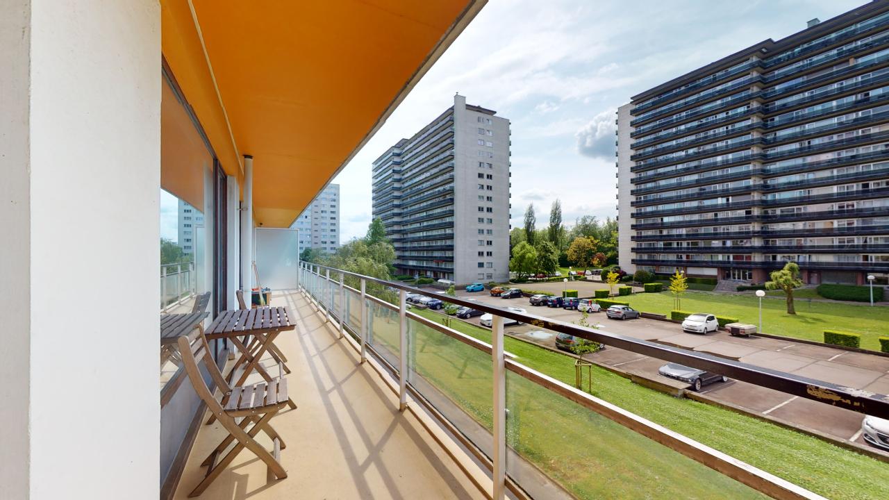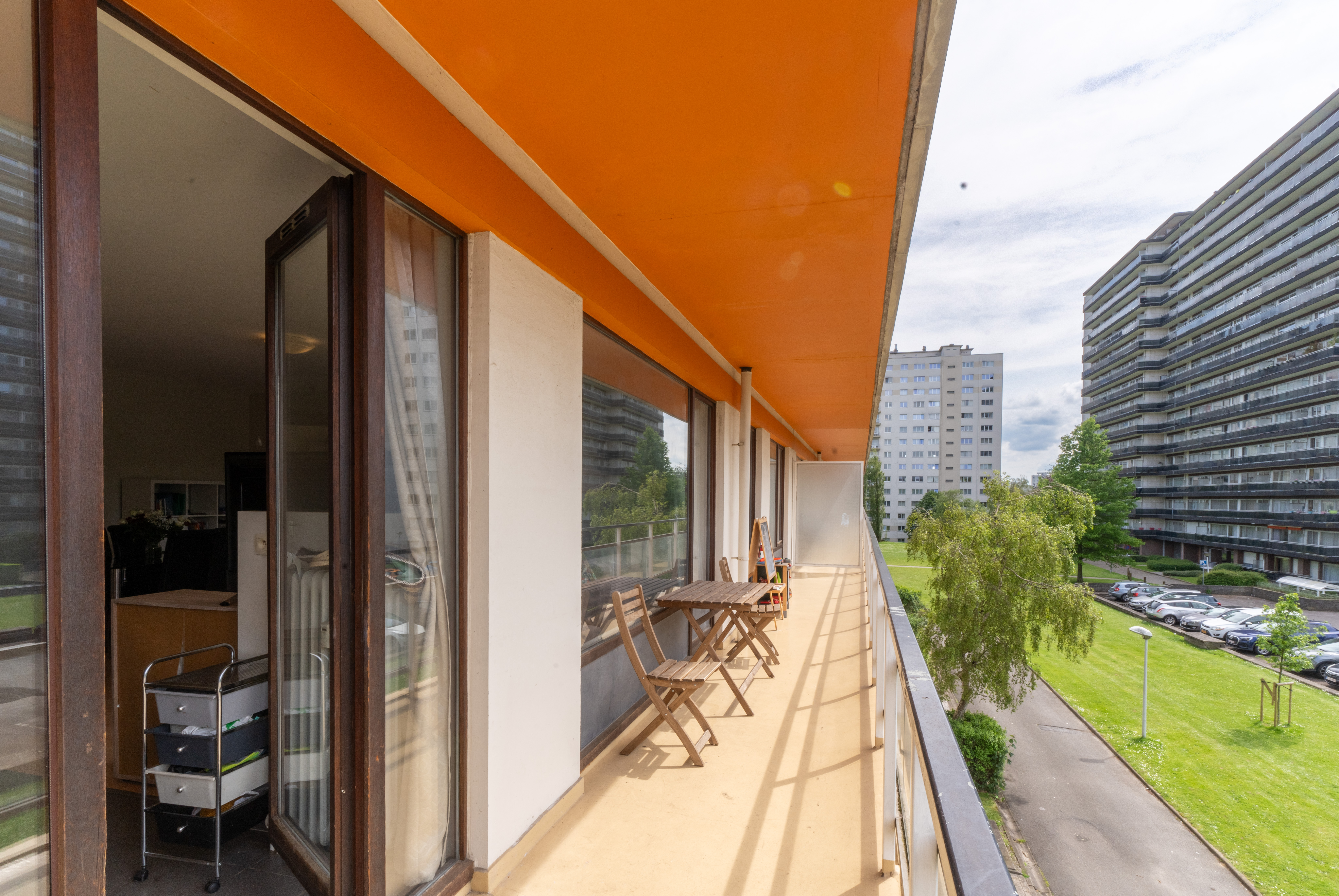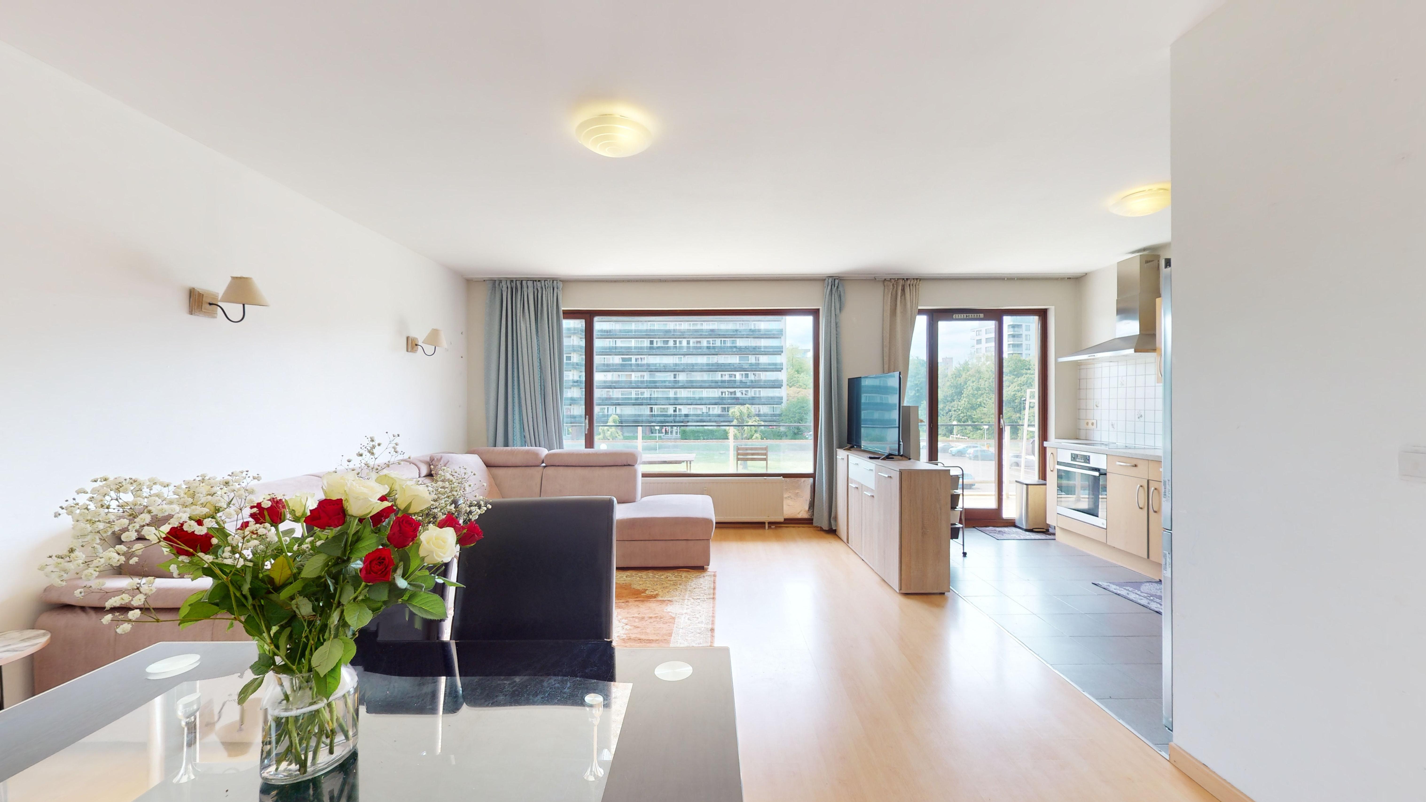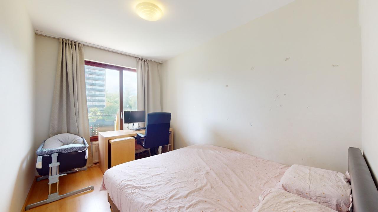 Charmant appartement familial lumineux de deux chambres à rafraichir, avec une grand terrasse orientée sud-ouest et vue côté jardin. Il est actuellement loué et il se situe au deuxième étage, dans un immeuble avec ascenseur et concierge. Il bénéficie en outre d'un garage fermé, actuellement loué, qui peut-être acheté séparément pour 35 000 euros supplémentaires et d'une cave. Electricité non conforme mais bon PEB C. L'immeuble dispose aussi d'un adoucisseur d'eau et est relié au gaz par une chaudière neuve installée en 2023 de cogénération.