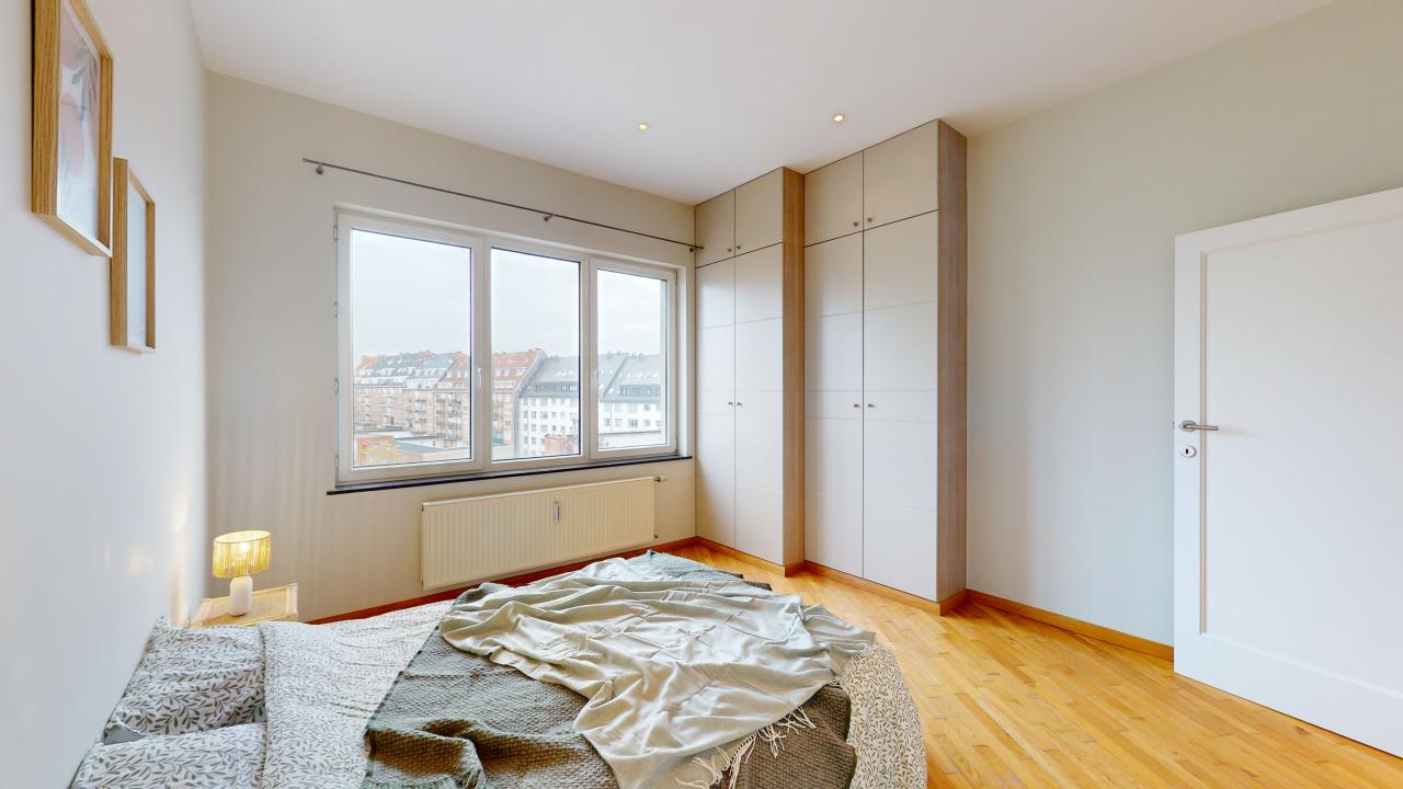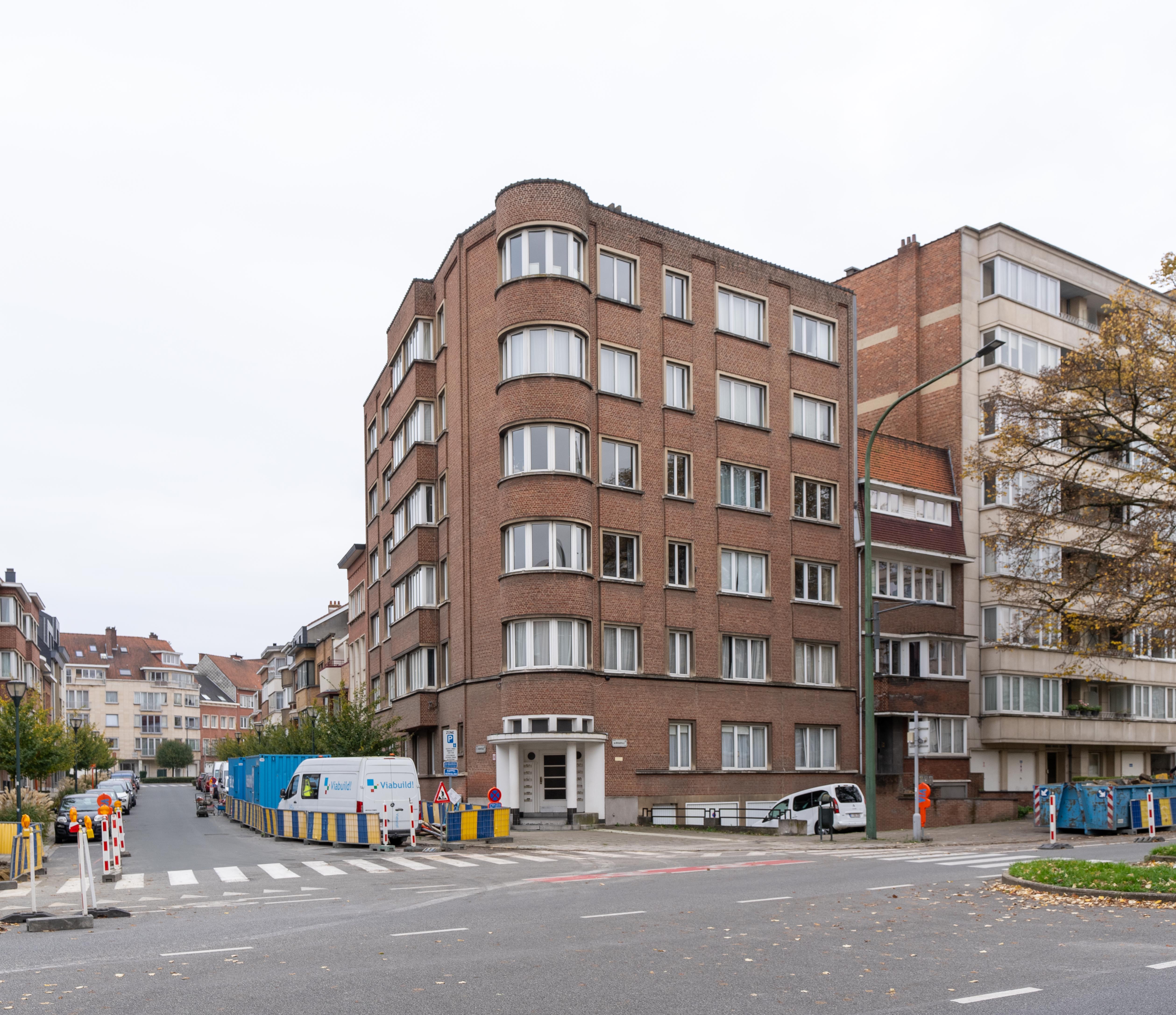 Situé à l'angle de l'Avenue de Broqueville et de l'Avenue Constant Montald, à proximité des transports en commun et du Parc du Cinquantenaire, By The Way vous propose ce charmant appartement de +/- 110 m2 bruts, construit d'après les plans de l'architecte E.A Linssen. L'appartement est situé au 5ème et dernier étage d'un immeuble de style moderniste et dispose d'un ascenseur classé au patrimoine architectural de la région de Bruxelles-Capitale, qui a été mis en service en 1942. L'appartement se compose comme suit, un hall d'entrée avec une porte palière et un WC séparé, un grand et lumineux séjour avec salle à manger de 30m2 bruts, une cuisine équipée ouverte, un hall de nuit desservant une première chambre de +/- 15m2 bruts, une seconde chambre de +/- 14m2 bruts et une salle de douche. Une loggia et une cave privative en sous-sol viennent compléter ce bien. Charges : +/- 340 €/mois comprenant la provision pour le chauffage et l'eau chaude privatifs, l'assurance, l'entretien des communs, les frais administratifs, les frais de syndic, ... Techniques : PEB G - Électricité non conforme, chaudière commune au gaz à condensation. Local vélo.