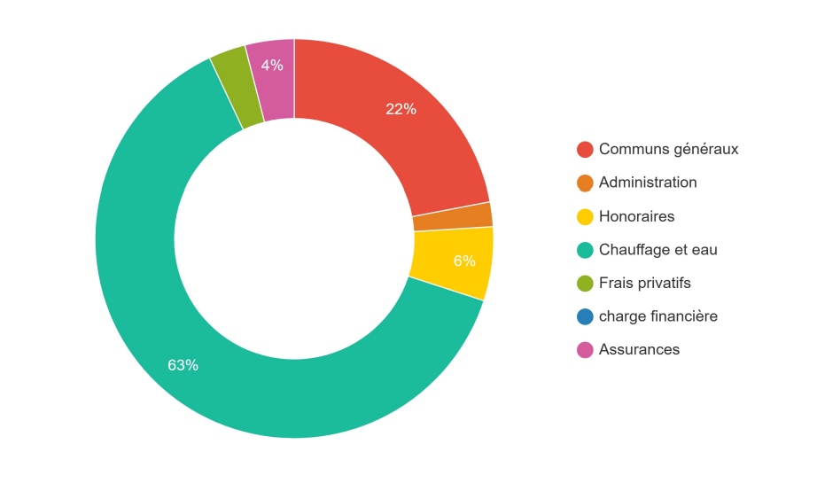 Ce tableau des charges comprend: Communs généraux , Frais administration, Honoraires, Chauffages et eaux , Frais privatifs , Assurance et Charge financière