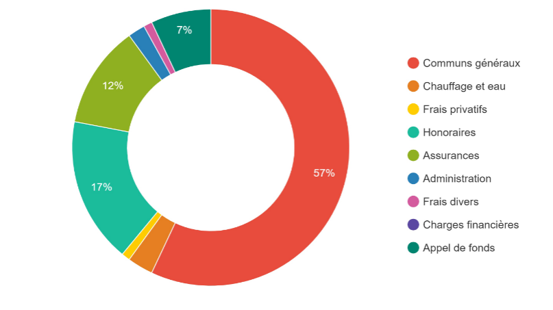 Ce tableau des charges comprend : Communs généraux – Chauffage et eau – Honoraires - Administartion – Assurance – Charge financières et frais privatifs – Frais divers – appel de fonds