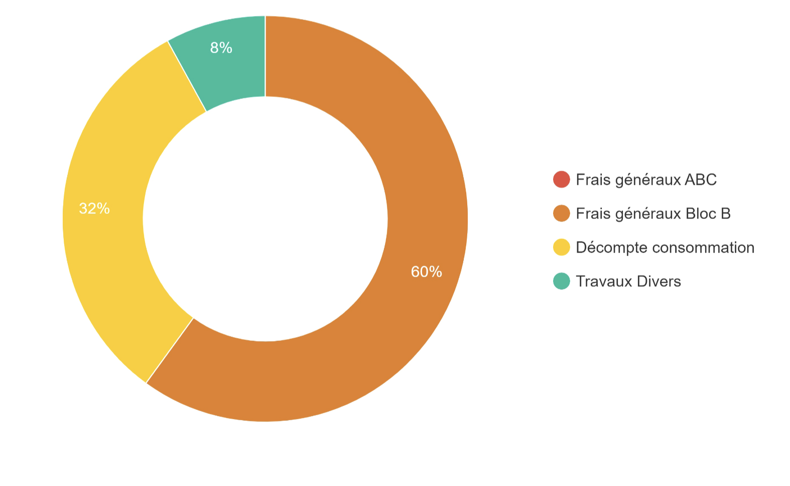 Ce tableau des charges comprend : Frais généraux A,B,C – frais généraux bloc B – décompte consommation et travaux divers