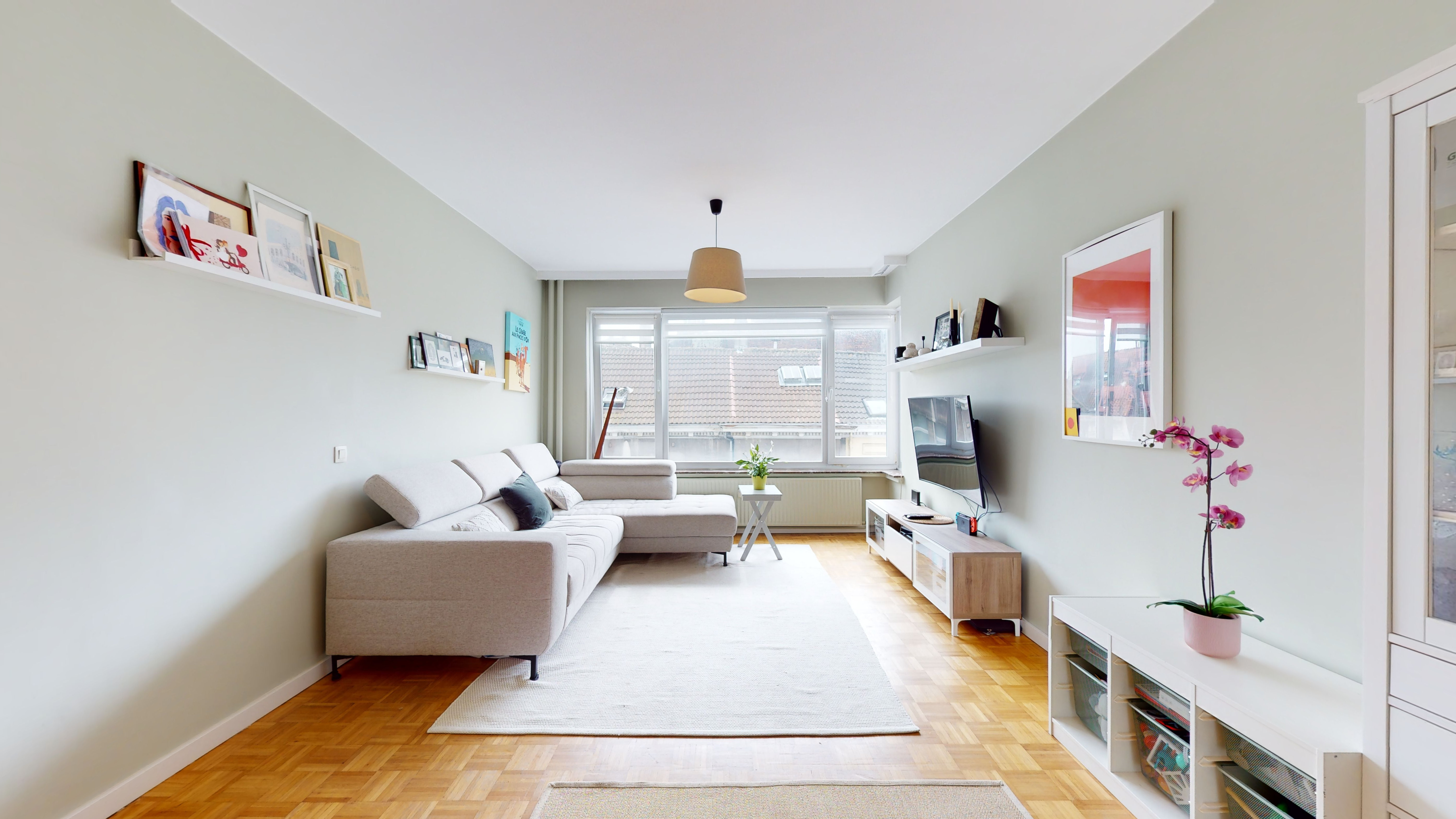 Bel appartement de 2 chambres dont une avec balcon au 4 -ème étage d'un immeuble avec ascenseur et une cave numéro 51. Le séjour est lumineux et offre de beaux volumes avec +/- 27m2. Le chauffage est au gaz. La salle de bain se compose d'une douche a l'italienne avec radiateur porte-serviette chauffant et un lave-main double vasque. Les chambres sont spacieuses avec +/- 16,40 m2 pour la chambre parentale et +/- 13m2 pour la seconde.