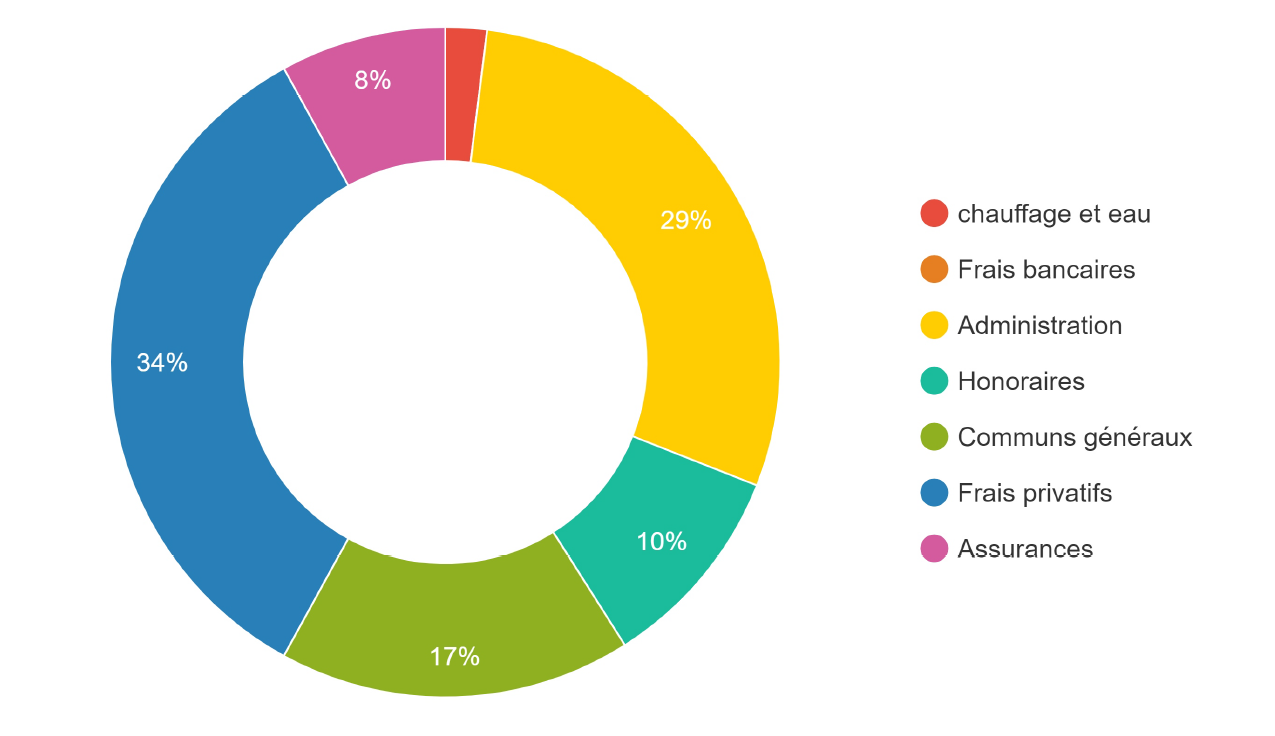 Ce tableau des charges comprend : Communs généraux – Chauffage et eau – Honoraires - Assurances – Administration – Assurances - Frais bancaires - Frais privatifs