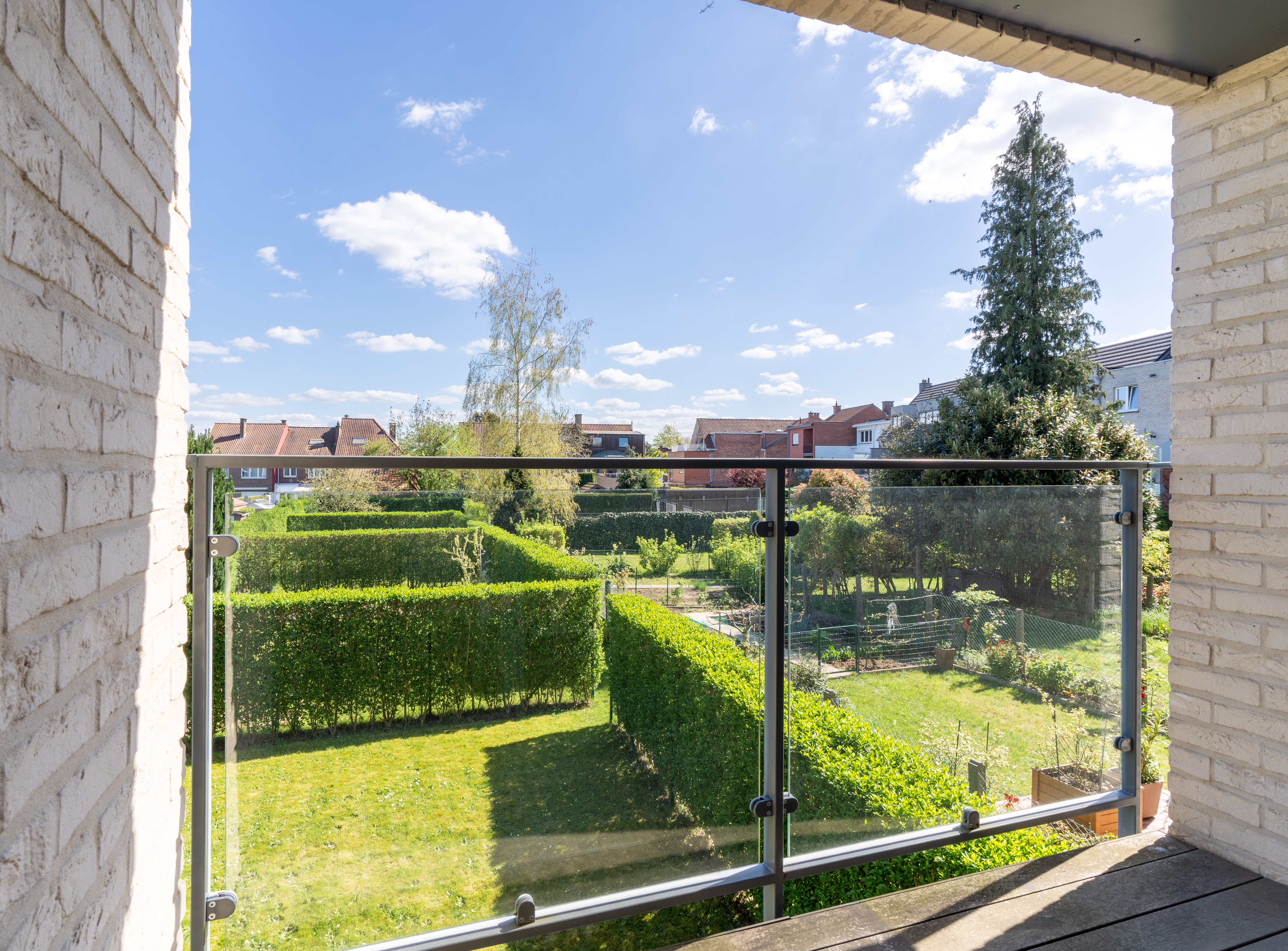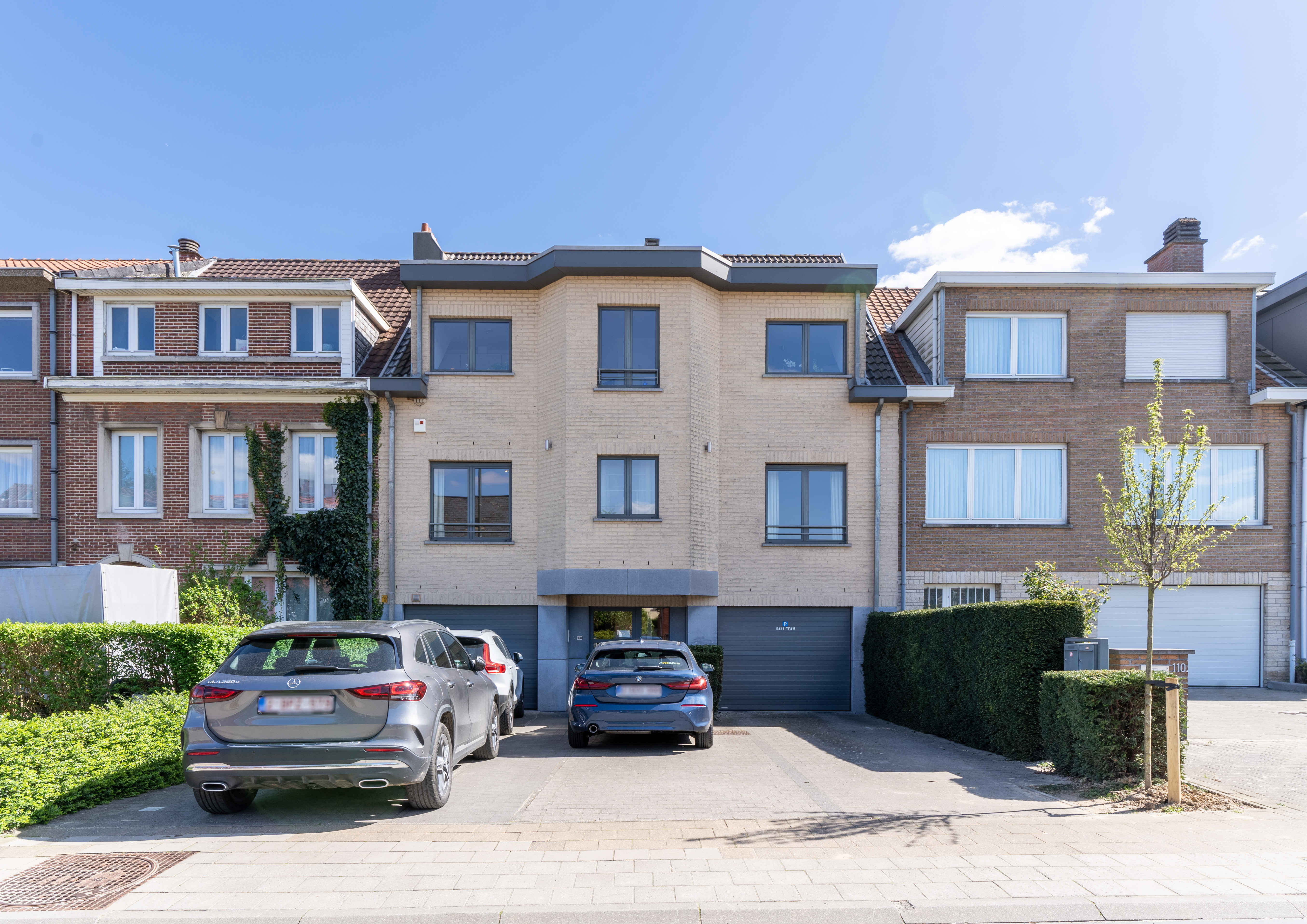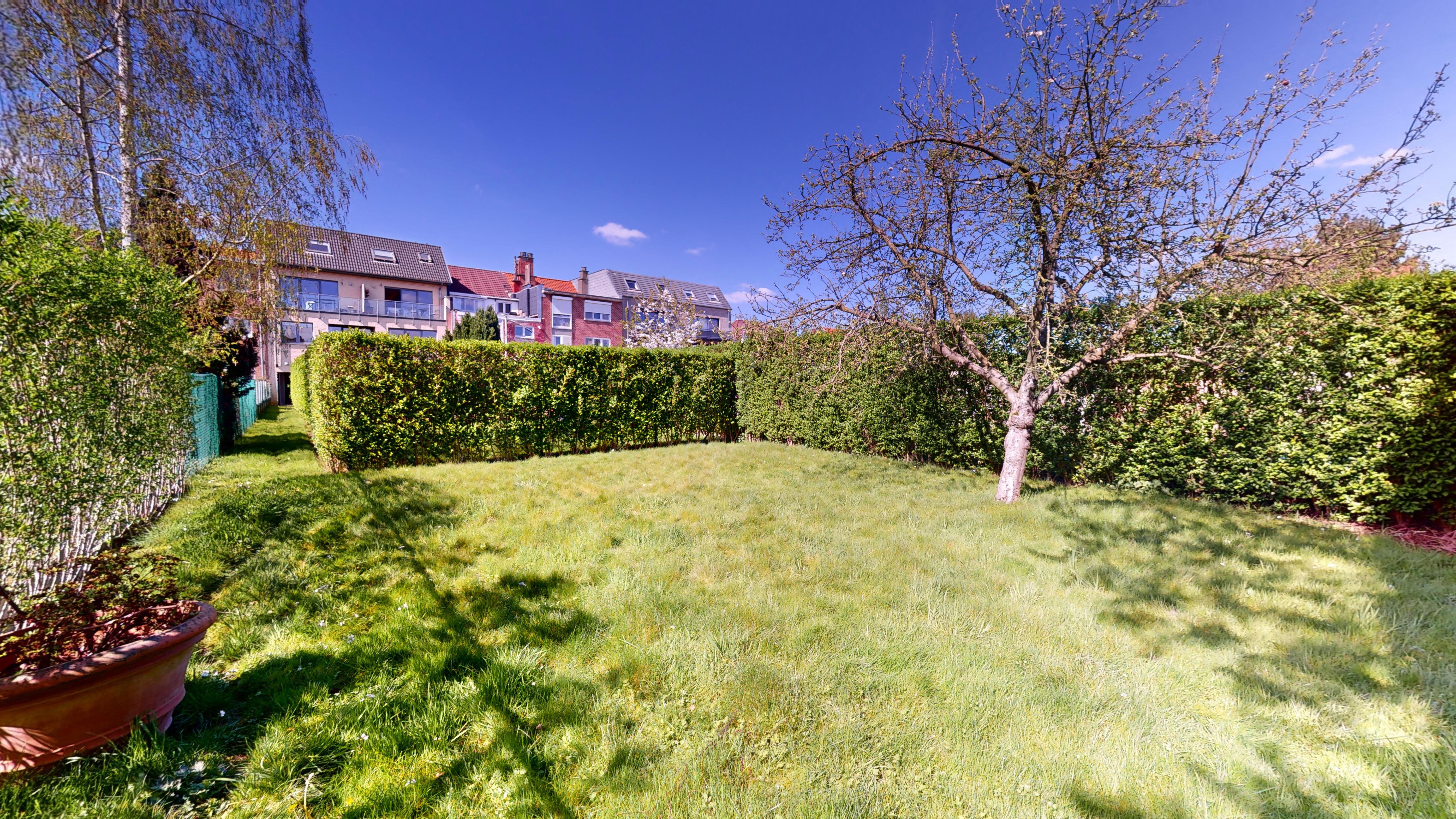 hall d’entrée, wc invités, vestiaire, lumineux séjour de 43 m² avec terrasse arrière orientée sud/sud-est, grande cuisine attenante super-équipée d'électro-ménagers de marque et beaucoup de rangement. Débarras avec la chaudière Bulex et le système de ventilation mécanique VMC. La chambre 1 offre 14,50 m² , de grandes penderies et sa salle de douche privative. La chambre 2 offre 12,20 m², sa salle de bain complète de 6m² (baignoire + douche et toilette). Revêtements de sol : parquet massif partout sauf les salles d’eau. Châssis double-vitrage alu de qualité (Pierret=HQ). Électricité conforme et PEB ‘B’ (132kWh/m²). Jardin privatif de +/-100 m² orienté sud/sud-est, cave de 5 m² et un 'pack garage' avec porte électrique télécommandée + 2 emplacements de parking réservés devant en option obligatoire à 30.000 €. Le tout est en très bon état général et bien entretenu. L’immeuble est pourvu d’un ascenseur PMC. Charges communes à 130€ pour syndic, assurances, entretien ascenseur et parties communes, …etc.