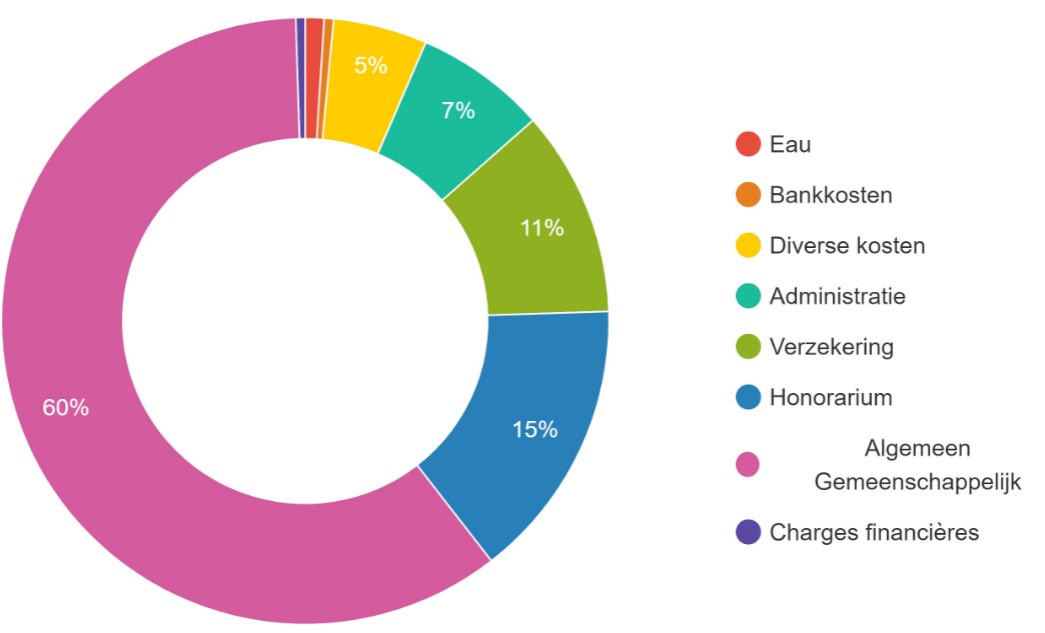 Deze tabel met onkosten omvat : Algemene kosken, water, vergoedingen, administratie, verzekeringen, diverse uitgaven, bankkosten et financeële lasten.