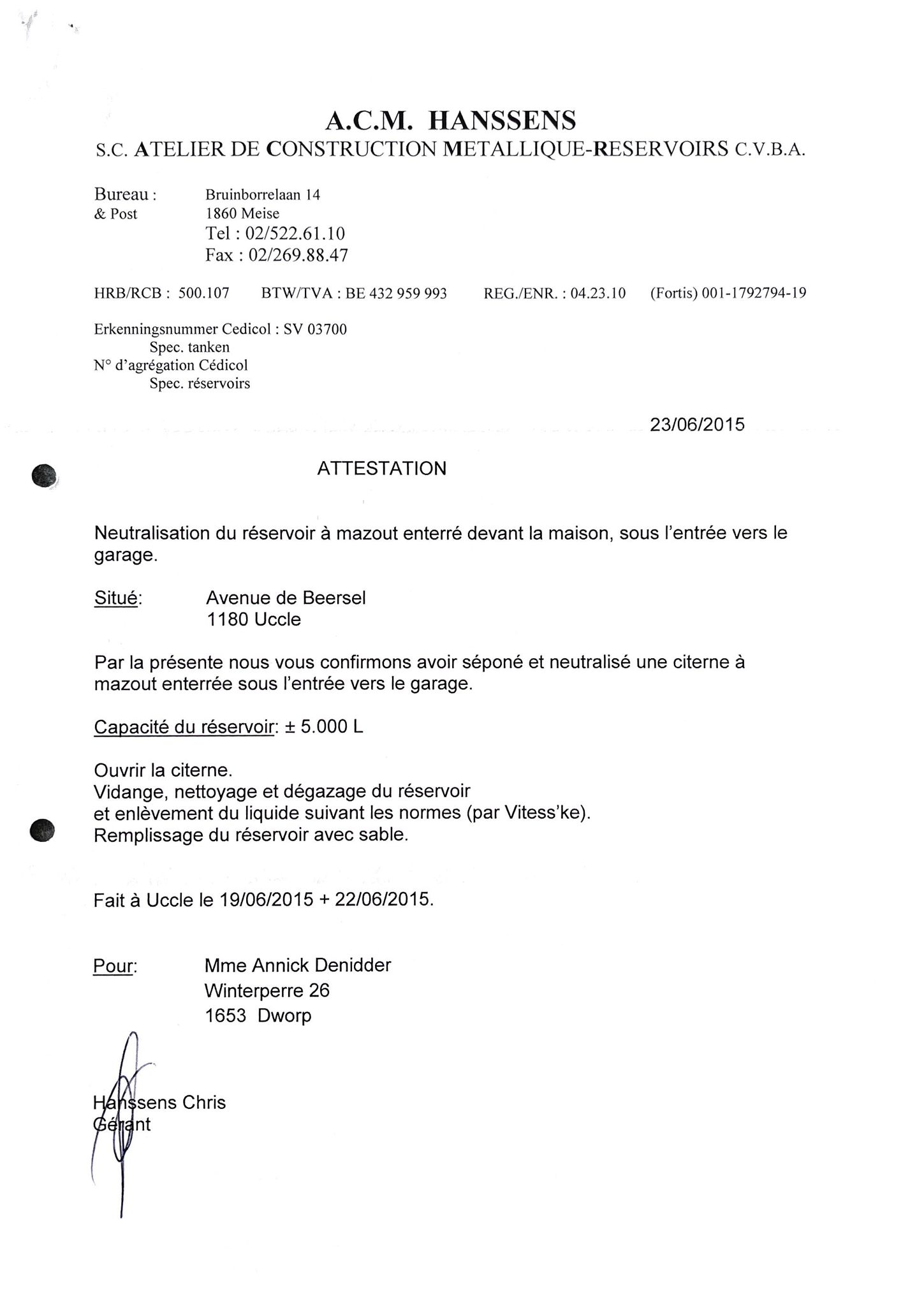 CERTIFICAT D’ÉTANCHÉITÉ DE LA CUVE À MAZOUT
