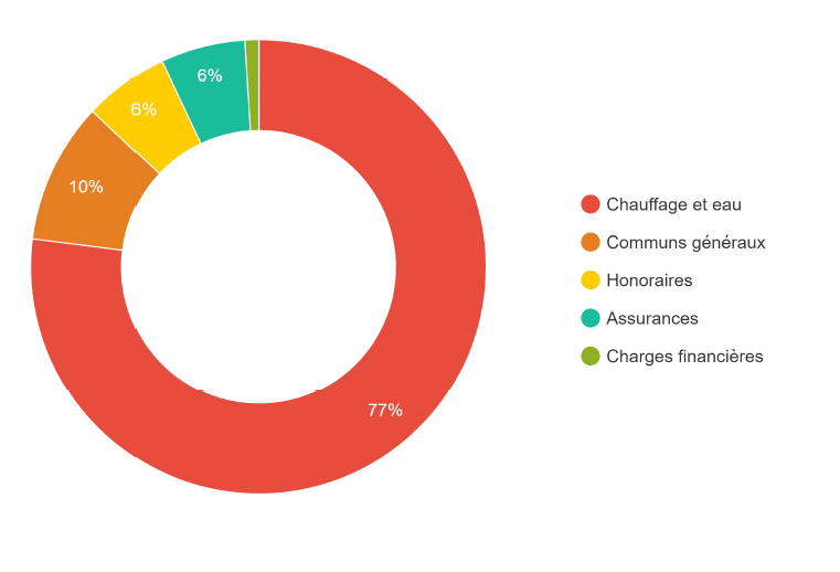 Ce tableau des charges comprend : Communs généraux – Chauffage et eau – Honoraires - Assurances – Charges financières –