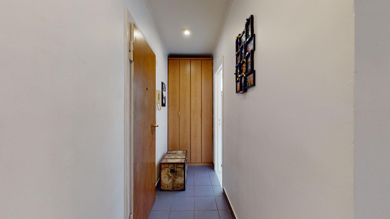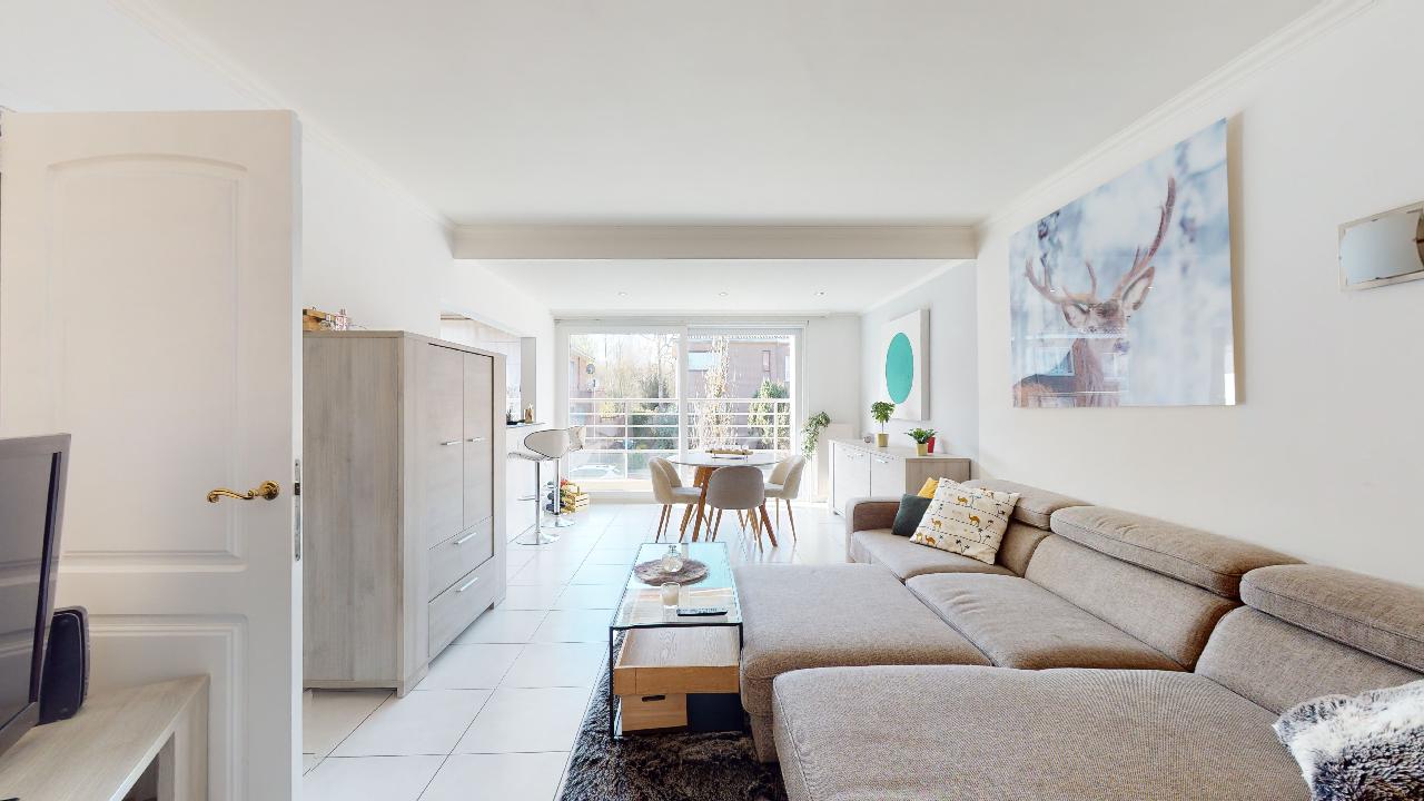 avec bar. L’appartement dispose d’une terrasse, orientée sud, en face du living et d'un balcon attenant à la chambre parentale. Le bien est composé comme suit : hall d'entrée avec placards (vestiaire), grand living avec cuisine semi-ouverte, un wc, une salle de douche avec lavabo et 2 chambres. Cave comprise dans le prix.