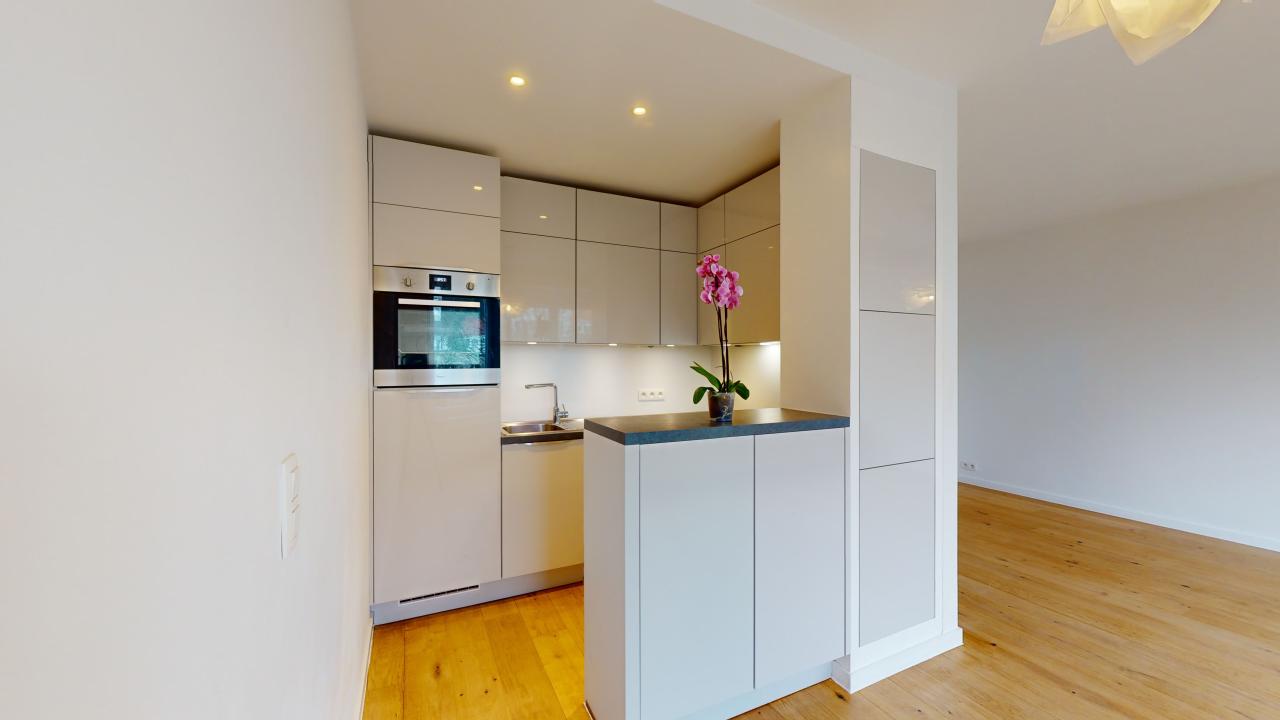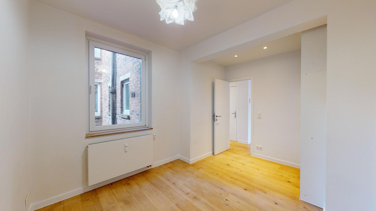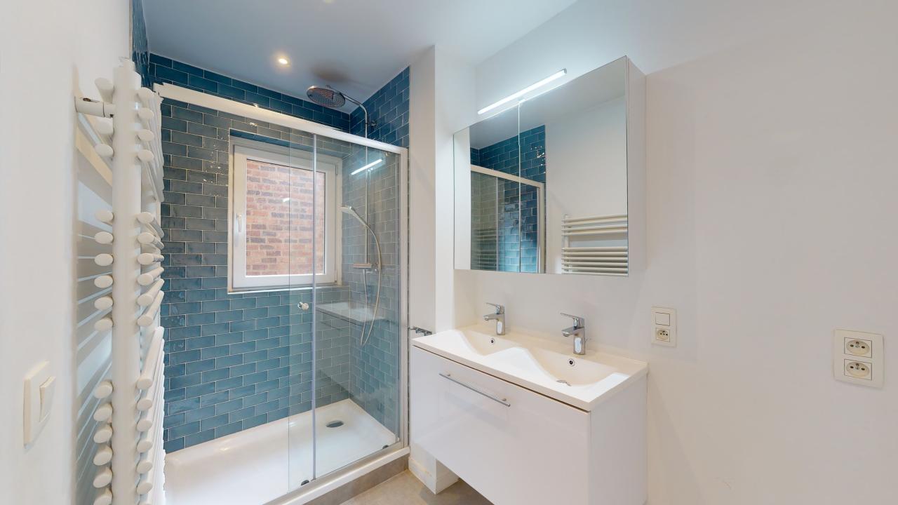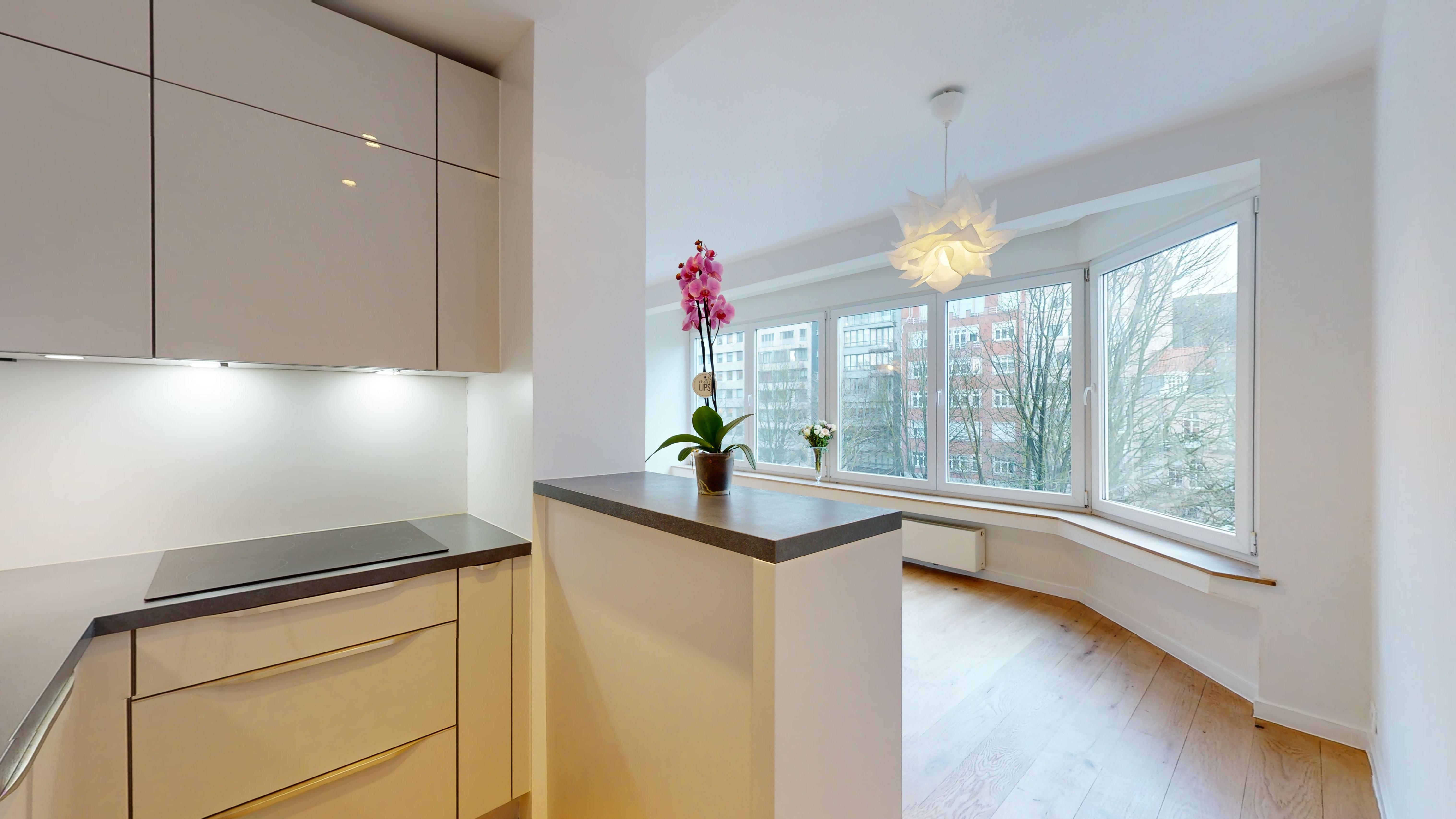 Dans un immeuble de charme, bien entretenu avec ascenseur, ce nid douillé d'une chambre avec placards intégrés est situé au troisième étage. Il a été entièrement rénové, avec de belles finitions (plancher massif, cuisine ouverte, nouvelle salle de bain) sur un séjour lumineux orienté Sud-Ouest. Deux places de parking (une avec cagibi) disponibles respectivement pour 23 000 et 25 000 euros supplémentaires. Composition : Hall d'entrée avec vestiaire et WC séparé avec lave-mains, Cuisine équipée ouverte sur le séjour, de +/-30m2. Salle de douche avec douche italienne, radiateur chauffant porte-serviettes et double vasque évier. Toutes les tuyauteries de l'immeuble ont été refaites récemment. Chaudière centrale au gaz à condensation. Divers : Électricité conforme, PEB : D. Charges : +/- €/mois (charges communes pour l'entretien des communs, syndic, ascenseur etc.).