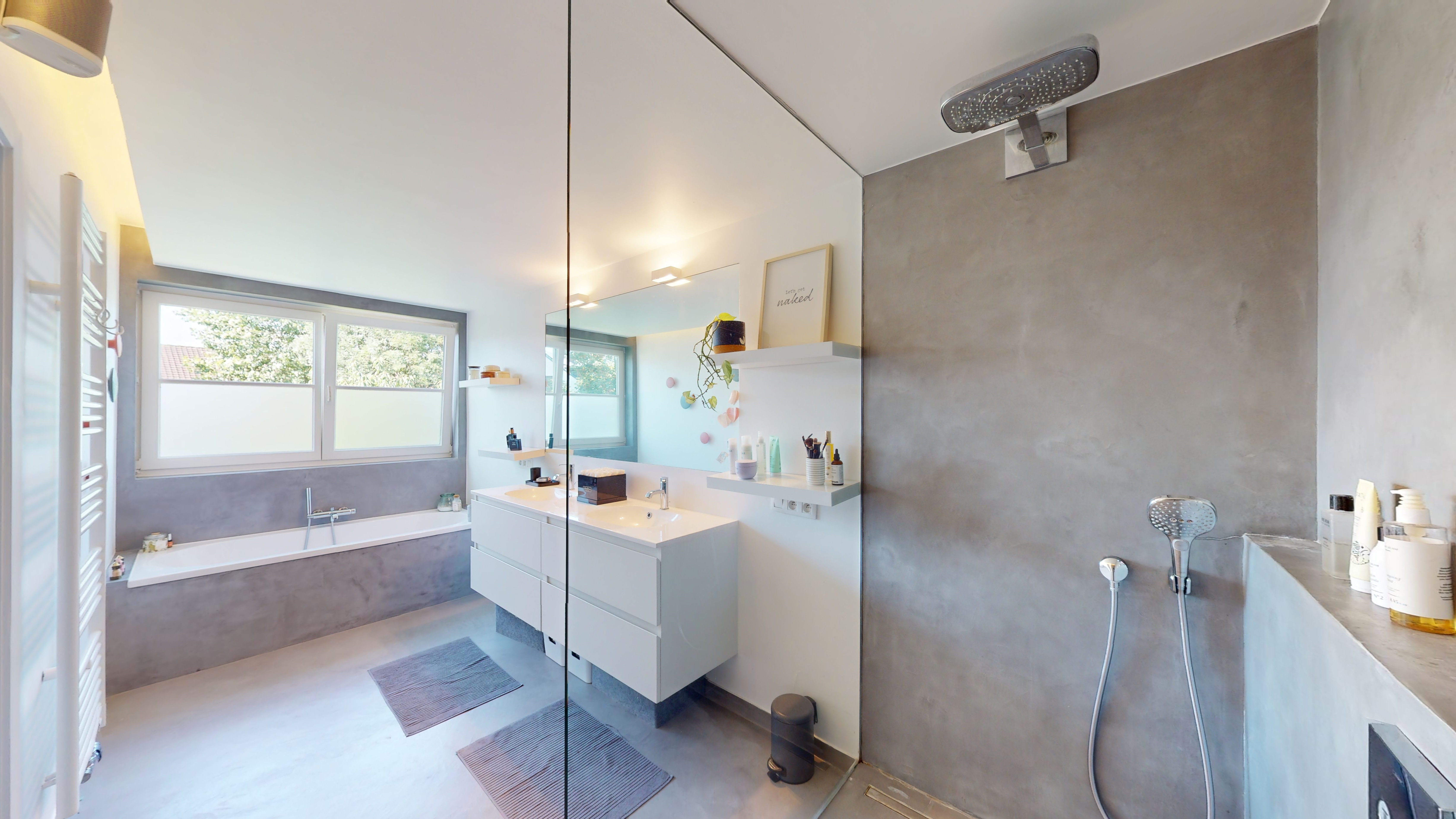La salle de bain parental en façade arrière au 1er étage présente quelques fissures et traces dans le mortex de revêtement du sol et des parois verticales.