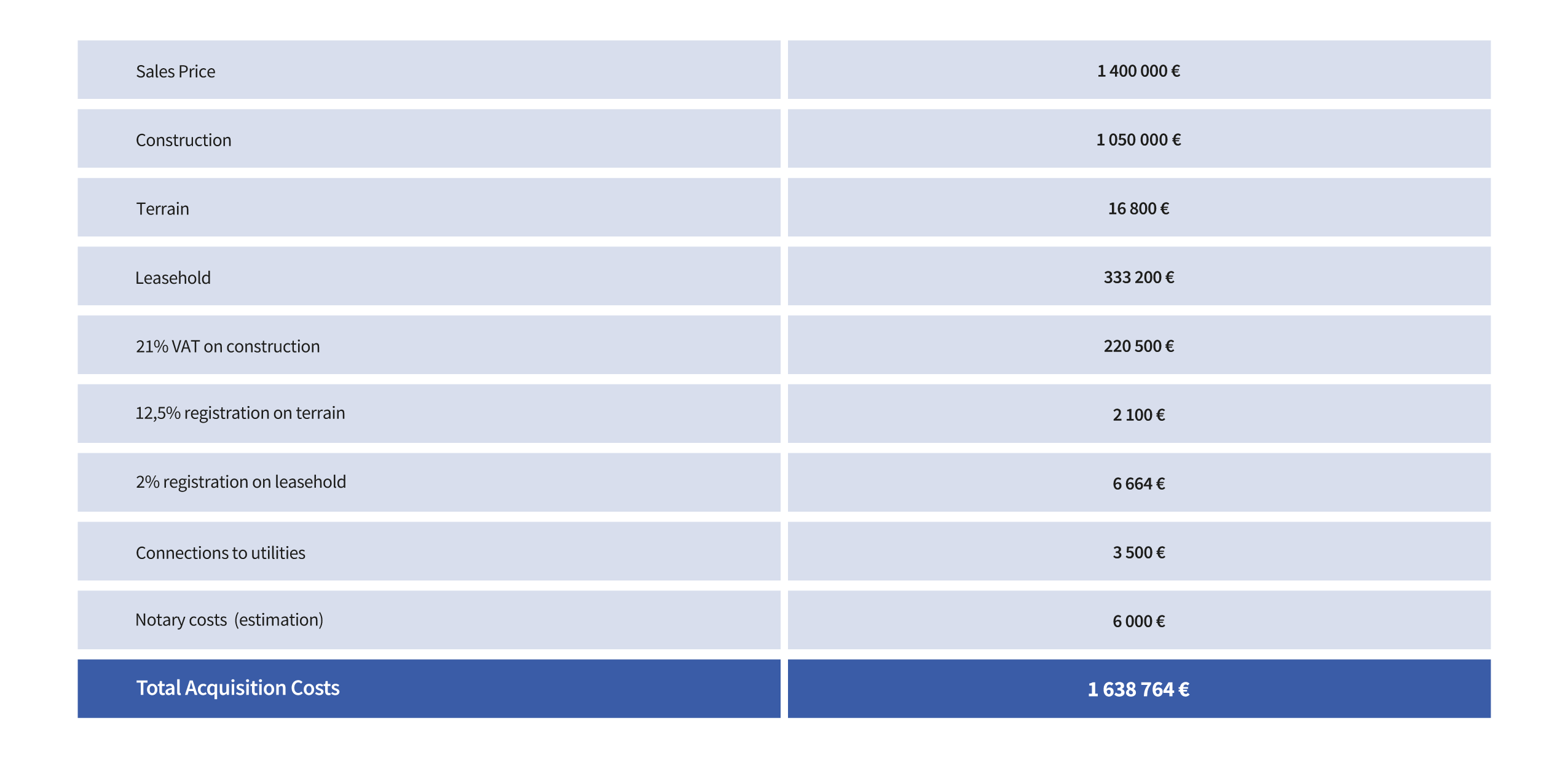 L’acquéreur paiera 21% de TVA pour la partie construction. Par contre, pour le terrain, il paiera des droits d’enregistrement de 12,5% uniquement sur la valeur du tréfonds et 2% sur la valeur de l’emphytéose.