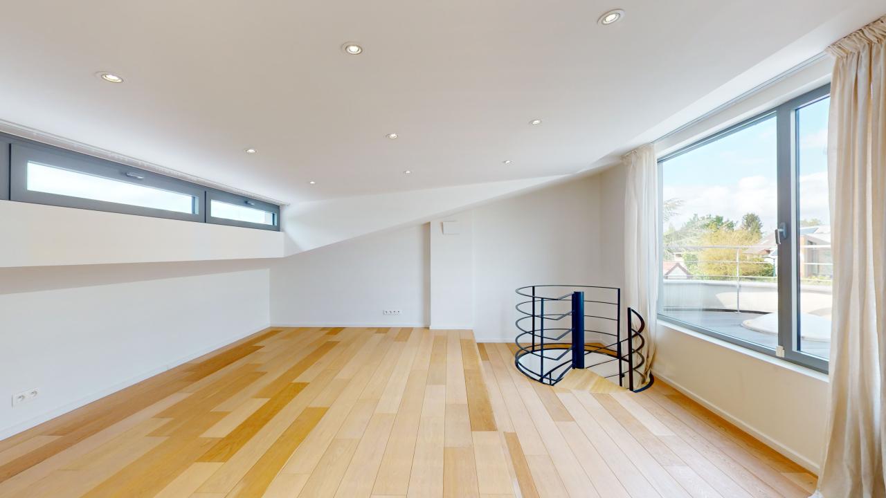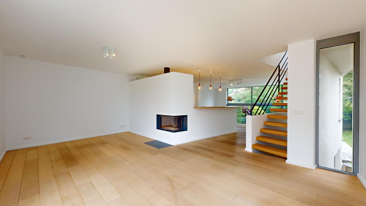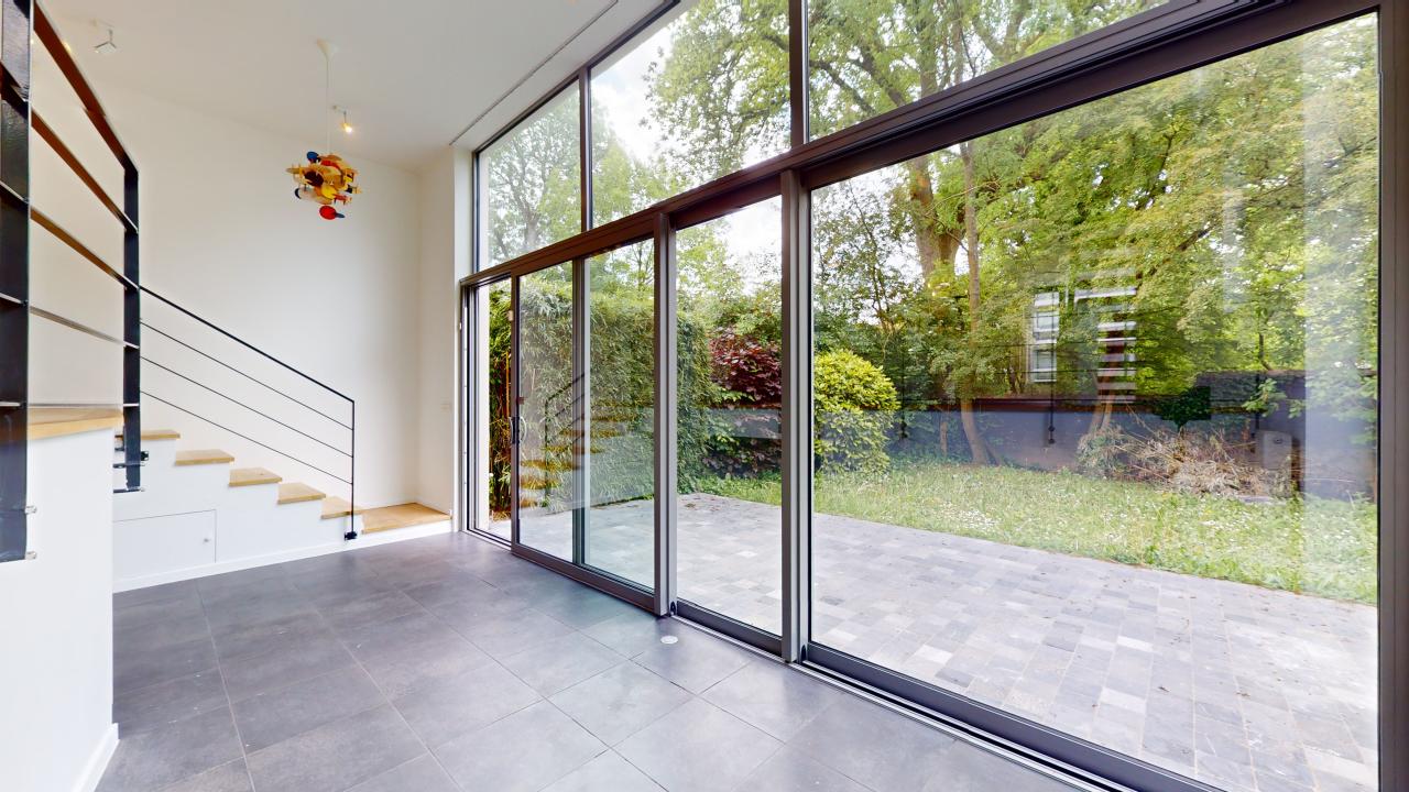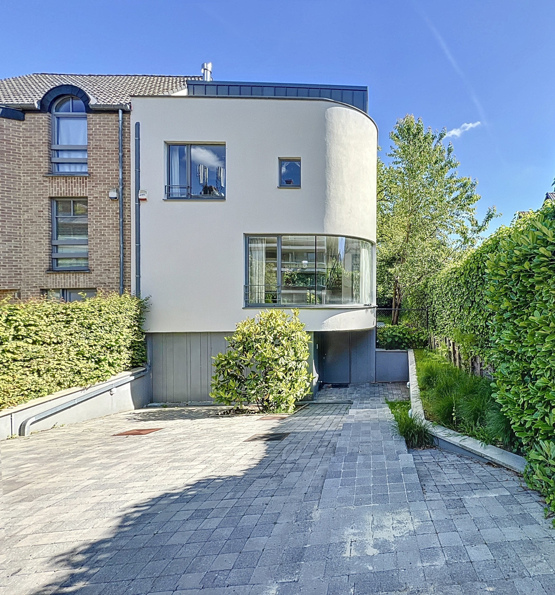 Belle maison d’architecte sise Drève Pittoresque à Uccle. Idéalement située à la lisière de la forêt de Soignes, aux frontières de Bruxelles et Rhode-Saint-Genèse. En devanture, 2 places de voiture 'en pente' vers le garage (pote électrique). La maison se compose comme suit : Au RDC, hall d’entrée donnant accès au garage, escalier vers les caves, espace chambre avec salle de douche – Au 1er étage (Niveau jardin) : Sur 2 niveaux un grand espace de +/- 60m² avec cuisine américaine de +/- 10m², salon avec feu ouvert, salle à manger et escalier descendant vers un espace récréatif de +/-15m² avec des grandes baies vitrées donnant sur la terrasse extérieur et le jardin de +/- 1a50 - Au 2ème étage : Hall de +/- 13m² donnant accès à deux chambres (+/- 16m² et +/- 13m²), 1 salle de bain avec double évier (+/- 8m²), 1 toilette et 1 terrasse sud de +/- 10m² - Au 3ème étage : Grande pièce à vivre de +/- 25m² sur 2 niveau pouvant faire office de buanderie, salle de jeu. Ventilation double flux. Au sous-sol : 3 espaces de cave et espace technique avec chaudière murale Vaillant et adoucisseur d’eau