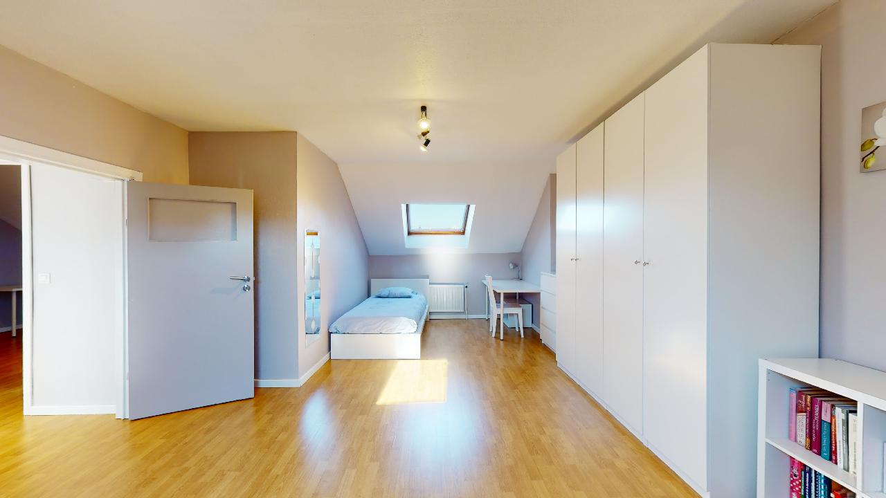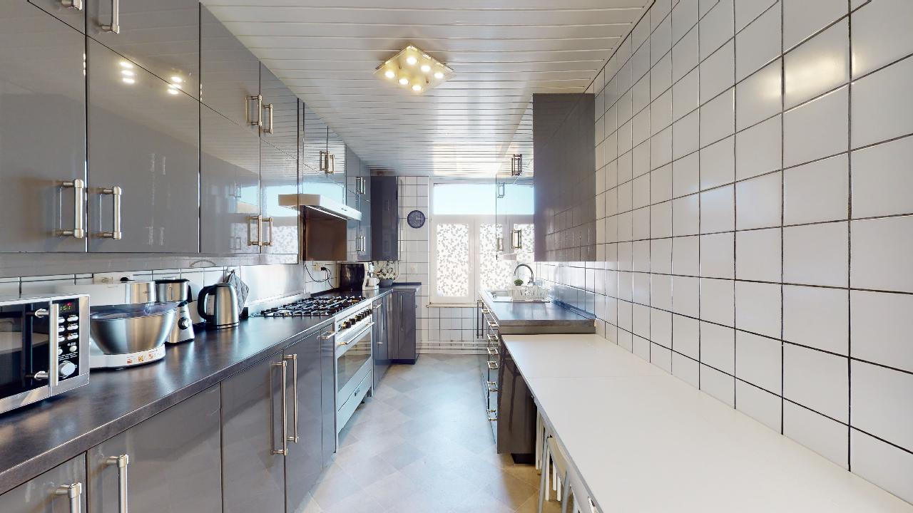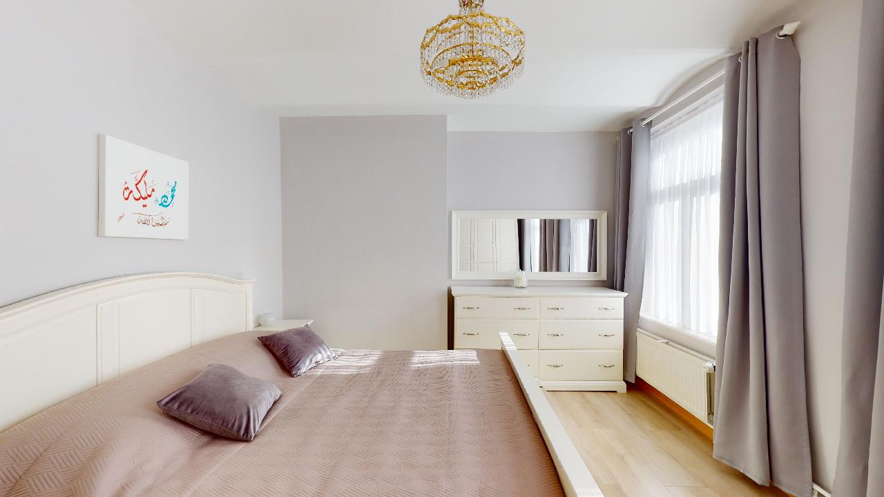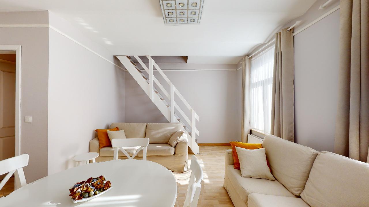 Superbe duplex de 5 chambres situé au 3e et 4e étage sans ascenseur. L'appartement se compose comme suit : Couloir desservant 2 chambres, le salon/salle à manger, la cuisine équipée et la salle de douche avec wc. A l'étage, 3 chambres. Le duplex se trouve dans une petite copropriété.