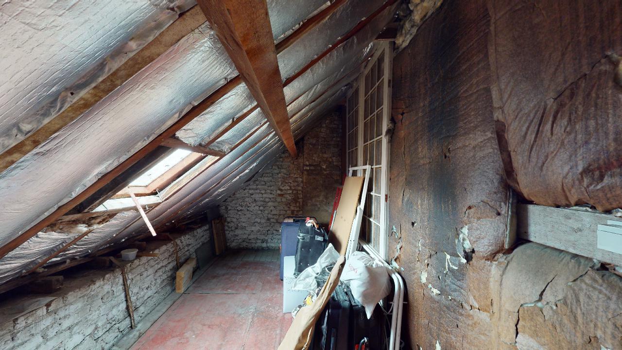 Petites traces d'humidité visible dans le grenier. On voit le jour - façade avant partie droite (gauche de la pièce)