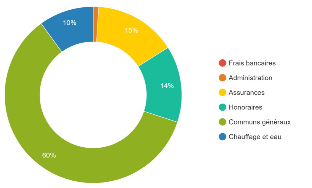 Ce tableau des charges comprend : Communs généraux, chauffage et eau, honoraires, administration, assurances et frais bancaires.
