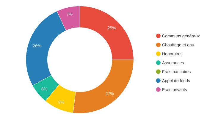 Ce tableau des charges comprend : Communs généraux – Chauffage et eau - honoraires - Assurances – frais bancaires - Appels de fonds et privatifs