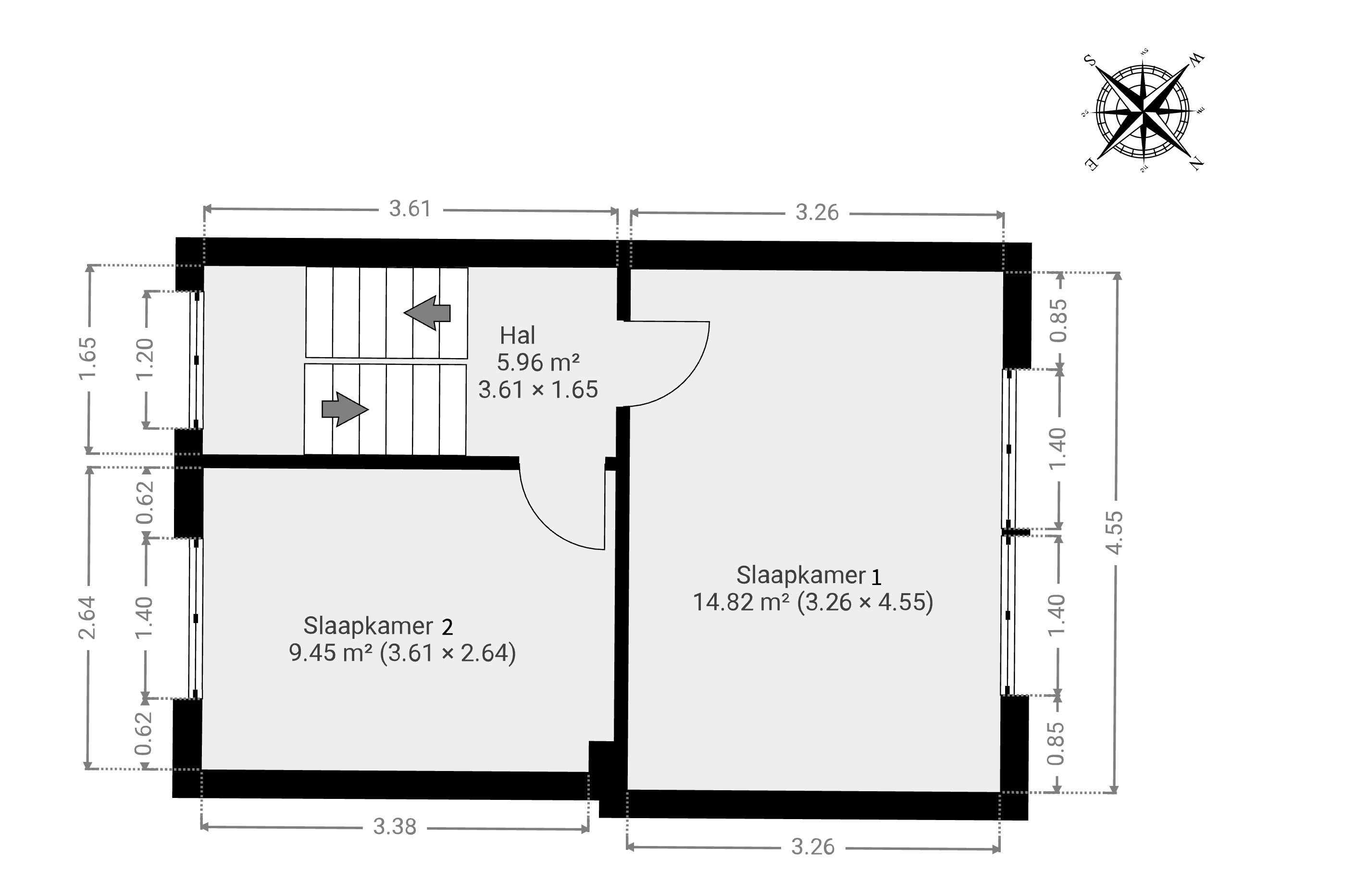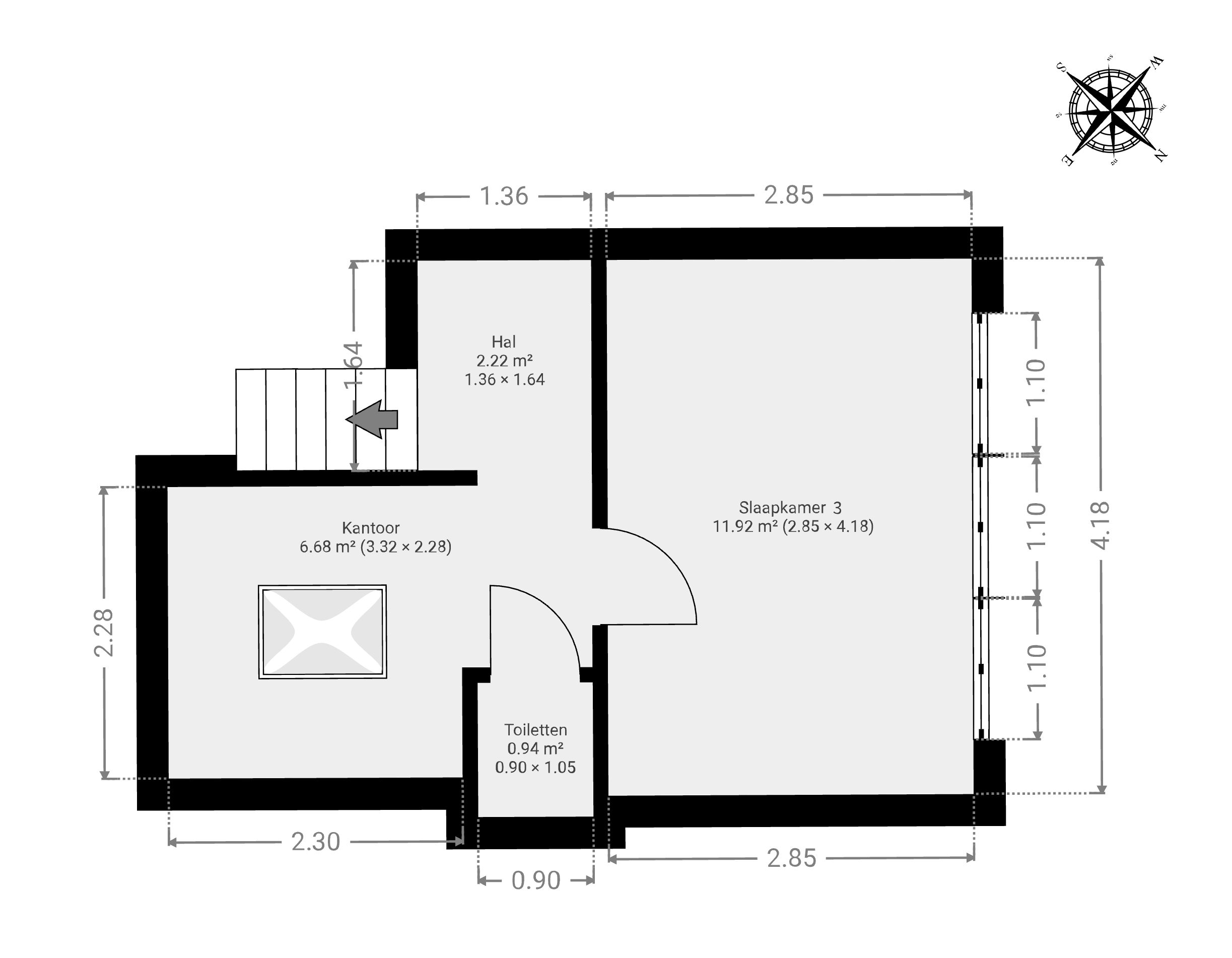 De totale oppervlakte is de som van de interne oppervlakte (d.w.z. berekend vanaf de binnenkant van de buitenmuren) en de externe oppervlakken (balkons, terreinen, tuinen, enz.).