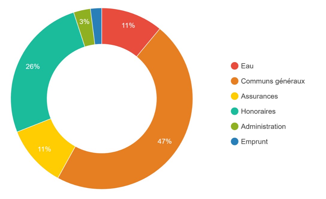 Ce tableau des charges comprend : Eau, communs généraux, assurances, honoraires, administration et emprunt.