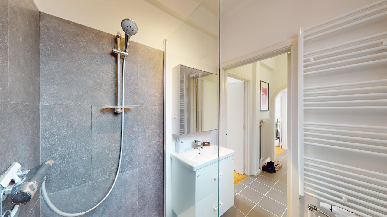 Appartement traversant et rénové récemment, situé dans le haut de Schaerbeek et proche de la Commission Européenne. Constitué d'une chambre, cet appartement situé au 1er étage et est composé comme suit: Le hall d'entrée donne accès à un séjour lumineux avec parquet, la cuisine équipée et le WC. Un hall de nuit conduit à la salle de douche (douche à l'italienne) aménagée d'un évier et d'un chauffage mural pour serviette. Dans la pièce d'à côté nous retrouvons la chambre de l'appartement équipé de nombreux placards de rangements le long du mûr. Une cave privative reliée à l'eau se situe au rez-de-chaussée et est utilisée comme buanderie. Charges communes minimes, PEB E, électricité conforme. Mobilité : Nombreuses lignes de bus SNCB, station Pré Metro DIAMANT et nombreux commerces à proximité directe.