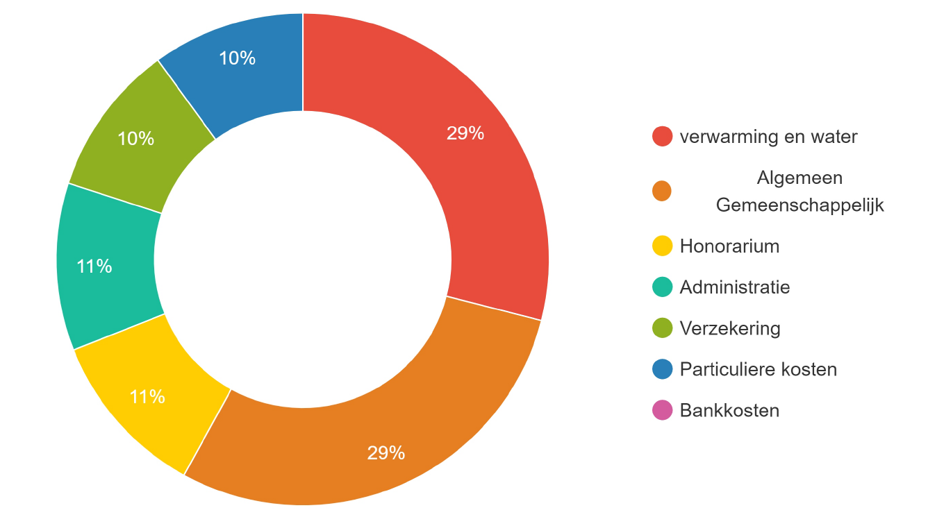 Deze tabel met onkosten omvat : Algemene kosken, water, vergoedingen, administratie, verzekeringen, diverse uitgaven, bankkosten et financeële lasten.