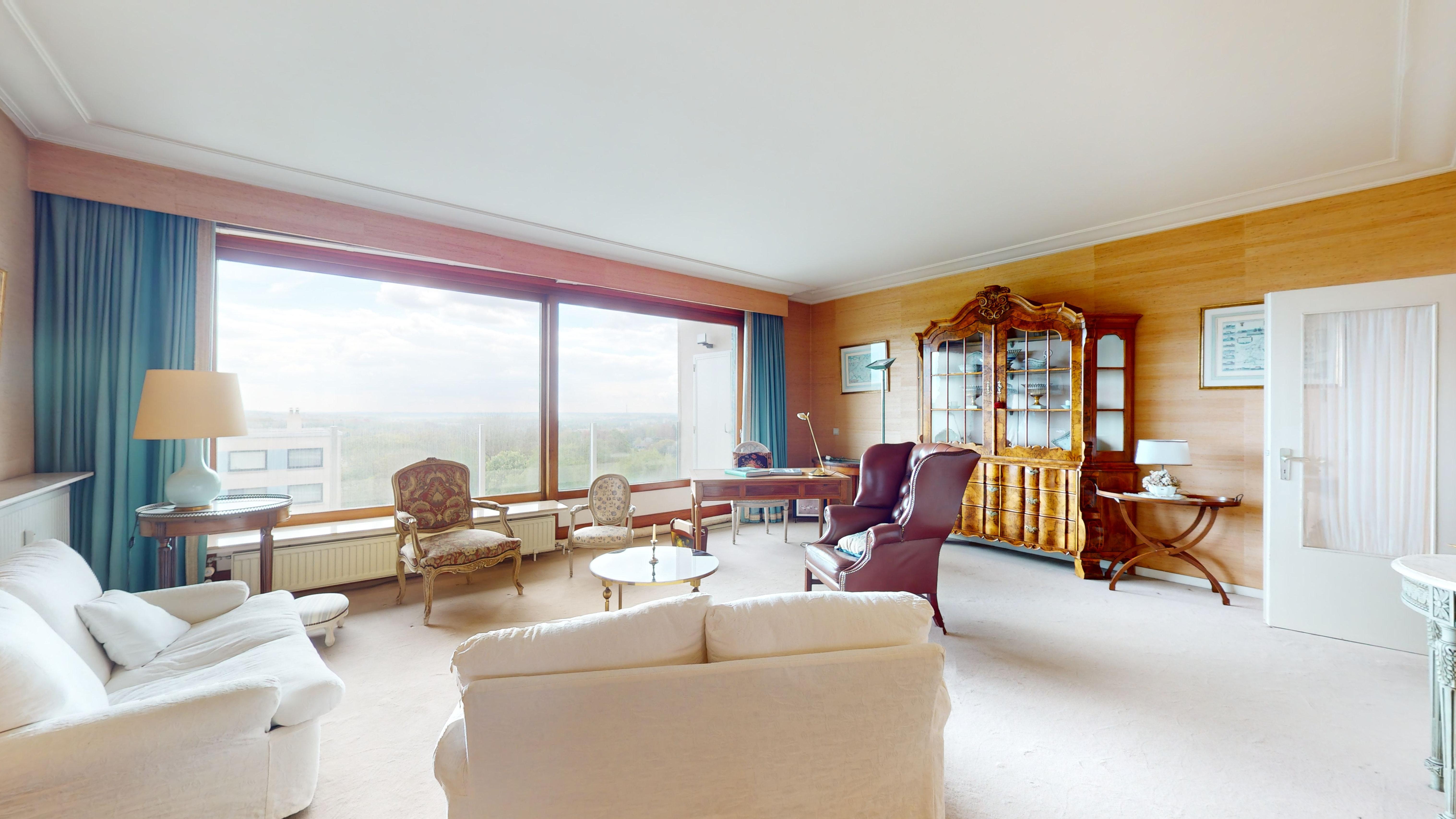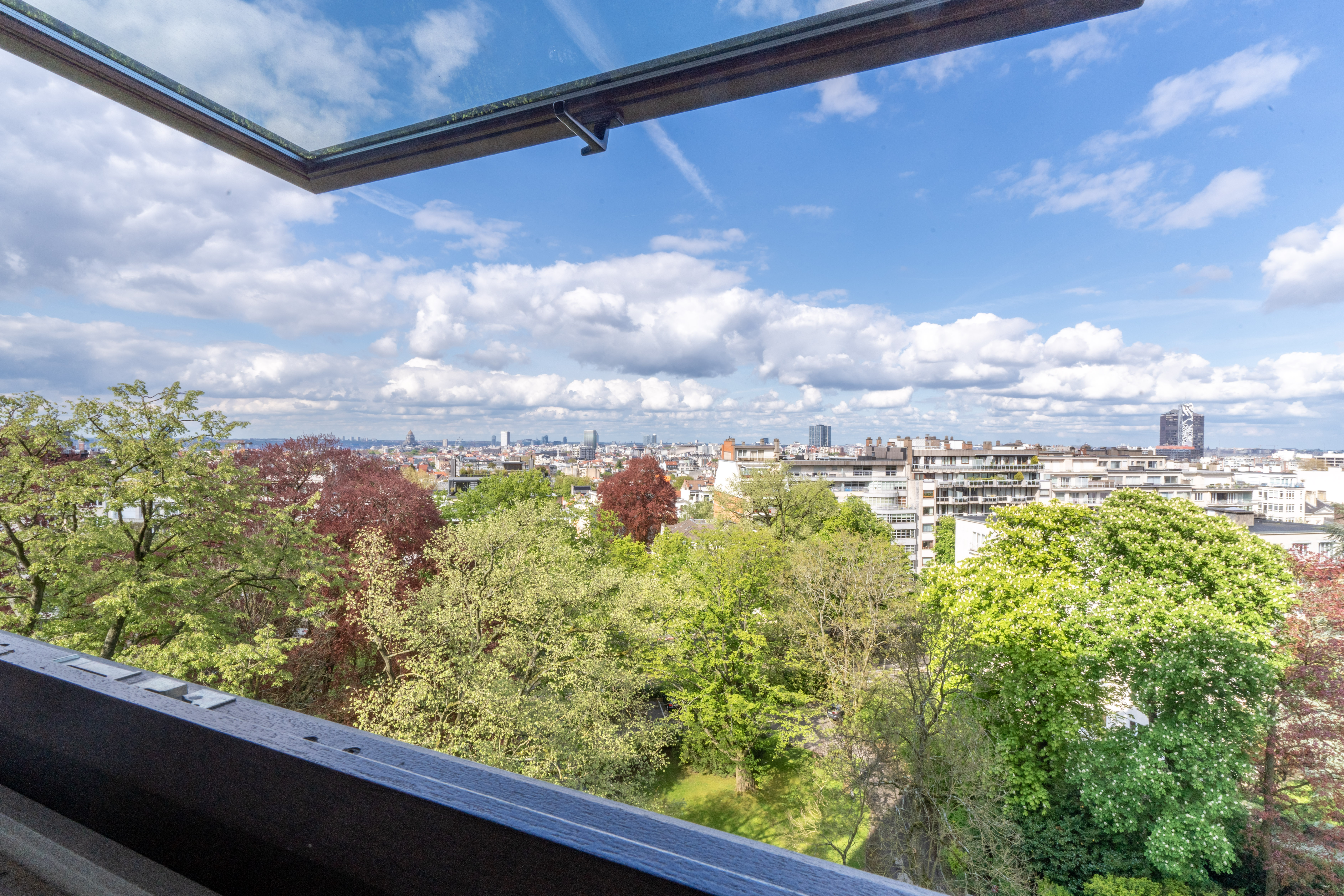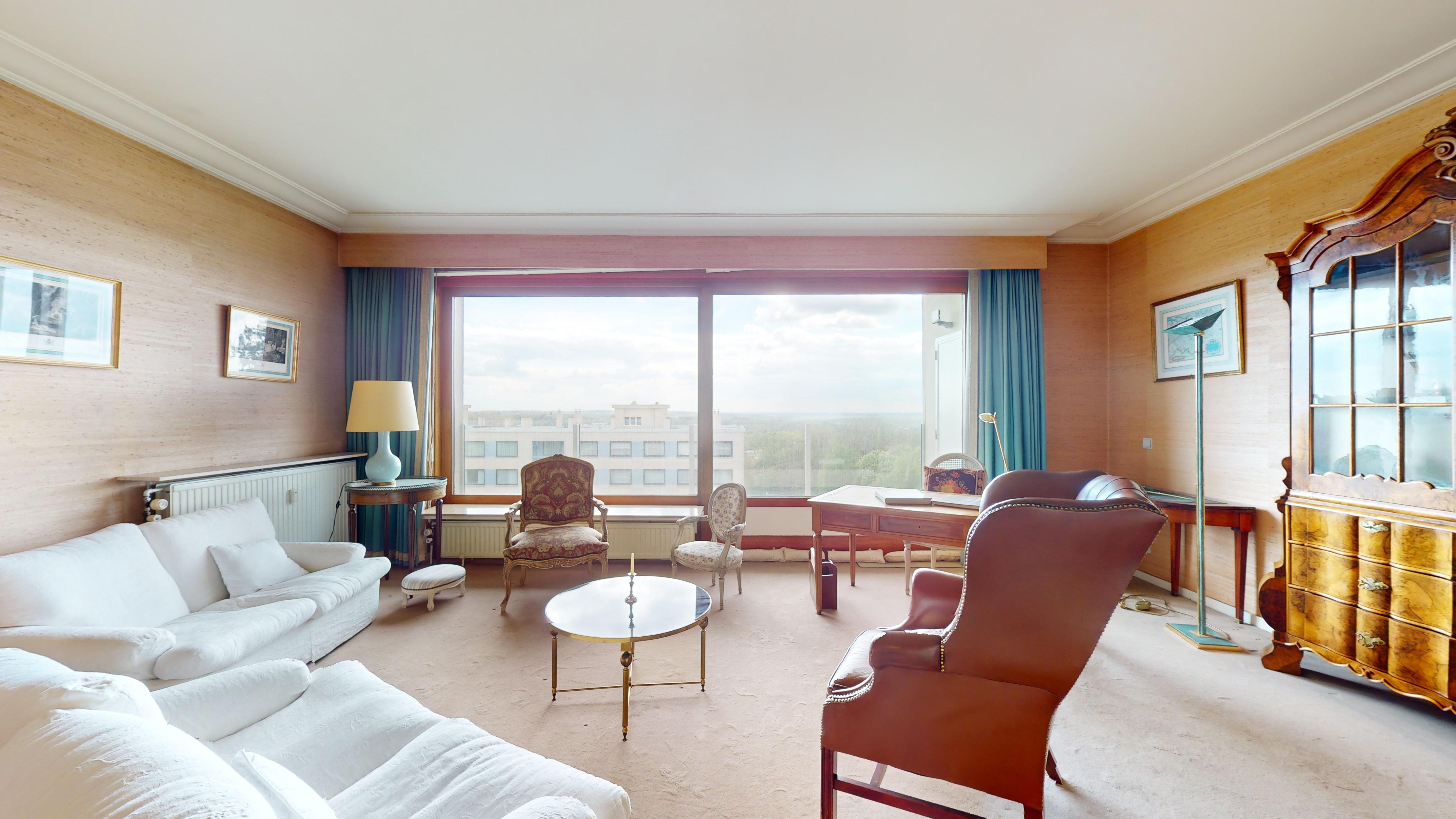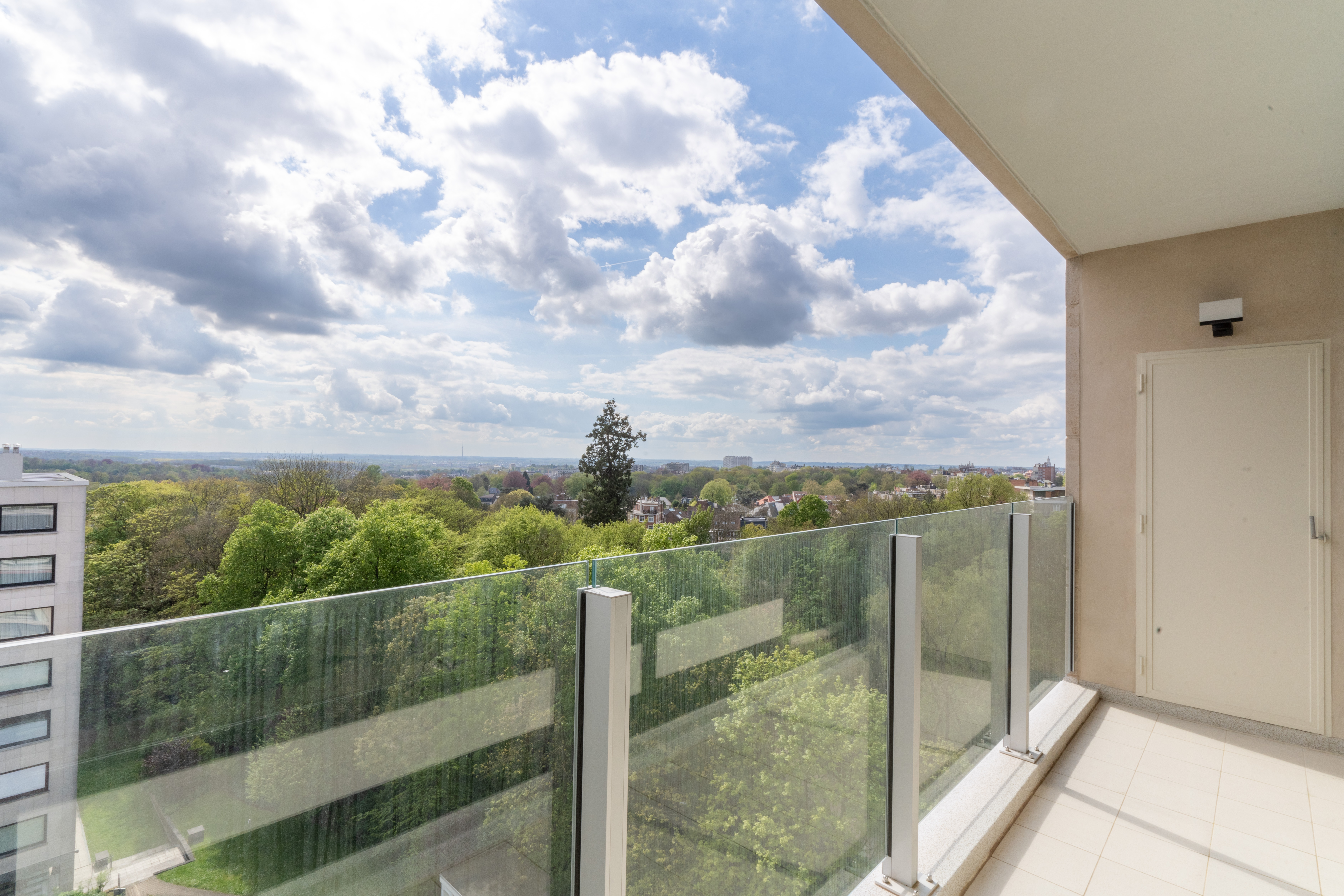 Hall d'entrée donnant accès à un lumineux et spacieux séjour de +/- 42,3 m2 pourvus de grandes baies vitrées, qui donnent accès à une belle terrasse de +/- 7,7m2 (+ un espace de rangement de 1m2), orientée au sud. Depuis le salon, nous retrouvons un hall avec des espaces de rangement de 2,5 m2 donnant sur la cuisine de +/- 10,5m2. Cette cuisine donne sur accès à un petit balcon couvert de 4m2. Le hall d'entrée donne aussi sur un hall de nuit de 3,8 m2 avec un accès à petit coin bibliothèque et un WC séparé. Sas pour passer directement au hall entre la cuisine et le salon. Le hall de nuit donne sur une belle chambre de +/- 22m2 (avec un grande fenêtre permettant d'avoir une belle vue sur Bruxelles) avec sa salle de bain. Un garage fermé est disponible (+45.000 €). Châssis double vitrage. Chaudière collective au gaz. PEB : C-. Disponible rapidement. Cet appartement bénéficie d’un emplacement privilégié est à découvrir sans tarder !