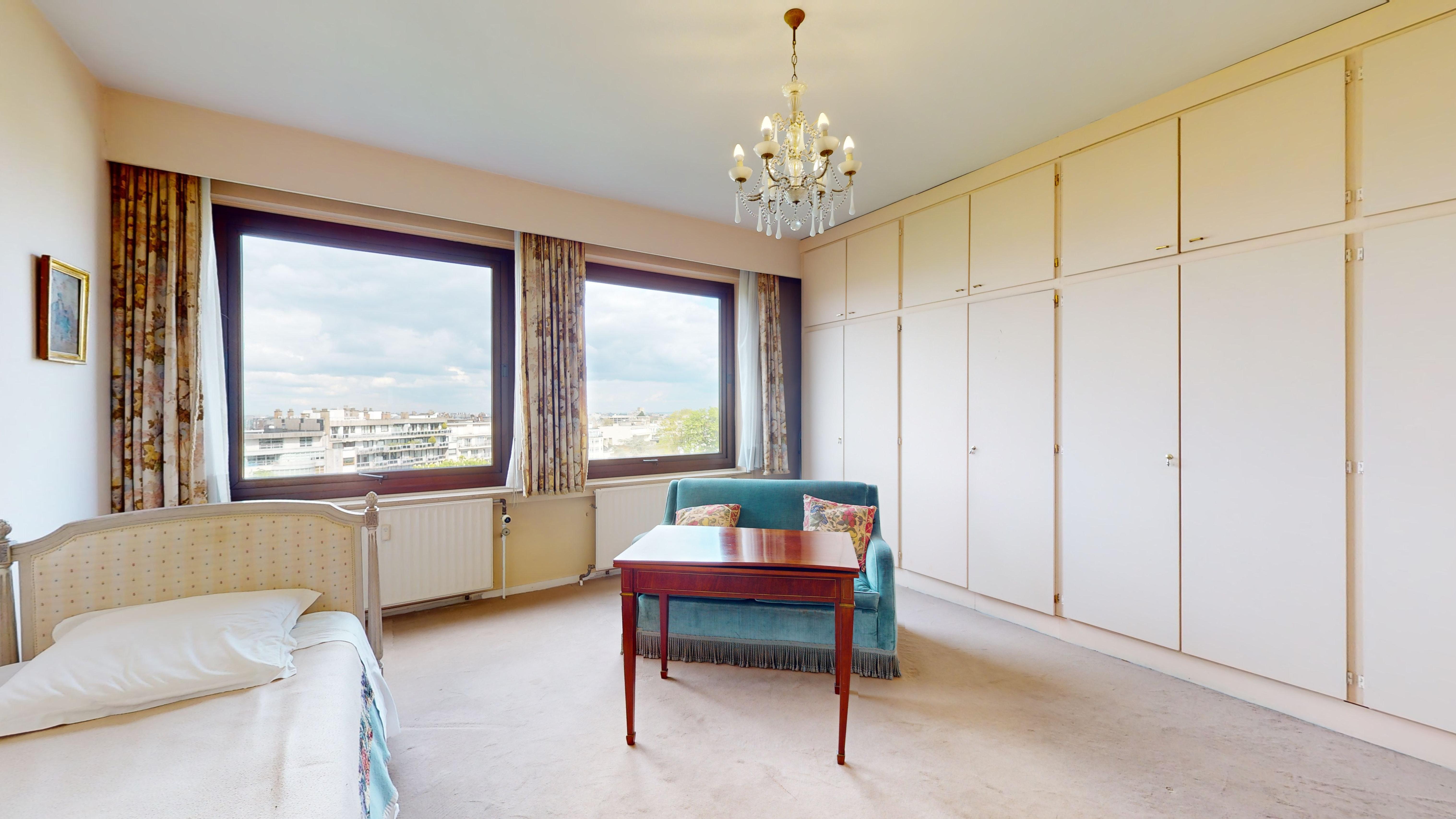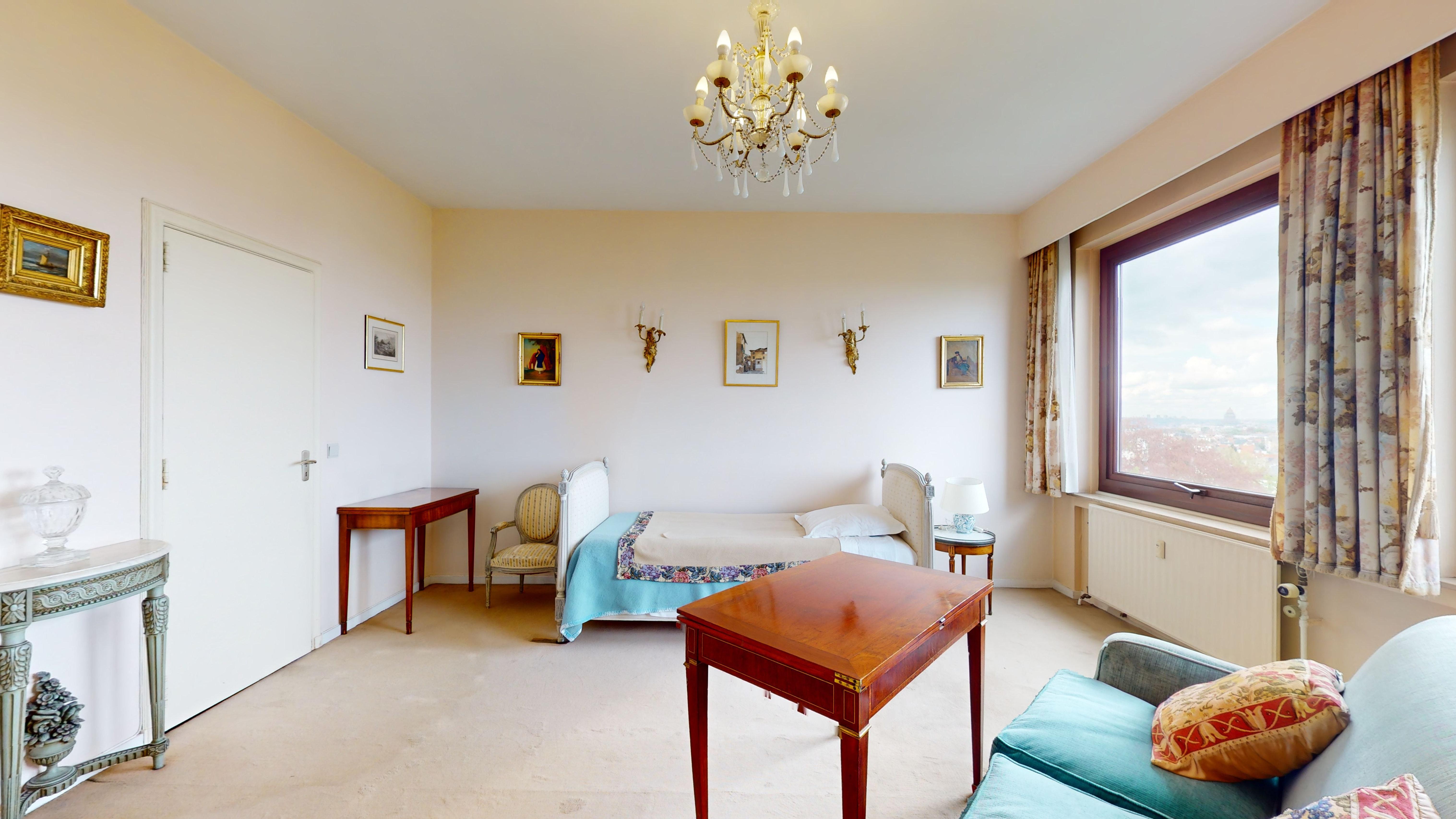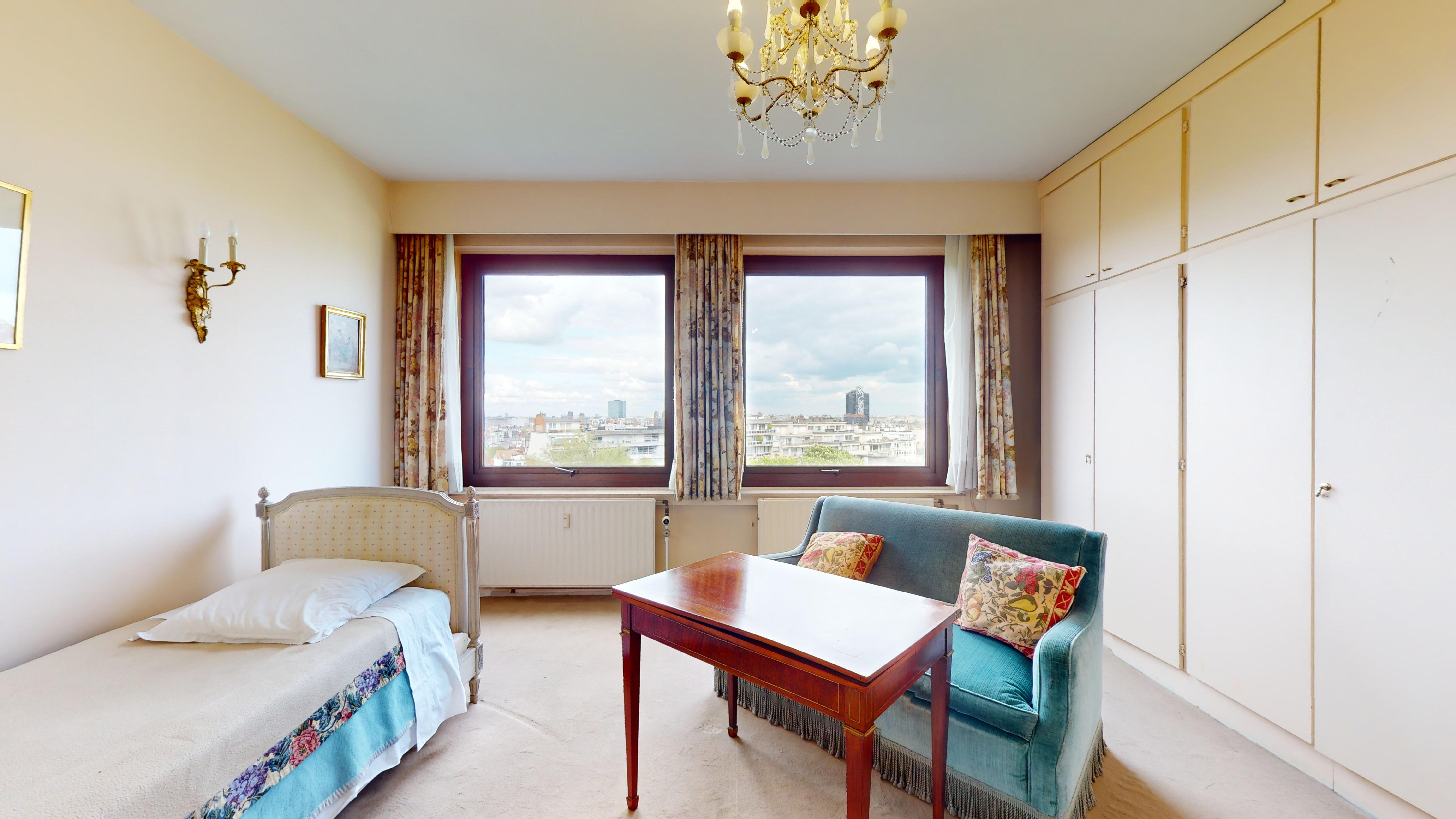 Hall d'entrée donnant accès à un lumineux et spacieux séjour de +/- 42,3 m2 pourvus de grandes baies vitrées, qui donnent accès à une belle terrasse de +/- 7,7m2 (+ un espace de rangement de 1m2), orientée au sud. Depuis le salon, nous retrouvons un hall avec des espaces de rangement de 2,5 m2 donnant sur la cuisine de +/- 10,5m2. Cette cuisine donne sur accès à un petit balcon couvert de 4m2. Le hall d'entrée donne aussi sur un hall de nuit de 3,8 m2 avec un accès à petit coin bibliothèque et un WC séparé. Sas pour passer directement au hall entre la cuisine et le salon. Le hall de nuit donne sur une belle chambre de +/- 22m2 (avec un grande fenêtre permettant d'avoir une belle vue sur Bruxelles) avec sa salle de bain. Un garage fermé est disponible (+45.000 €). Châssis double vitrage. Chaudière collective au gaz. PEB : C-. Disponible rapidement. Cet appartement bénéficie d’un emplacement privilégié est à découvrir sans tarder !