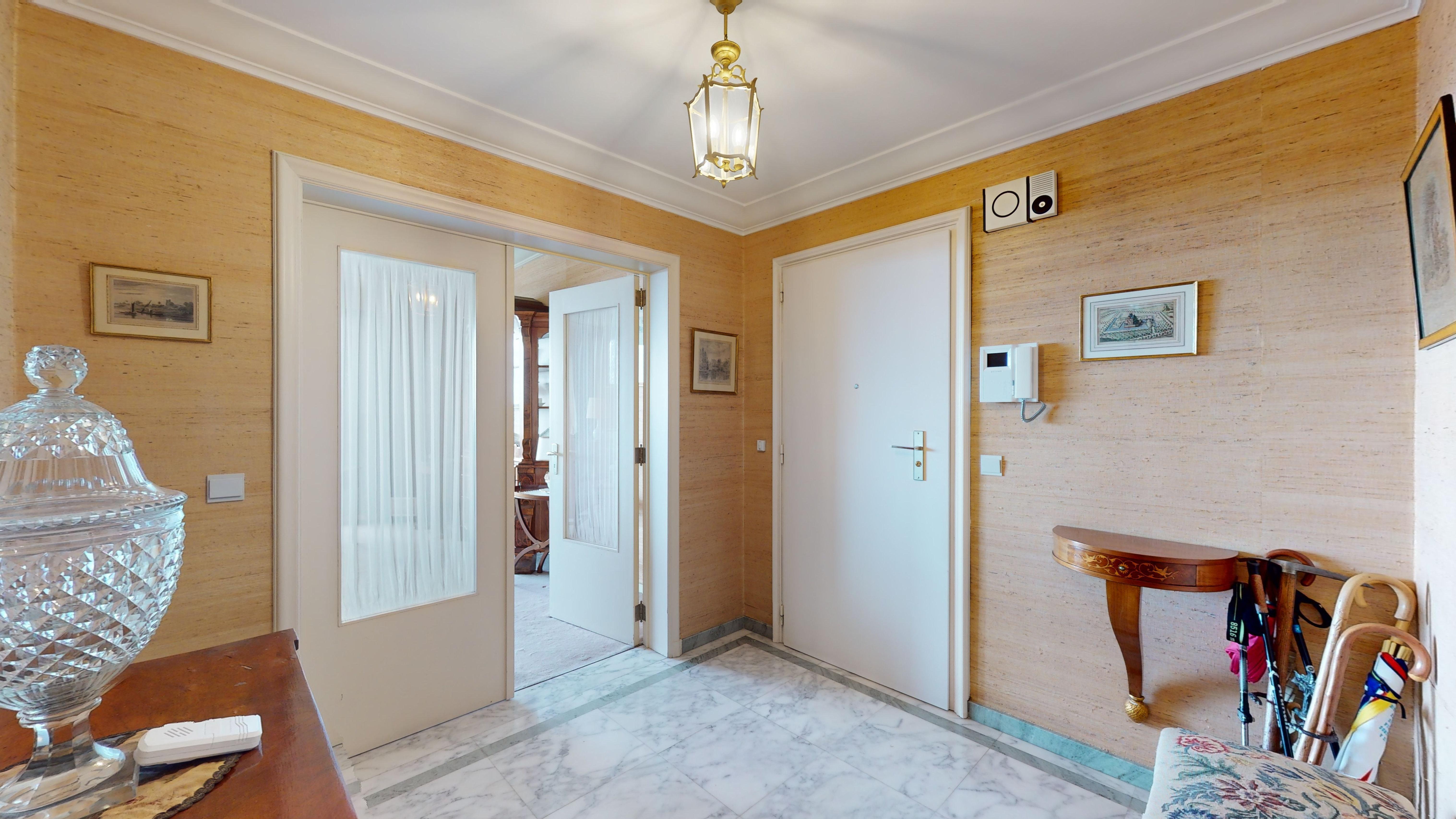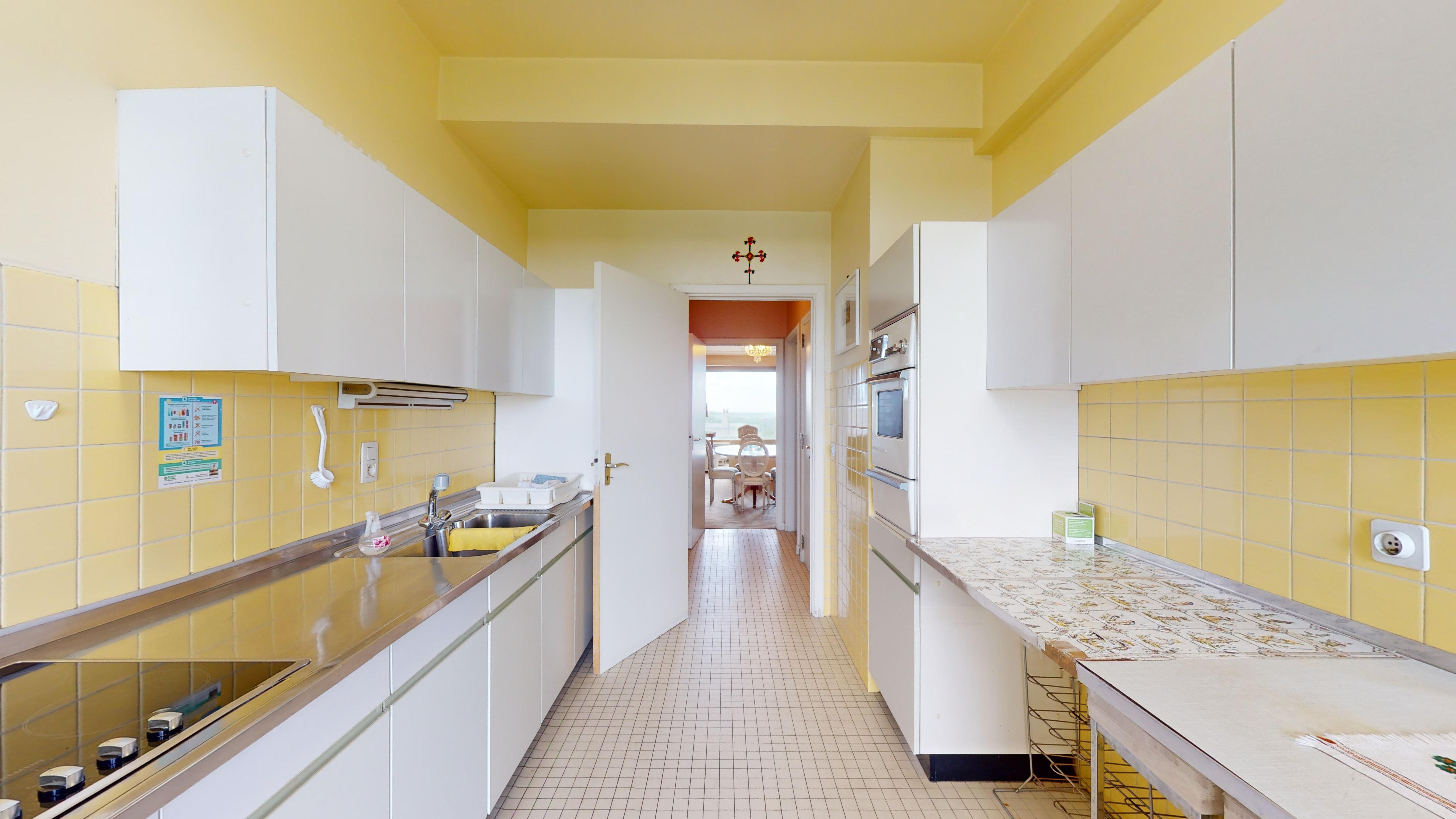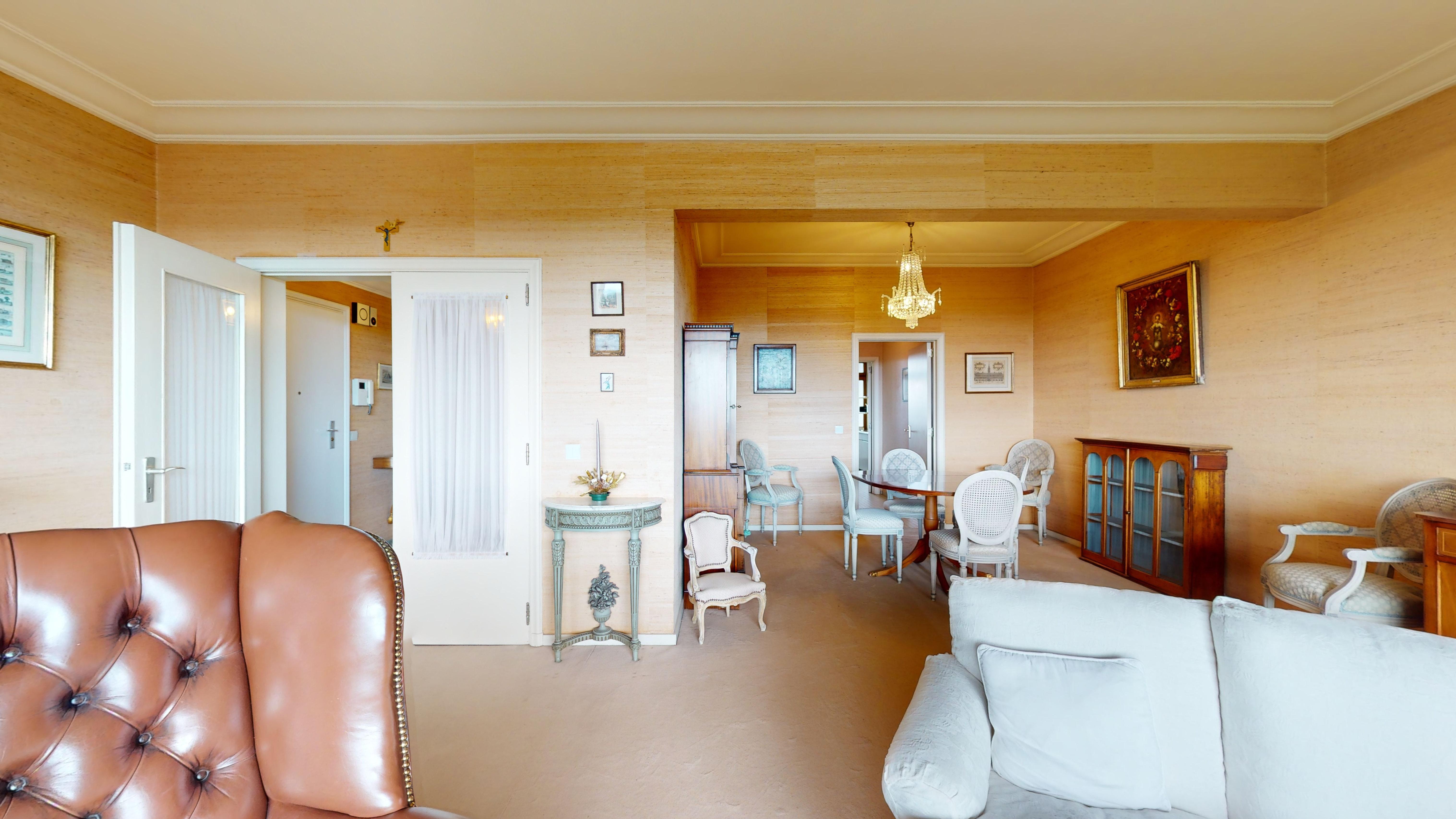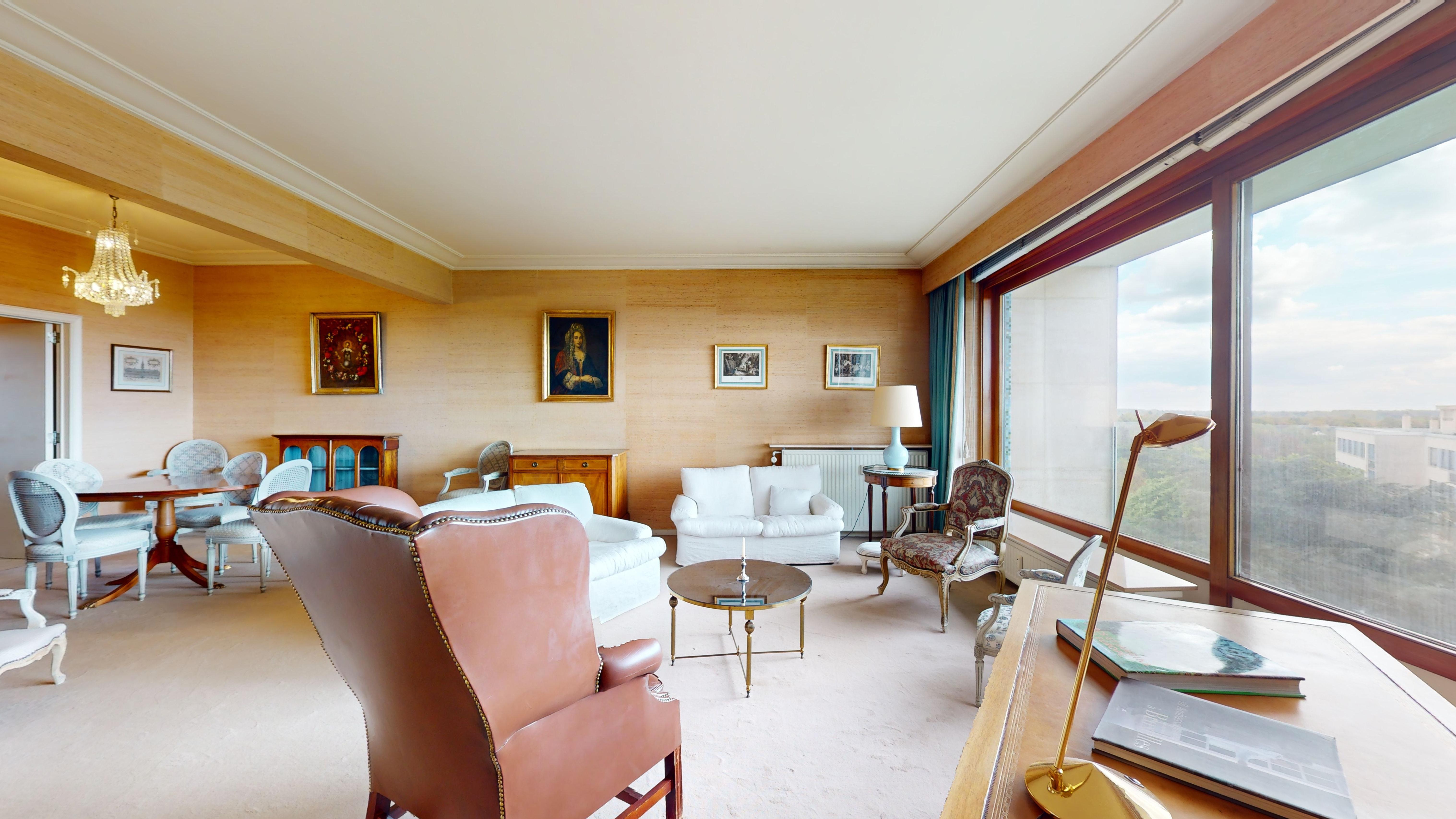 Hall d'entrée donnant accès à un lumineux et spacieux séjour de +/- 42,3 m2 pourvus de grandes baies vitrées, qui donnent accès à une belle terrasse de +/- 7,7m2 (+ un espace de rangement de 1m2), orientée au sud. Depuis le salon, nous retrouvons un hall avec des espaces de rangement de 2,5 m2 donnant sur la cuisine de +/- 10,5m2. Cette cuisine donne sur accès à un petit balcon couvert de 4m2. Le hall d'entrée donne aussi sur un hall de nuit de 3,8 m2 avec un accès à petit coin bibliothèque et un WC séparé. Sas pour passer directement au hall entre la cuisine et le salon. Le hall de nuit donne sur une belle chambre de +/- 22m2 (avec un grande fenêtre permettant d'avoir une belle vue sur Bruxelles) avec sa salle de bain. Un garage fermé est disponible (+45.000 €). Châssis double vitrage. Chaudière collective au gaz. PEB : C-. Disponible rapidement. Cet appartement bénéficie d’un emplacement privilégié est à découvrir sans tarder !